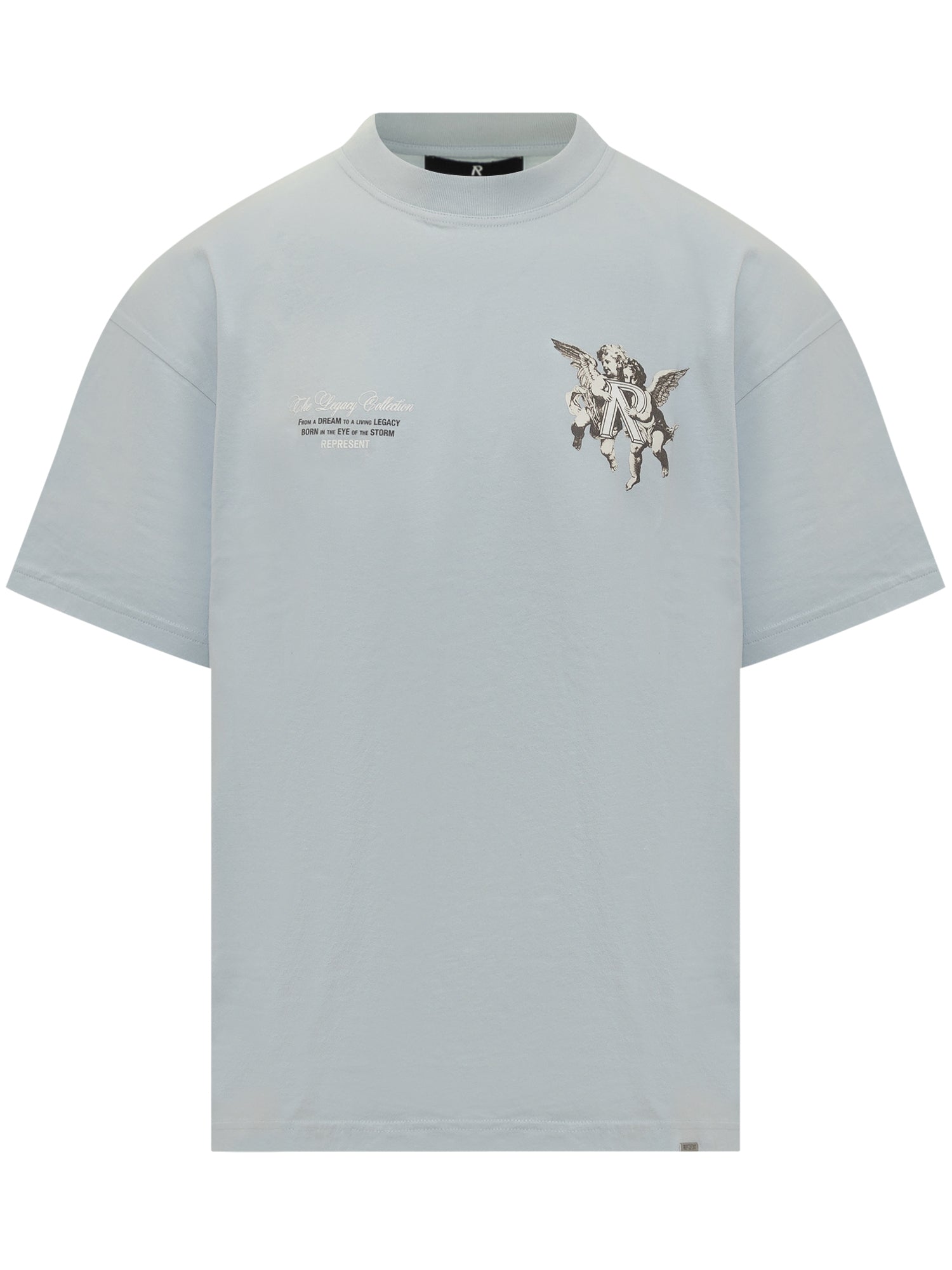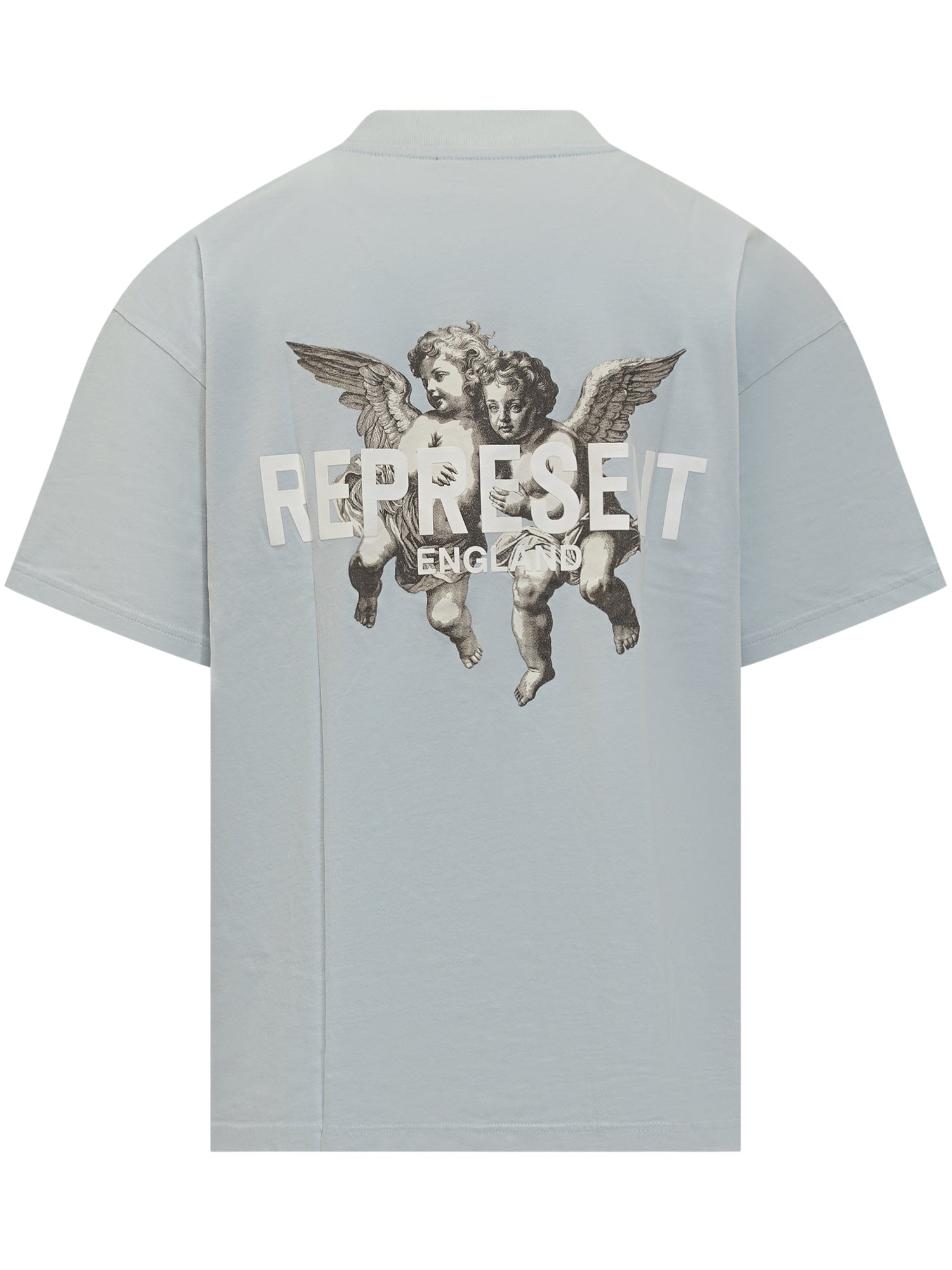 Light blue cotton T-shirt with cherub graphic and logo on chest.