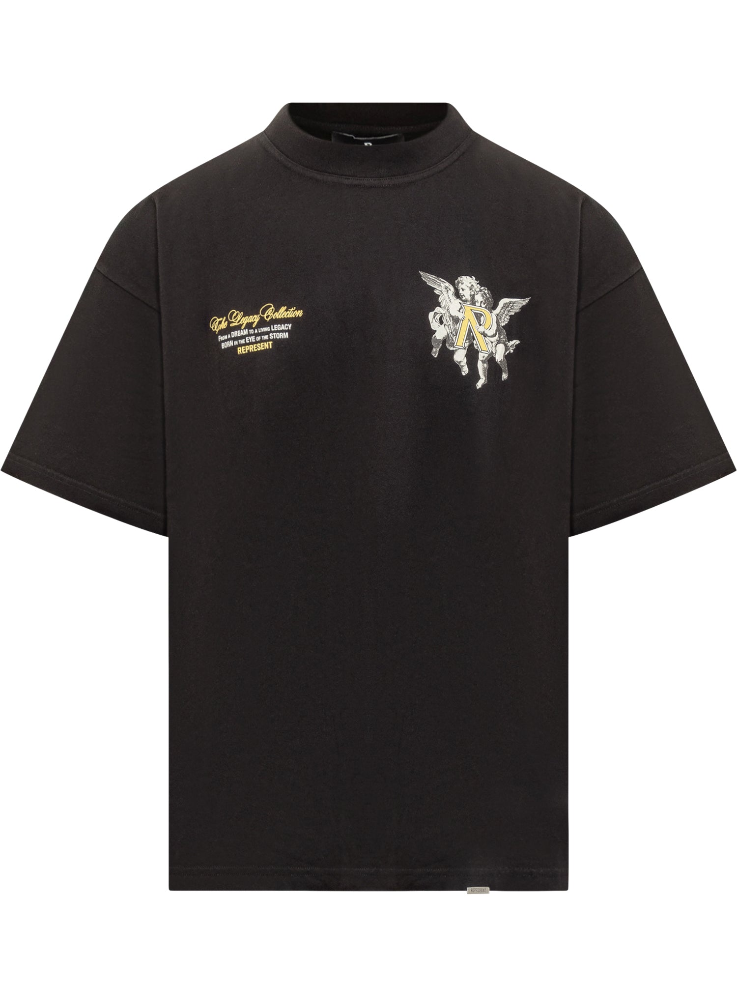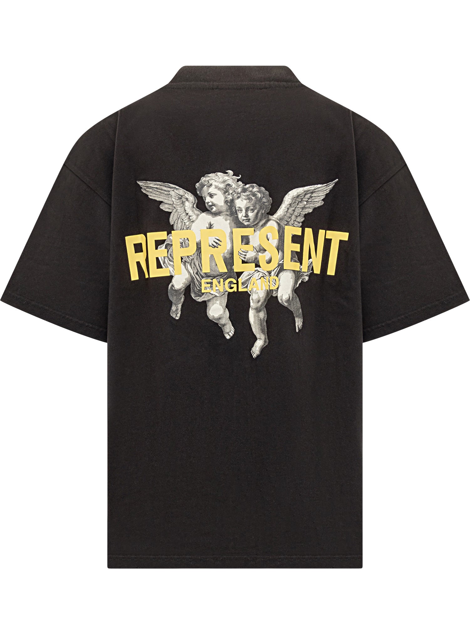 Black cotton T-shirt with cherub print and chest logo. Modern cut and relaxed fit.