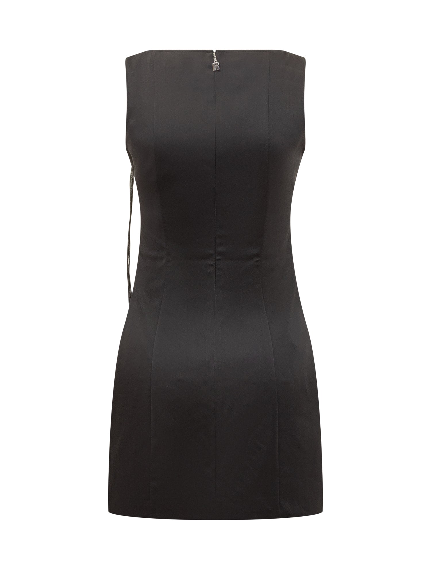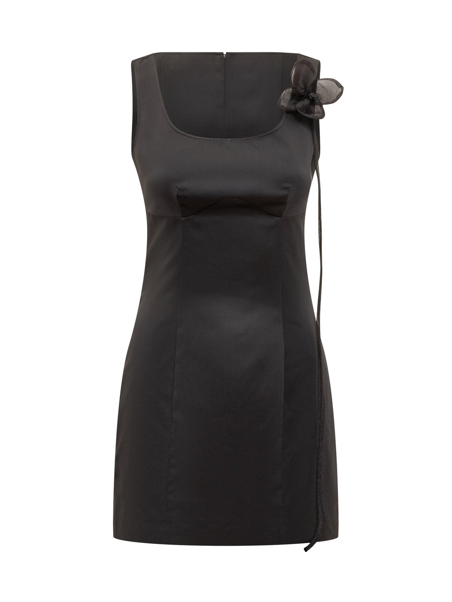 Black short dress. Sleeveless. Sheath dress design. Zipper closure. Satin flower on the shoulder strap.