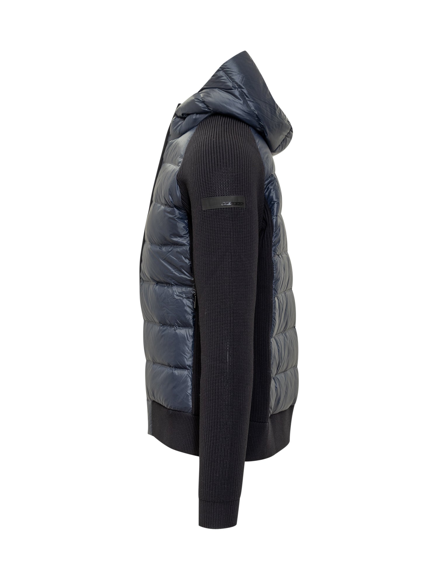 Hooded down jacket with high collar. Zipper closure. Ribbed hems. Two pockets.