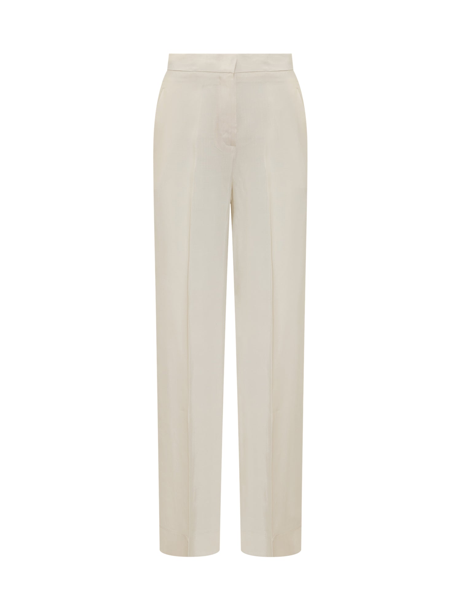 Long pants with wide leg. Zipper and hook-and-eye closure. Two side pockets. One welt pocket at back. Ironed pleat. Tartan plaid pattern.