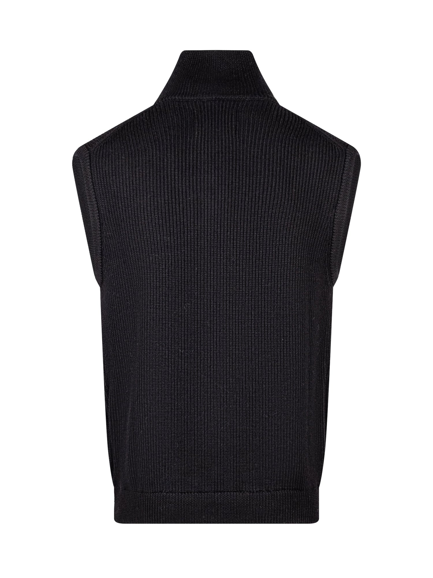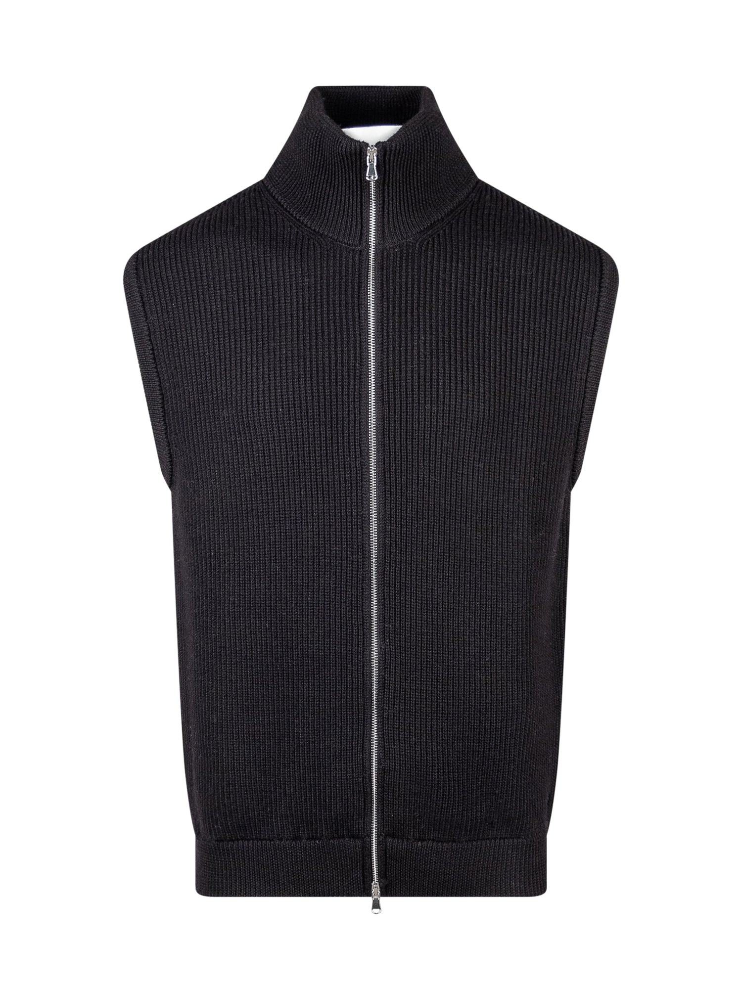Sleeveless vest with high collar. Zipper closure. Ribbed hems.