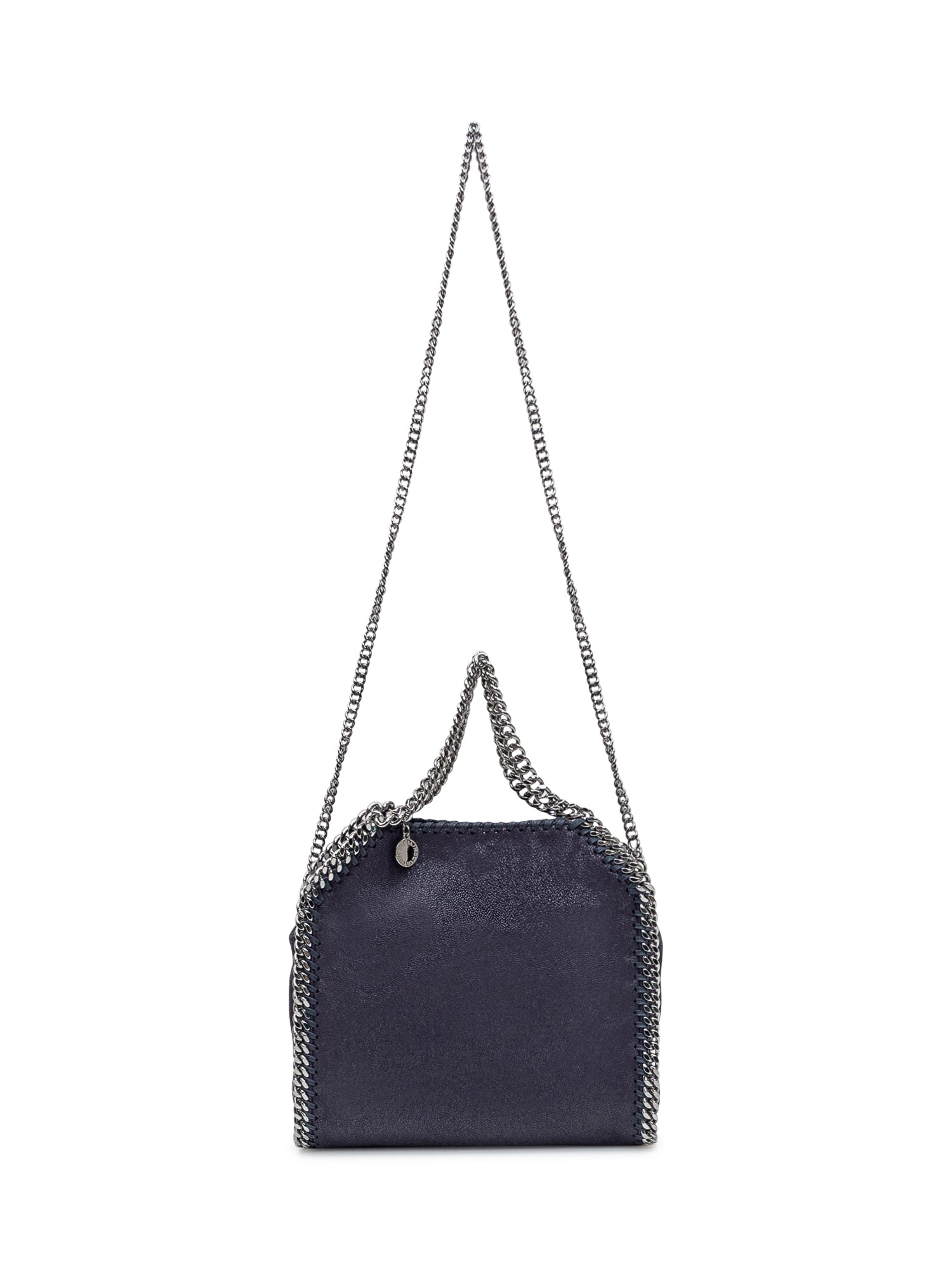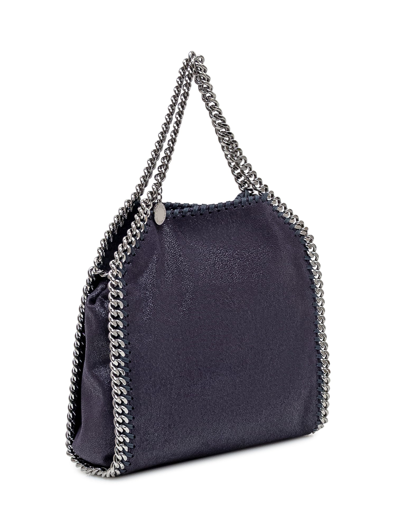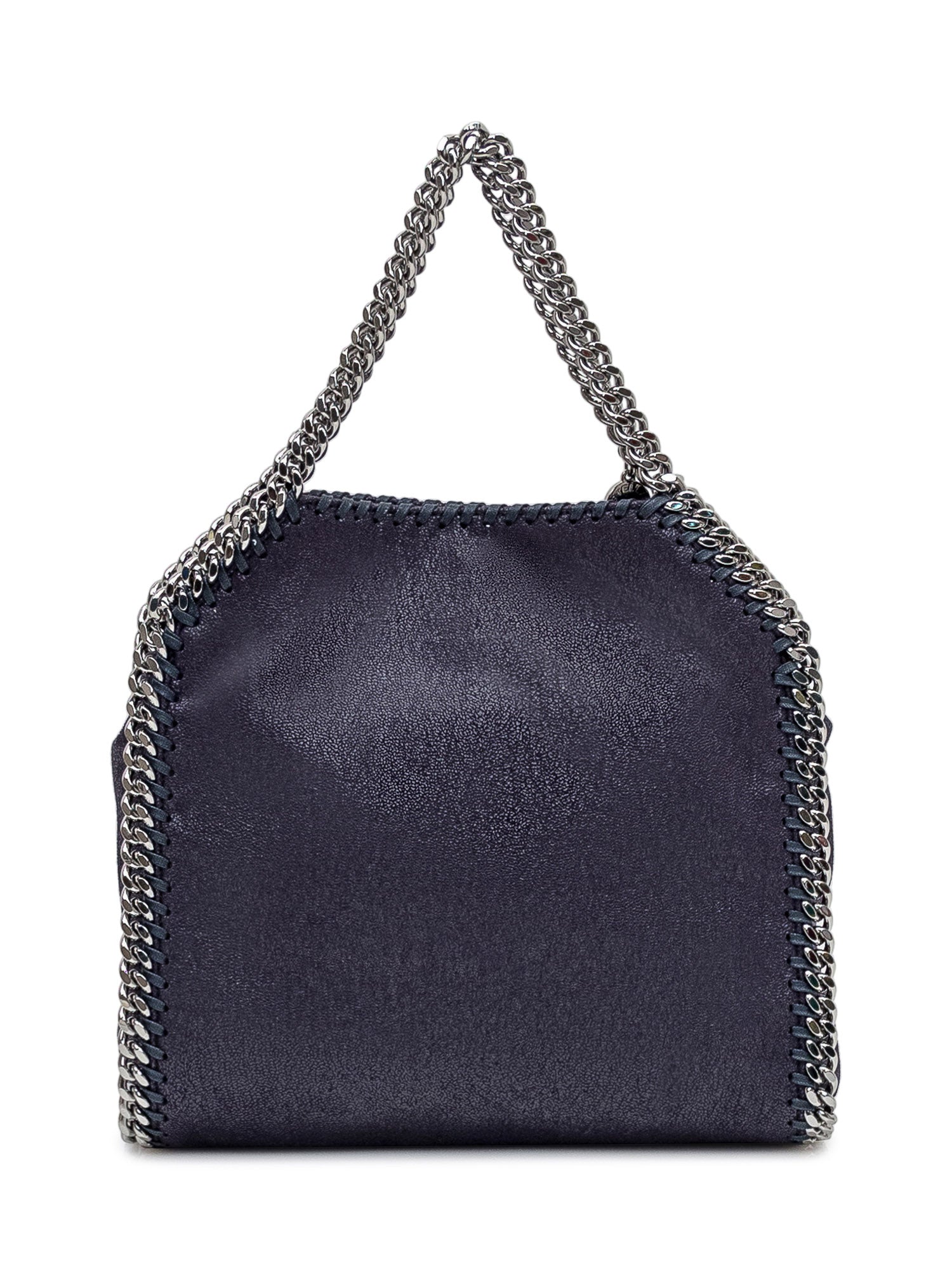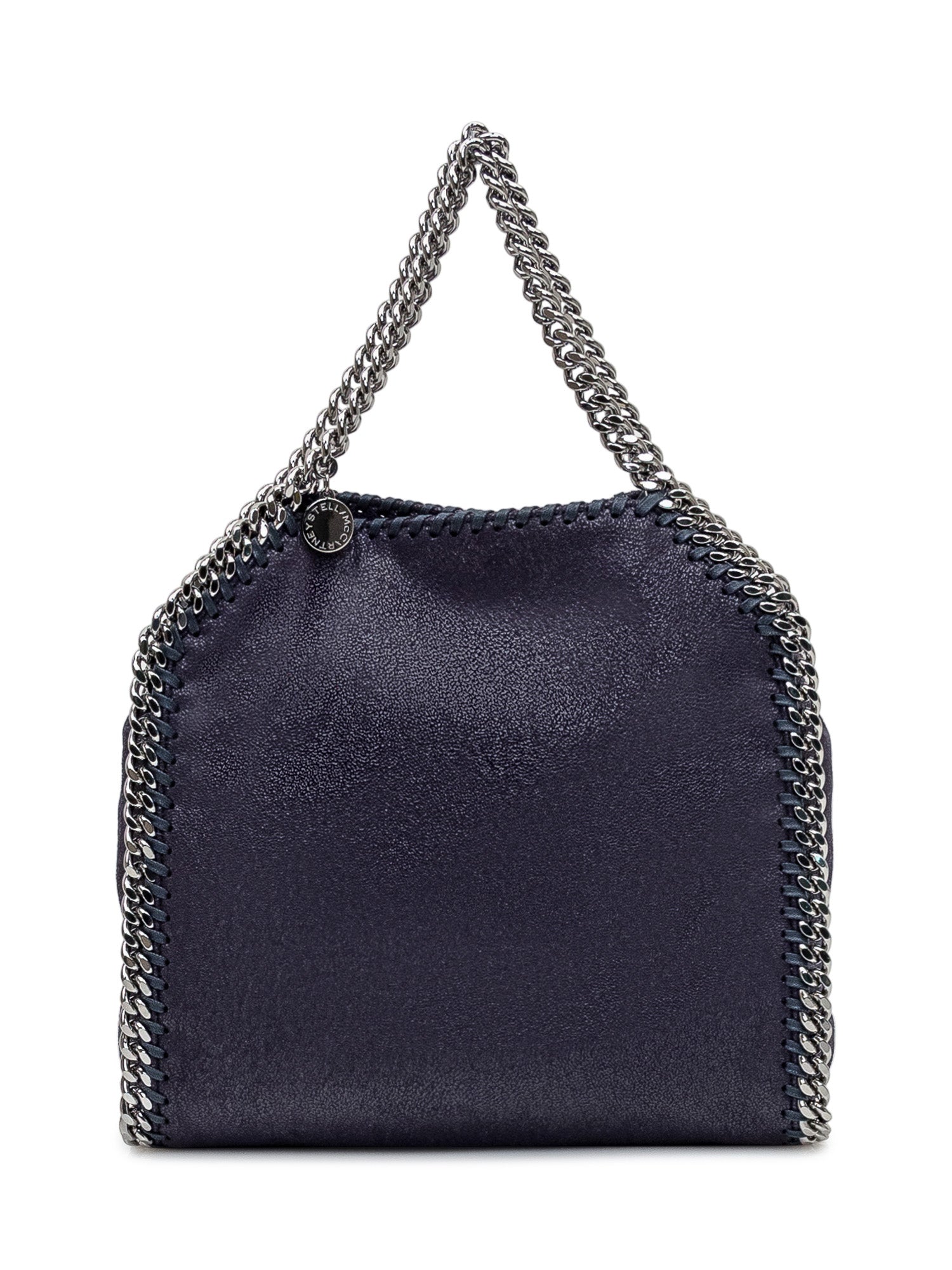 Blue mini tote bag with semi-glossy finish. Two chain handles. Chain shoulder strap. Flat pocket inside. Magnetic button closure. Medallion with logo engraved on it.