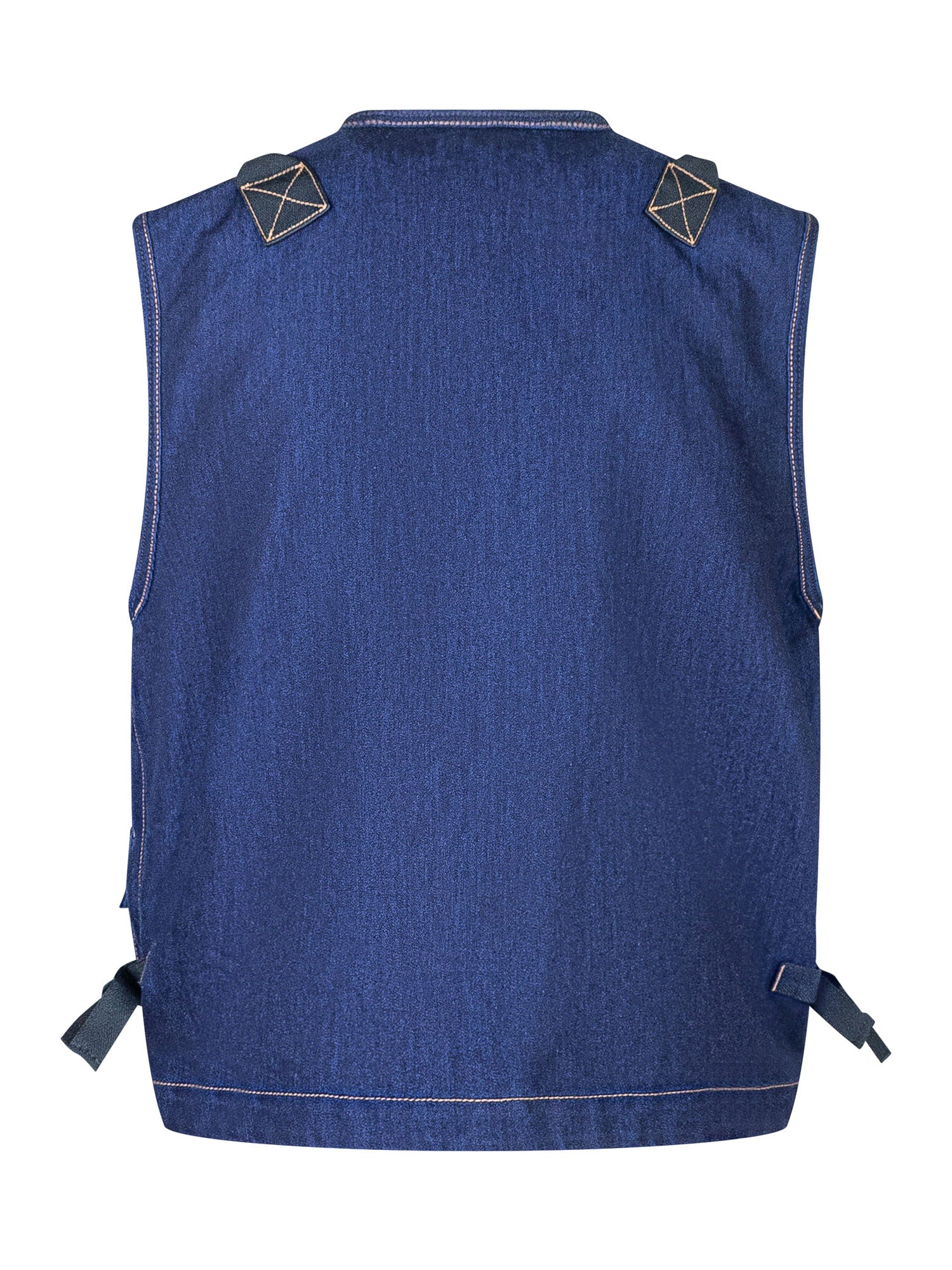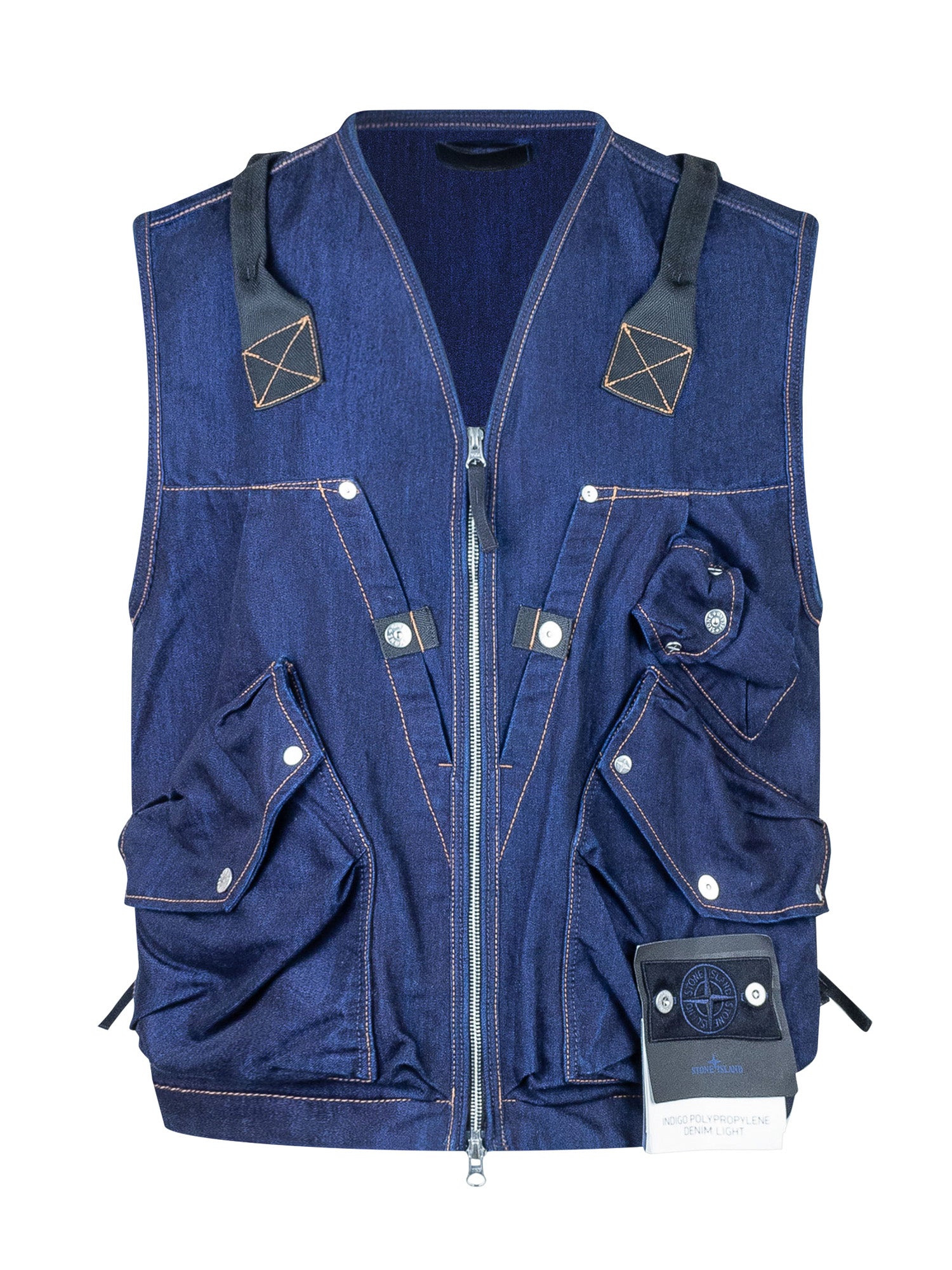 Stone Island blue denim vest with front zip and multiple patch pockets. Technical details and signature logo on the side for a modern, functional utility look.