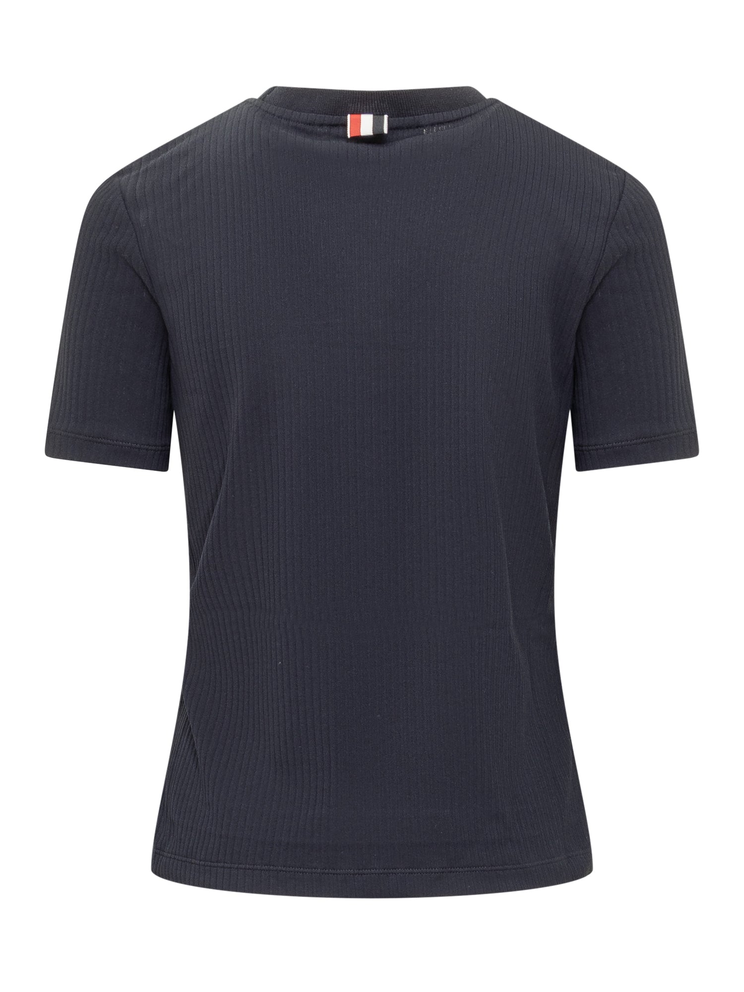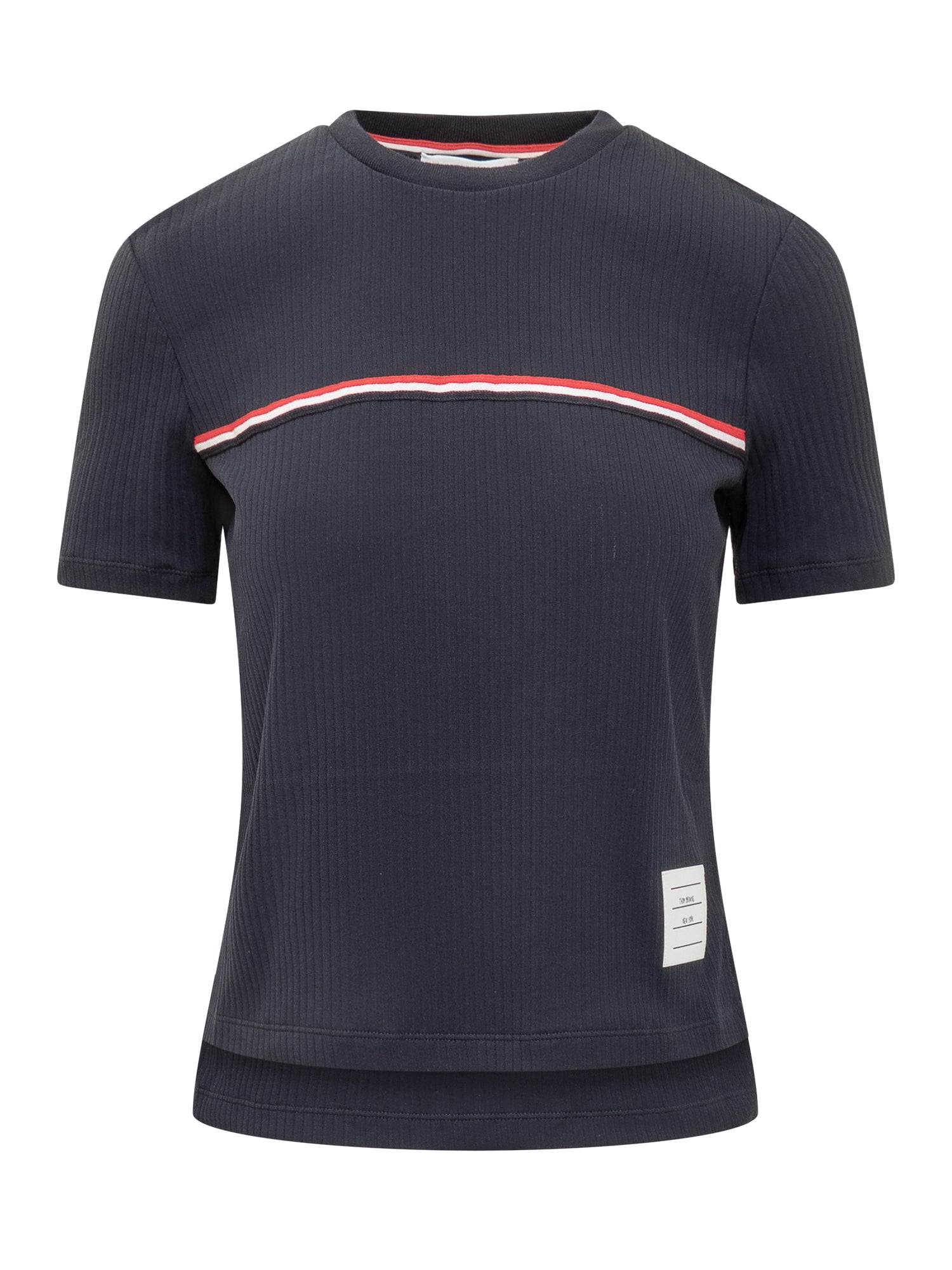 Short-sleeved T-shirt. Crew neck. Stretch rib knit. Side slits. Embroidered logo bands on the front. Logo plaque on the back. Embroidered logo on bottom.