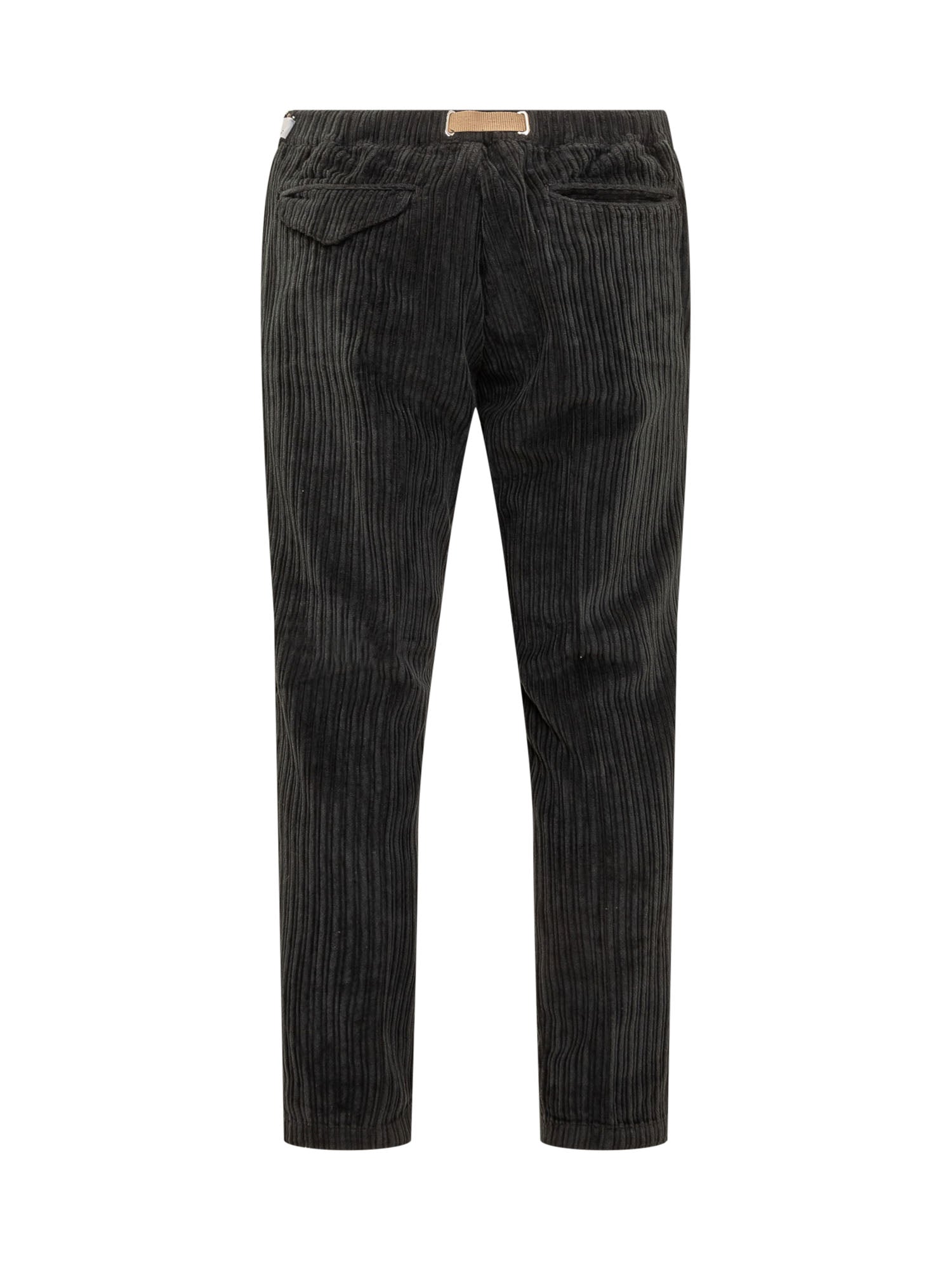 Long corduroy trousers. Zip closure, button and belt. Welt pockets on the sides and back. Flap pocket on the back. Black color.