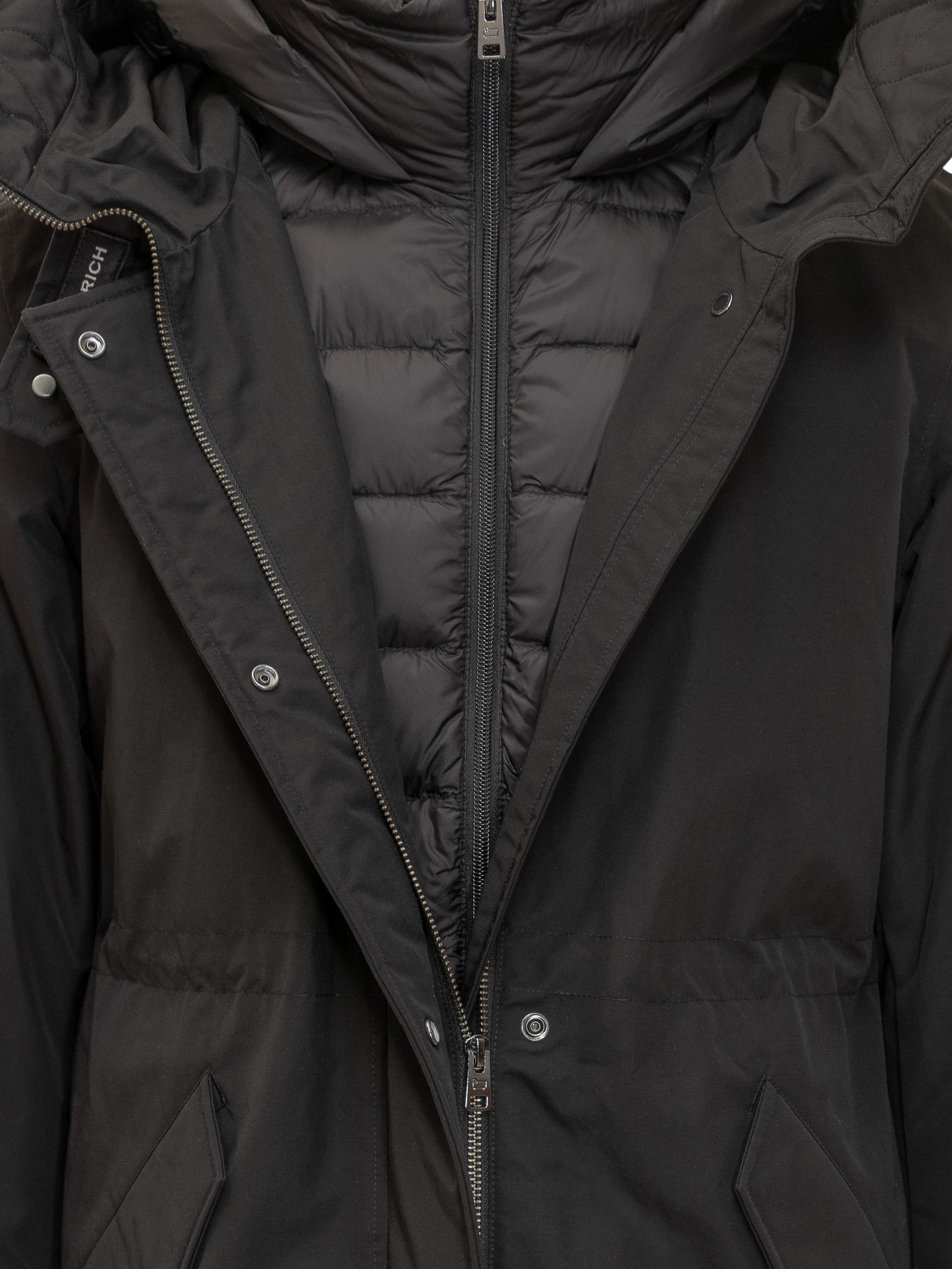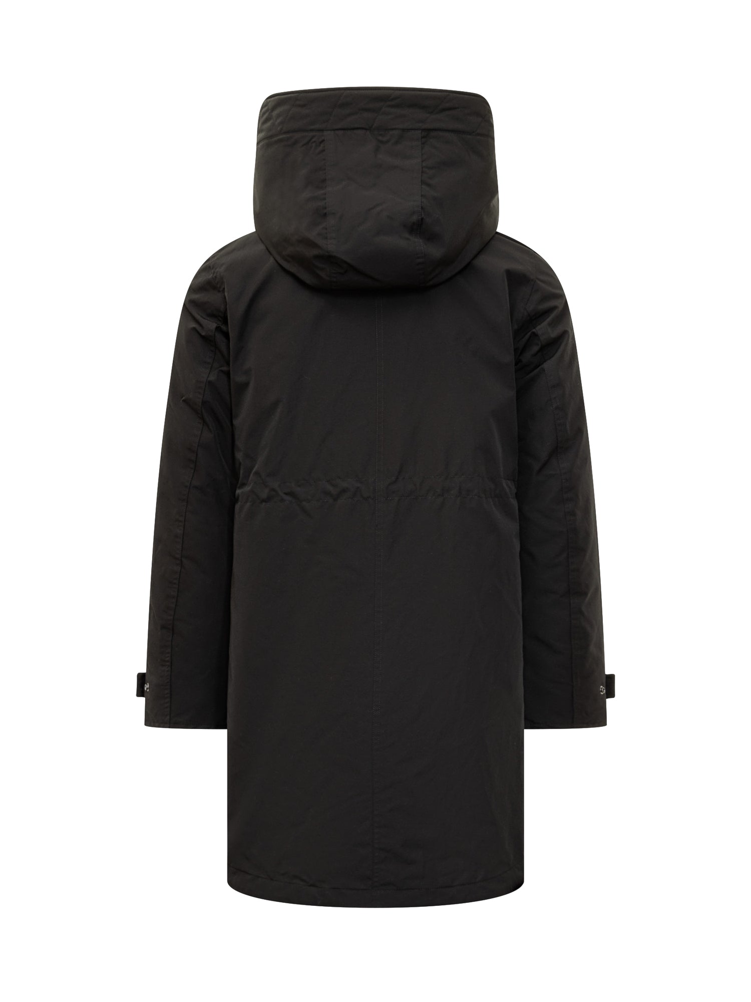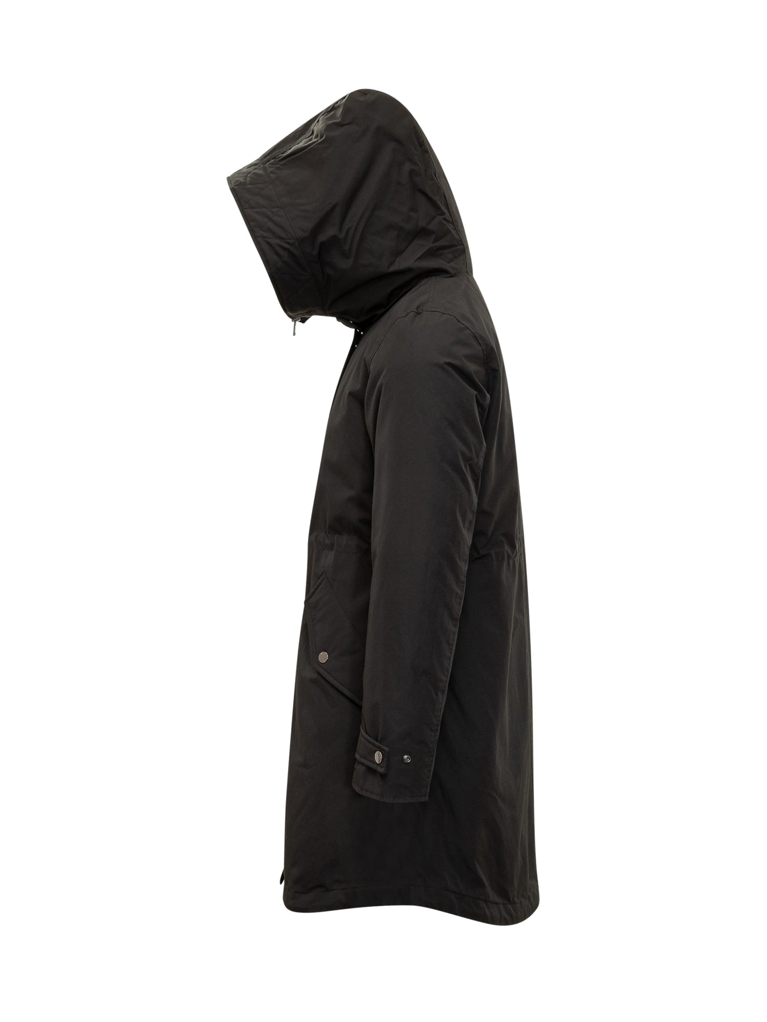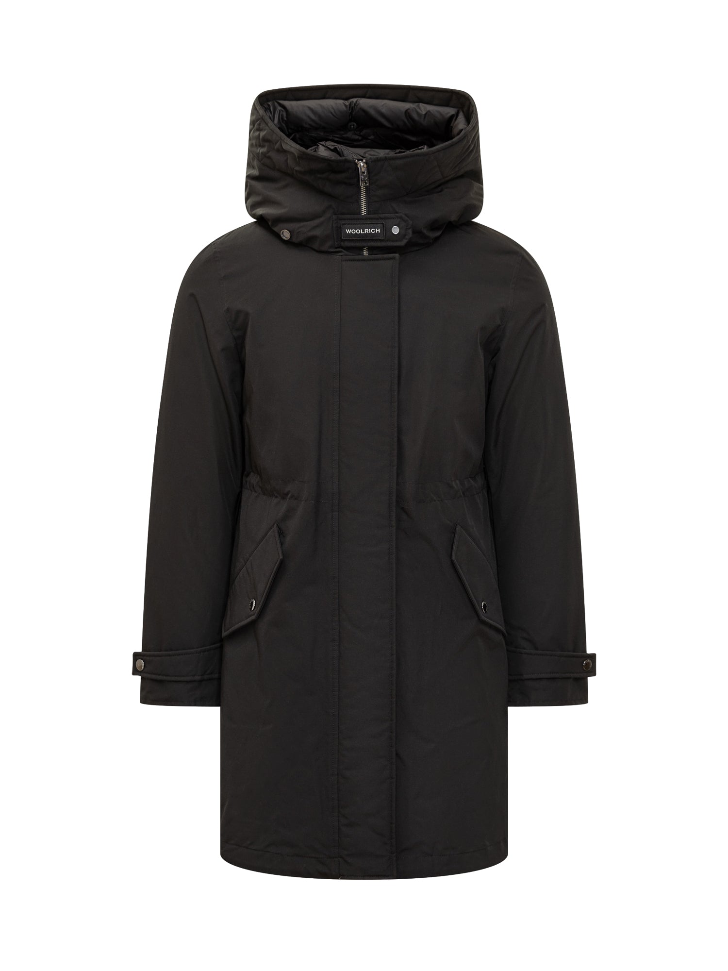 Black Woolrich long parka with padded hood, concealed zip and button closure.