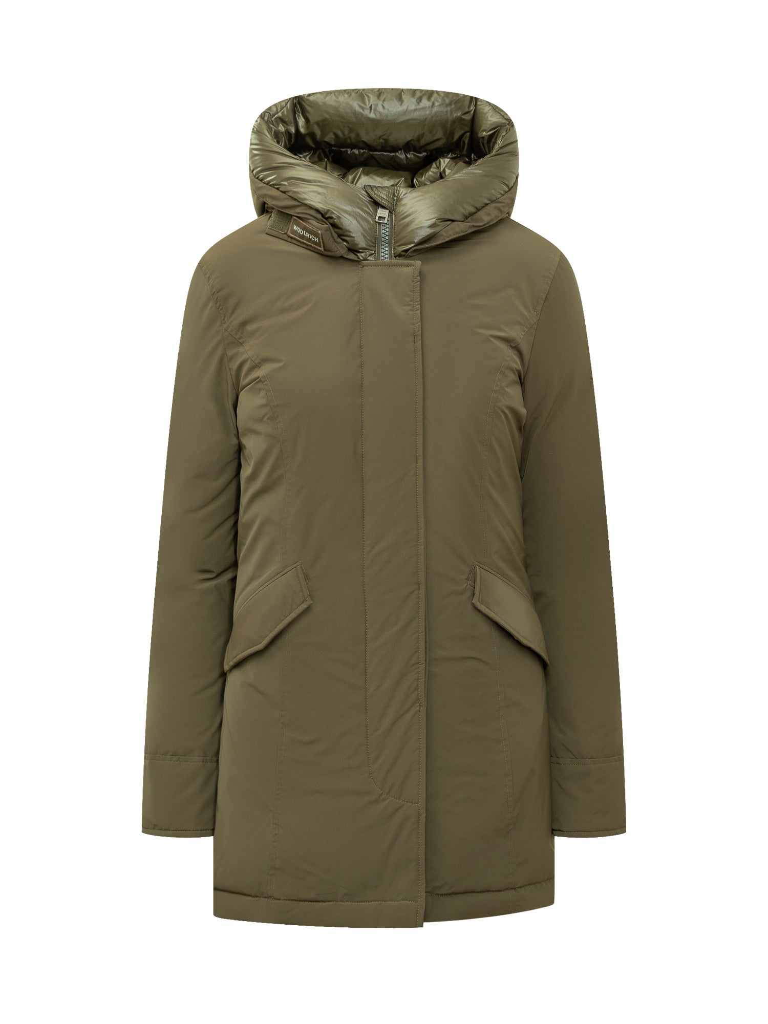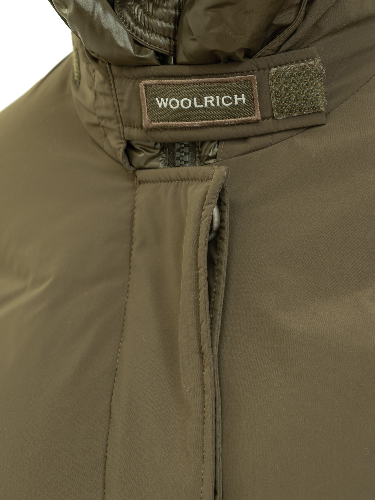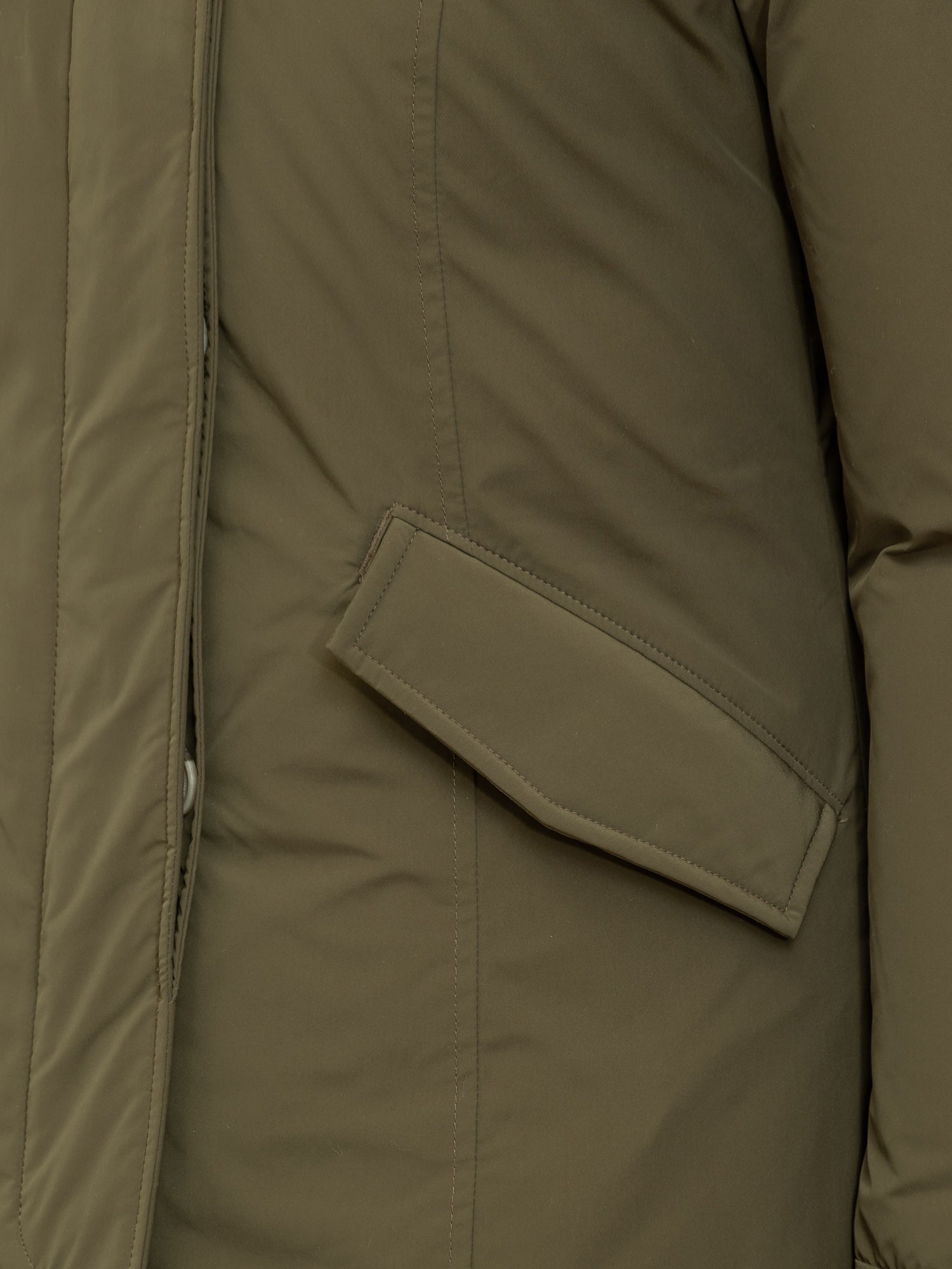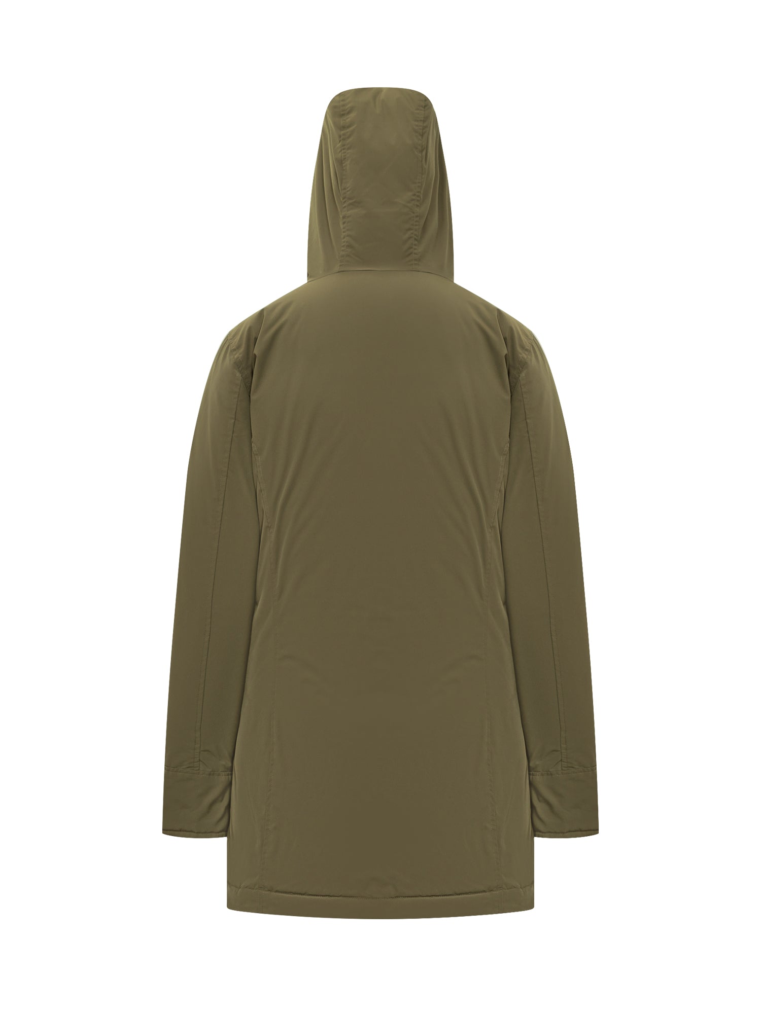 Green down jacket with long sleeves. Hood. Front closure with zip and buttons. Side pockets. Logo on the neck.