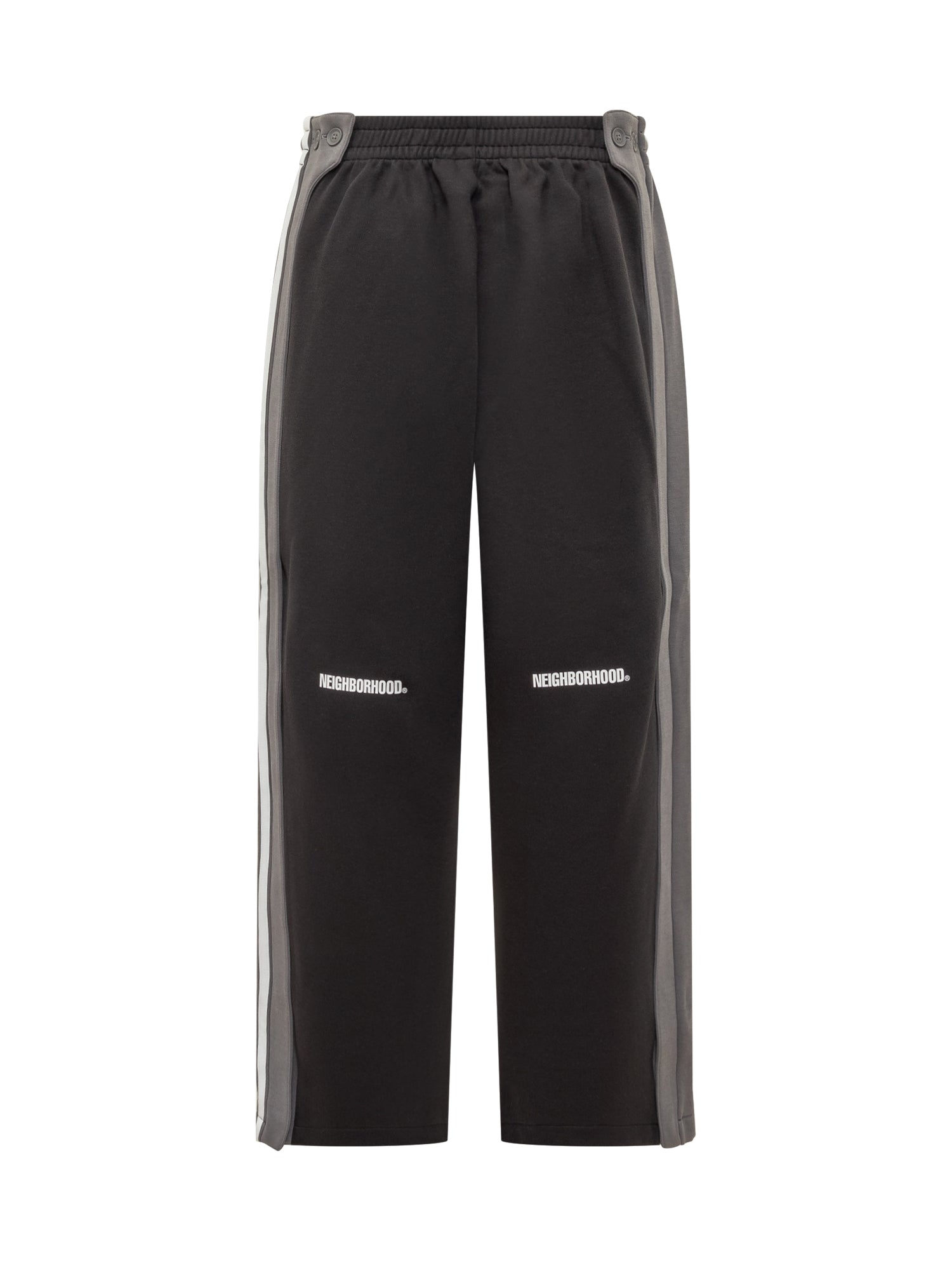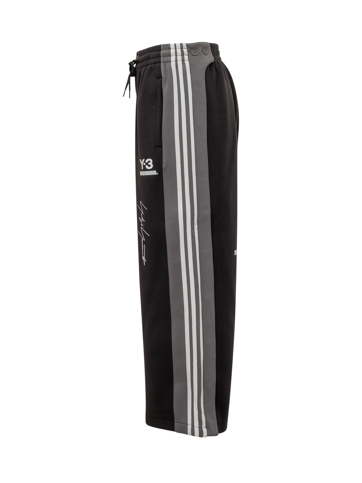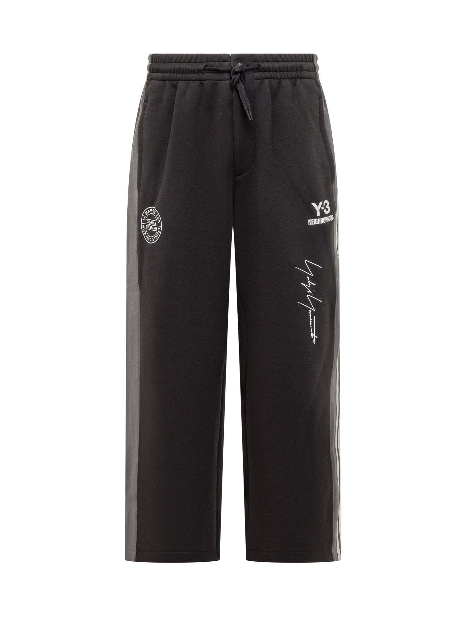 Y-3 Neighborhood sweatpants with printed logo and Yohji Yamamoto signature. Elastic waistband with drawstring and tonal side stripes.