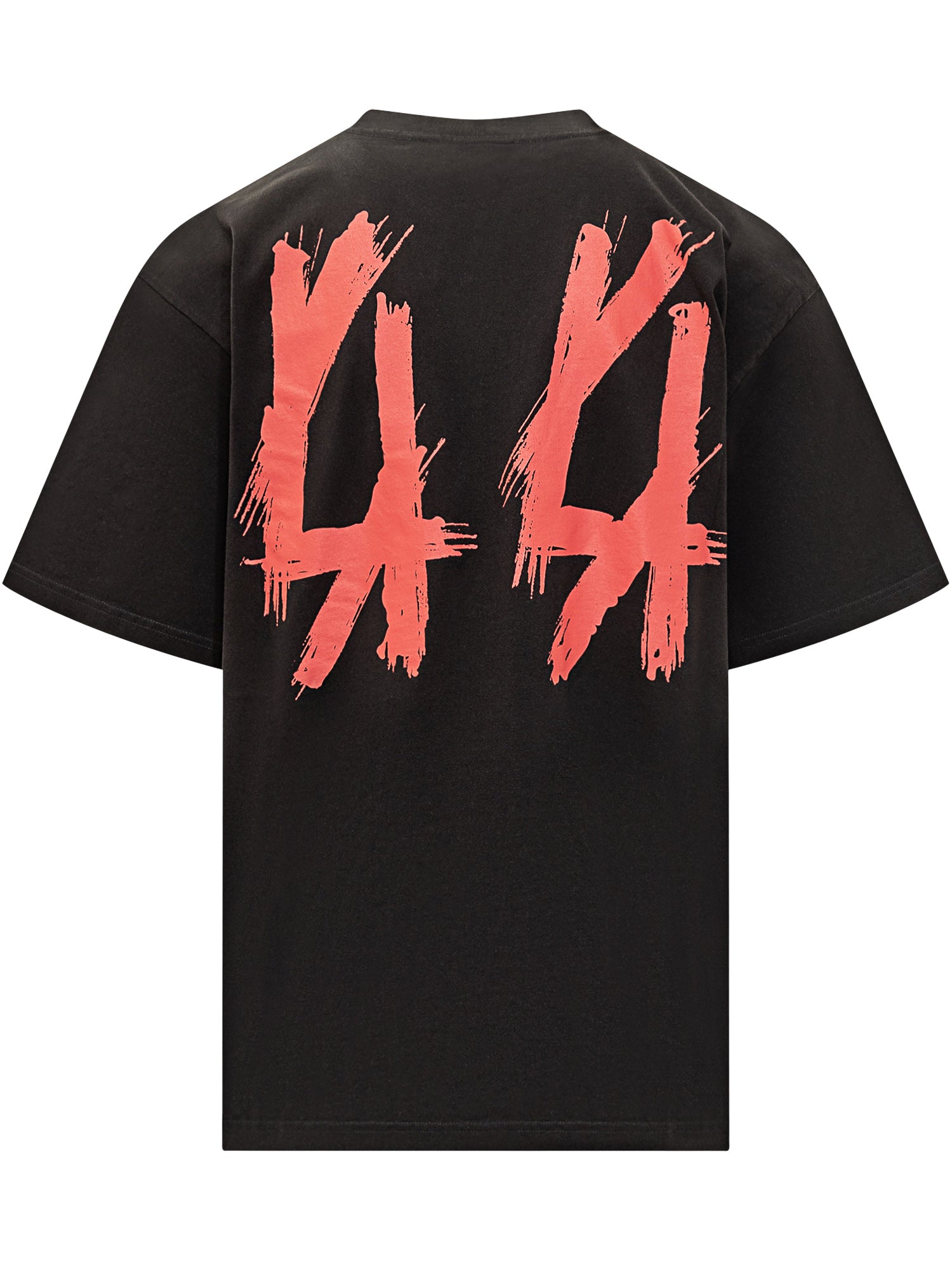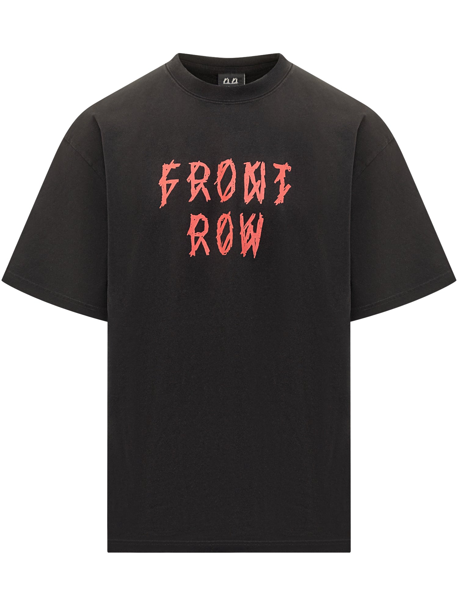 Black oversized cotton T-shirt by 44 Label Group featuring bold red Front Row front print in grunge style. A statement piece for edgy streetwear outfits.