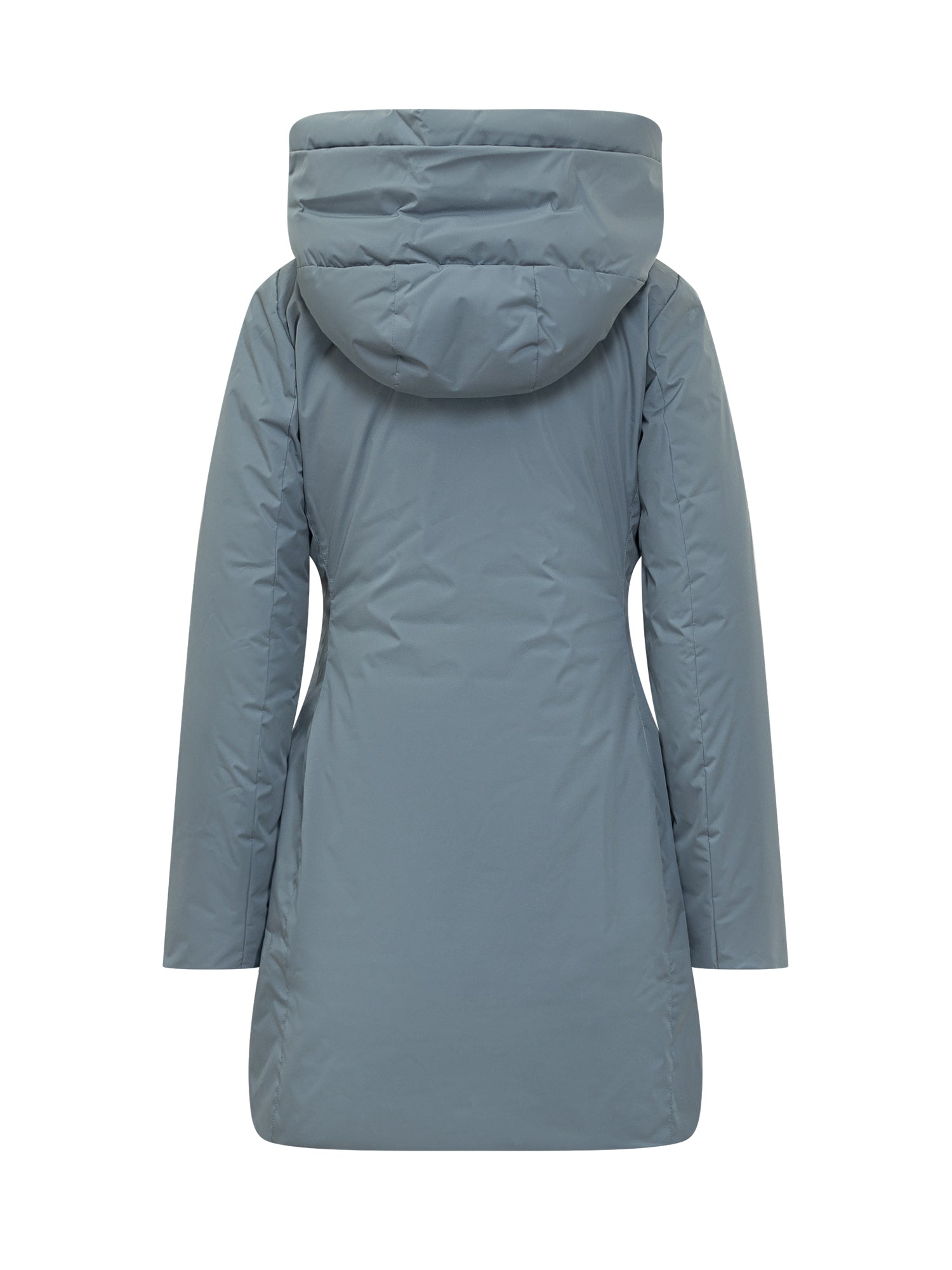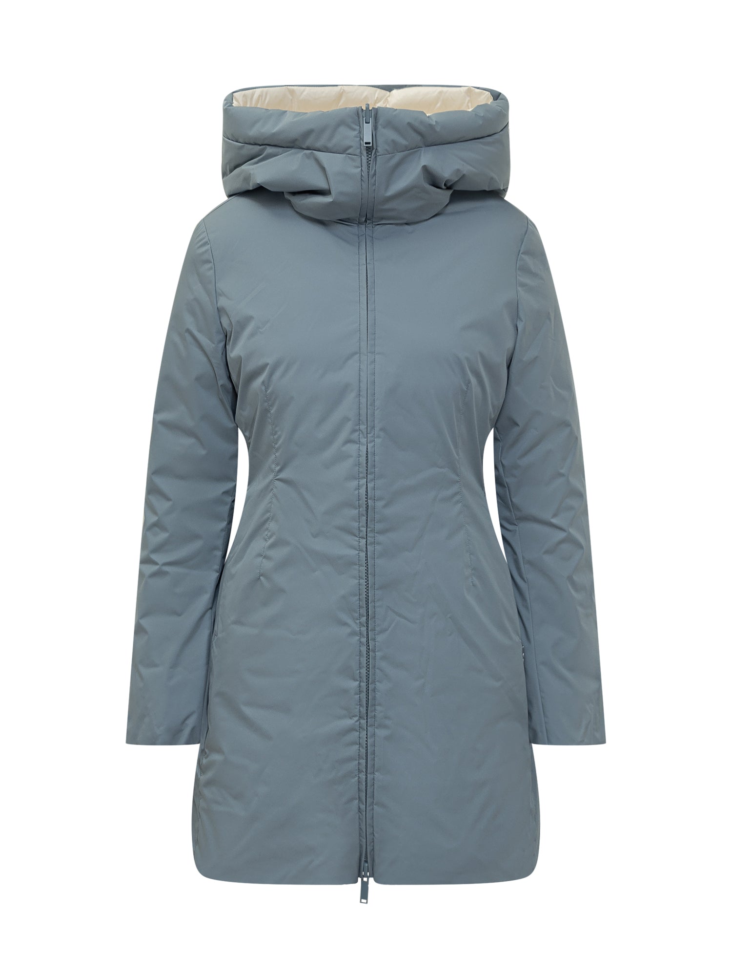 Add long light blue puffer jacket with cozy hood and two-way zip closure.