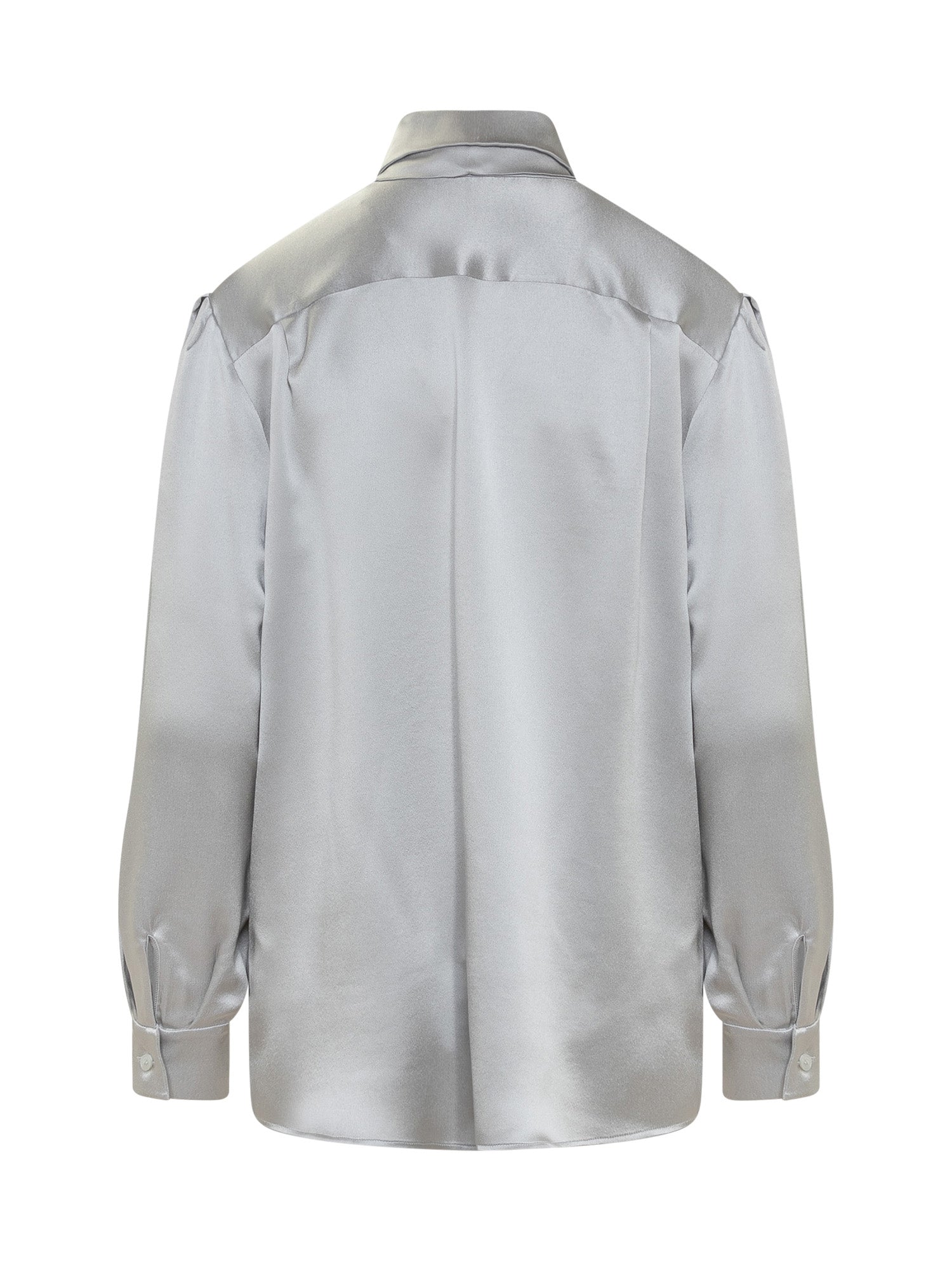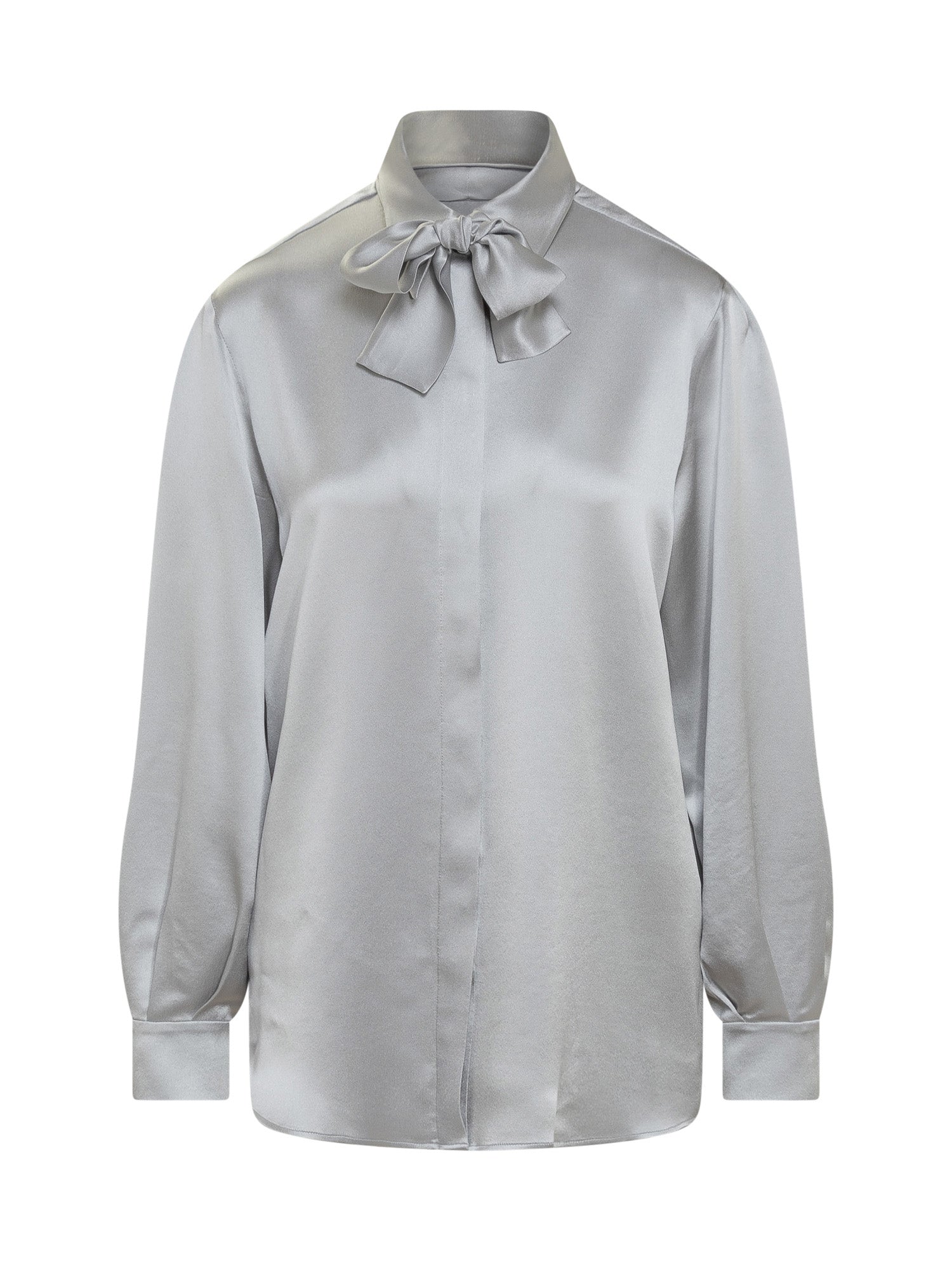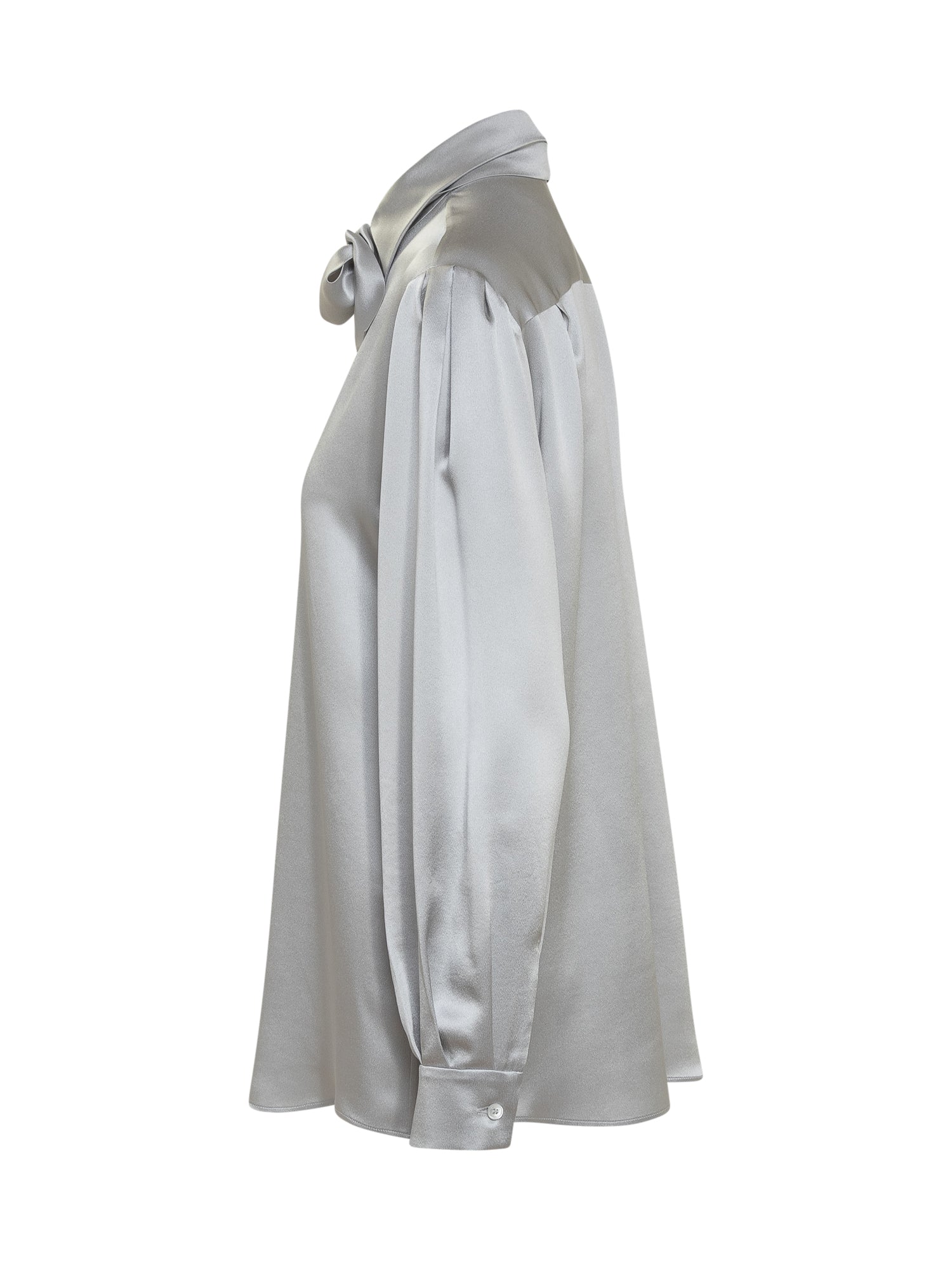 Long sleeved silk shirt. Classic collar. Button closure. Cuffs with buttons. Bow detail on the neck.