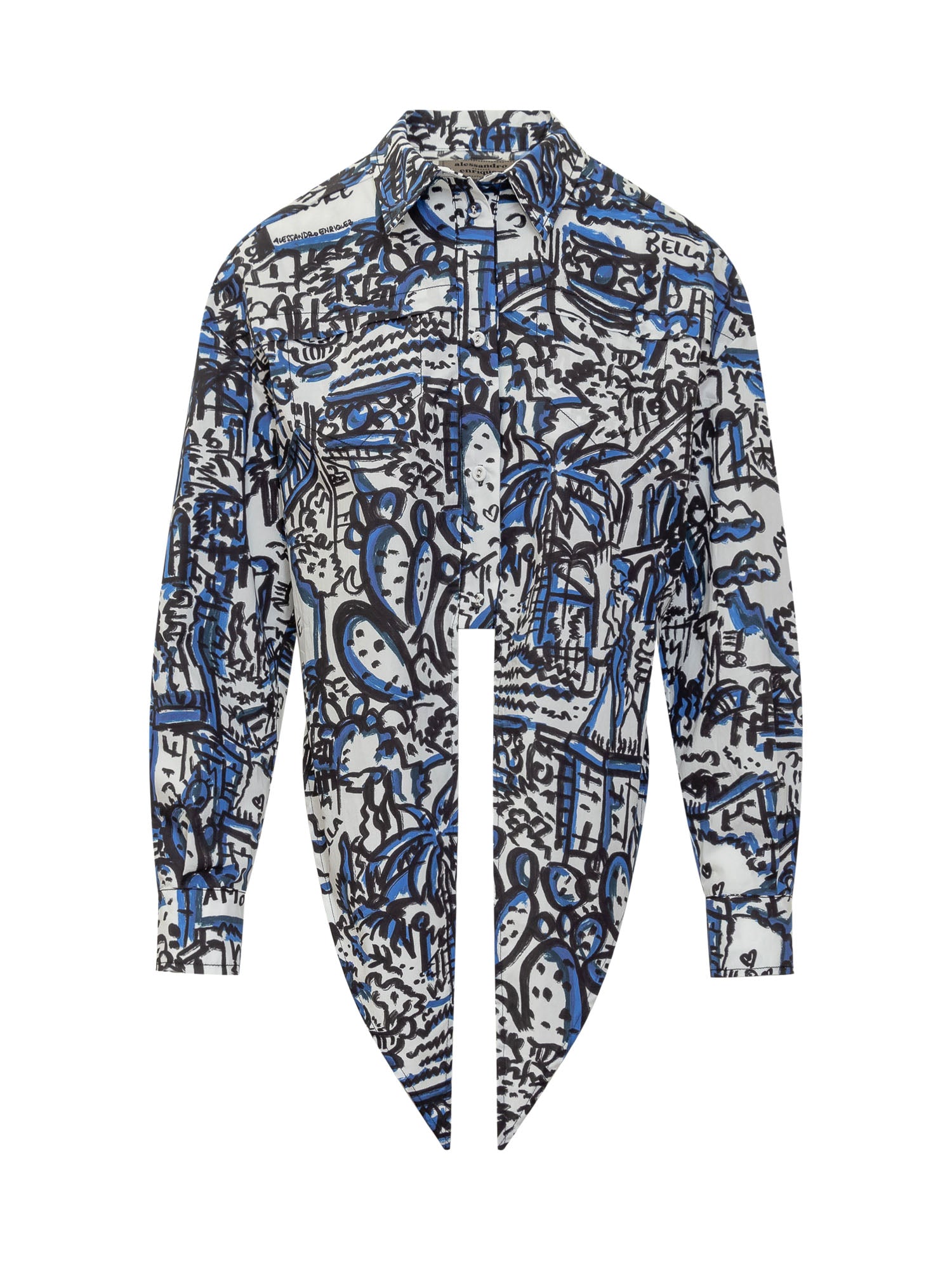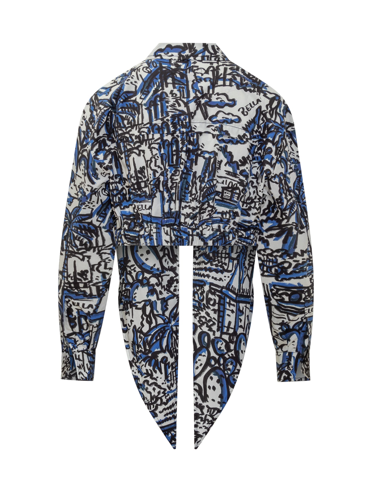 Long-sleeved cropped shirt in cotton. Classic collar. Closure with buttons and knot. Cuffs with button. Abstract all over pattern.