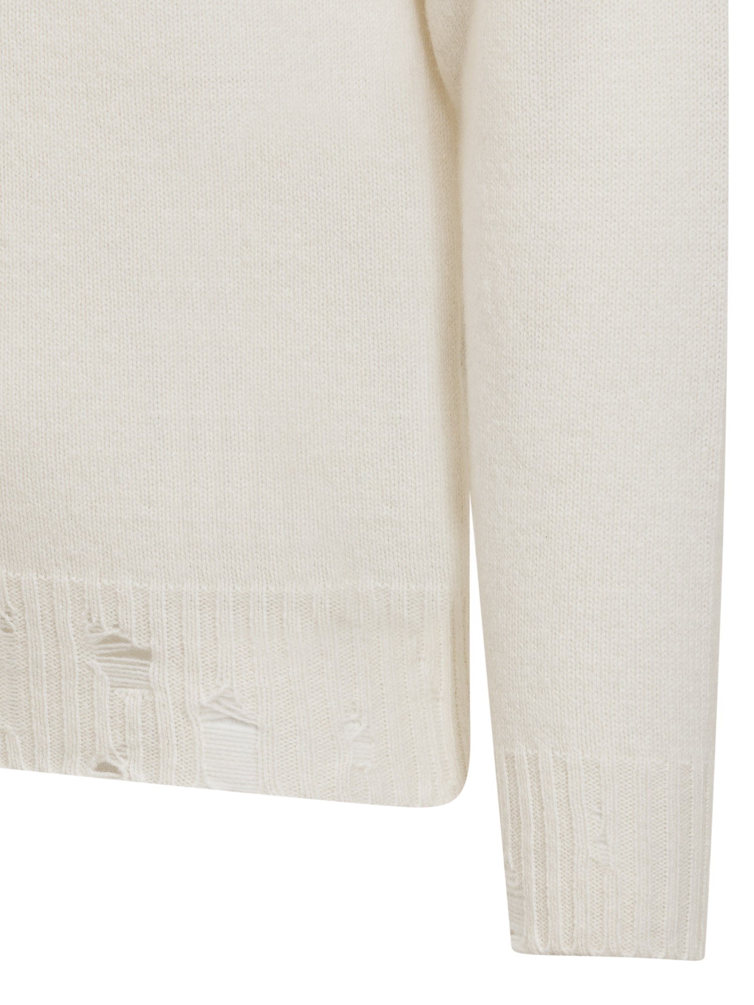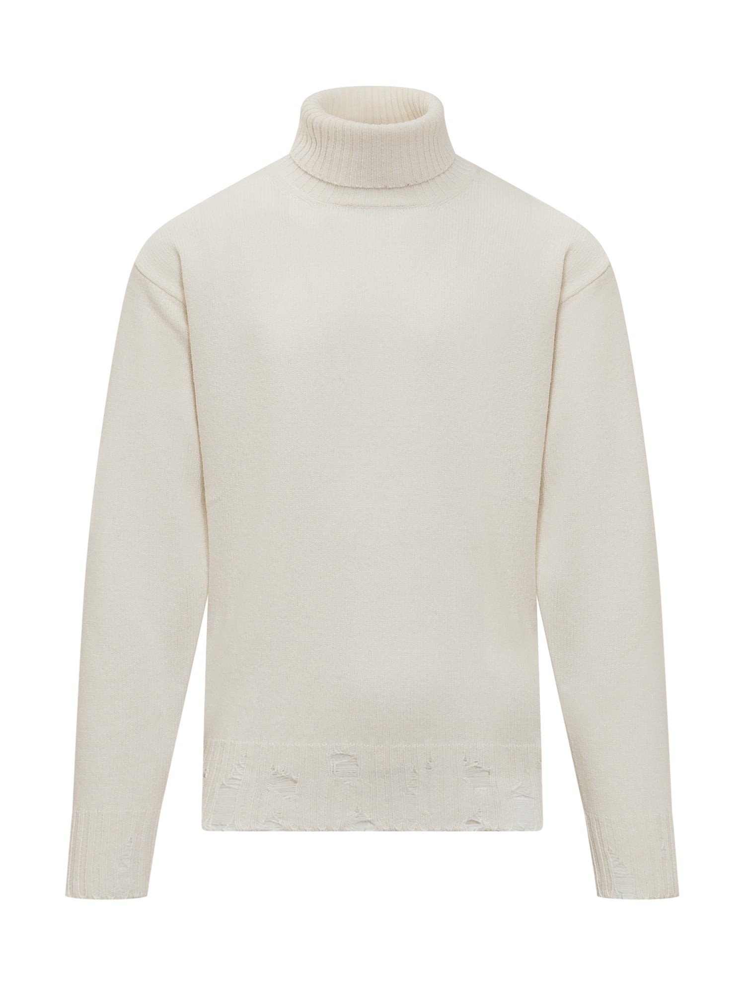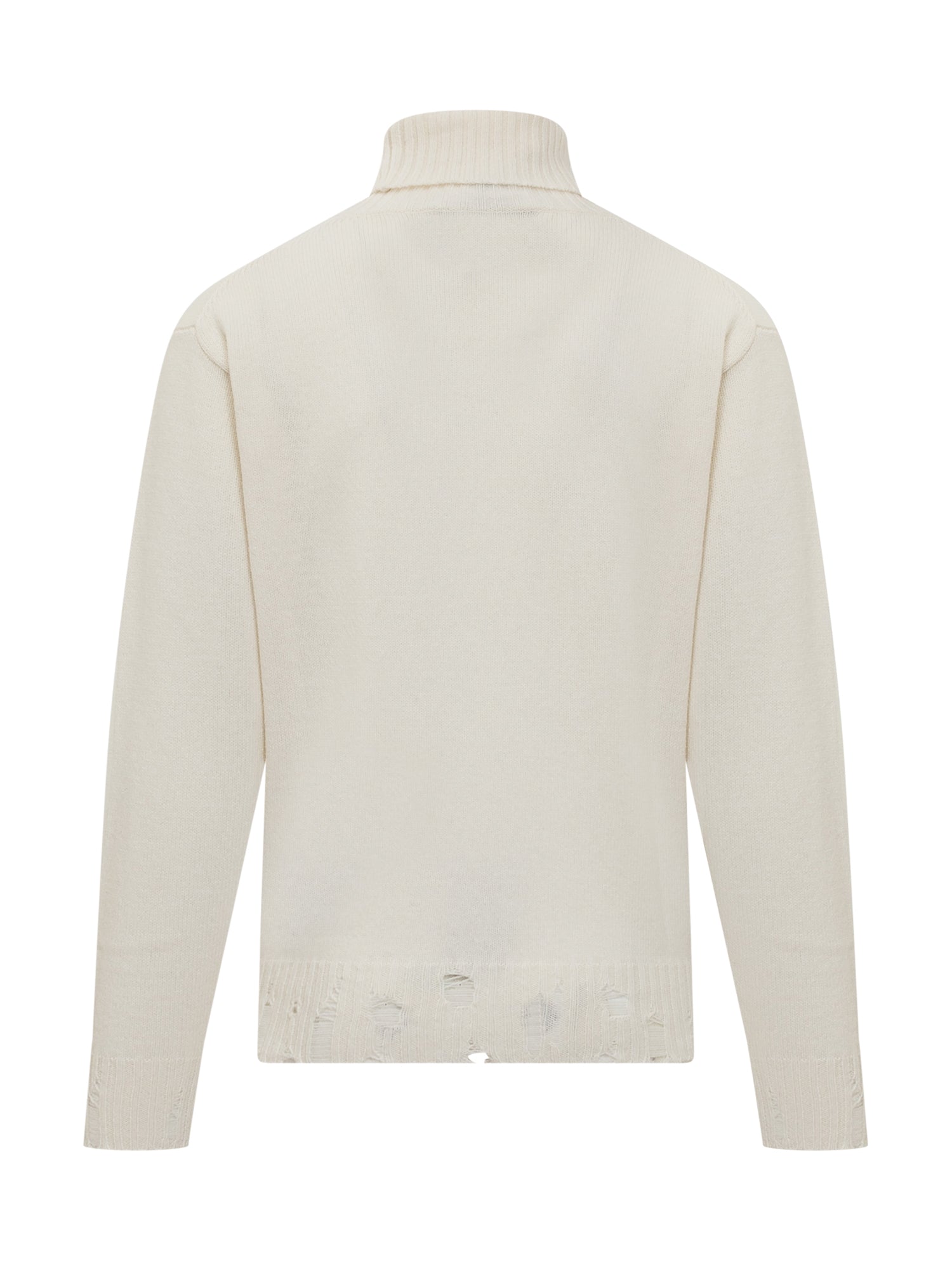 White long sleeved sweater. Turtleneck. Worn effect on the bottom. Ribbed neck, cuffs and bottom.