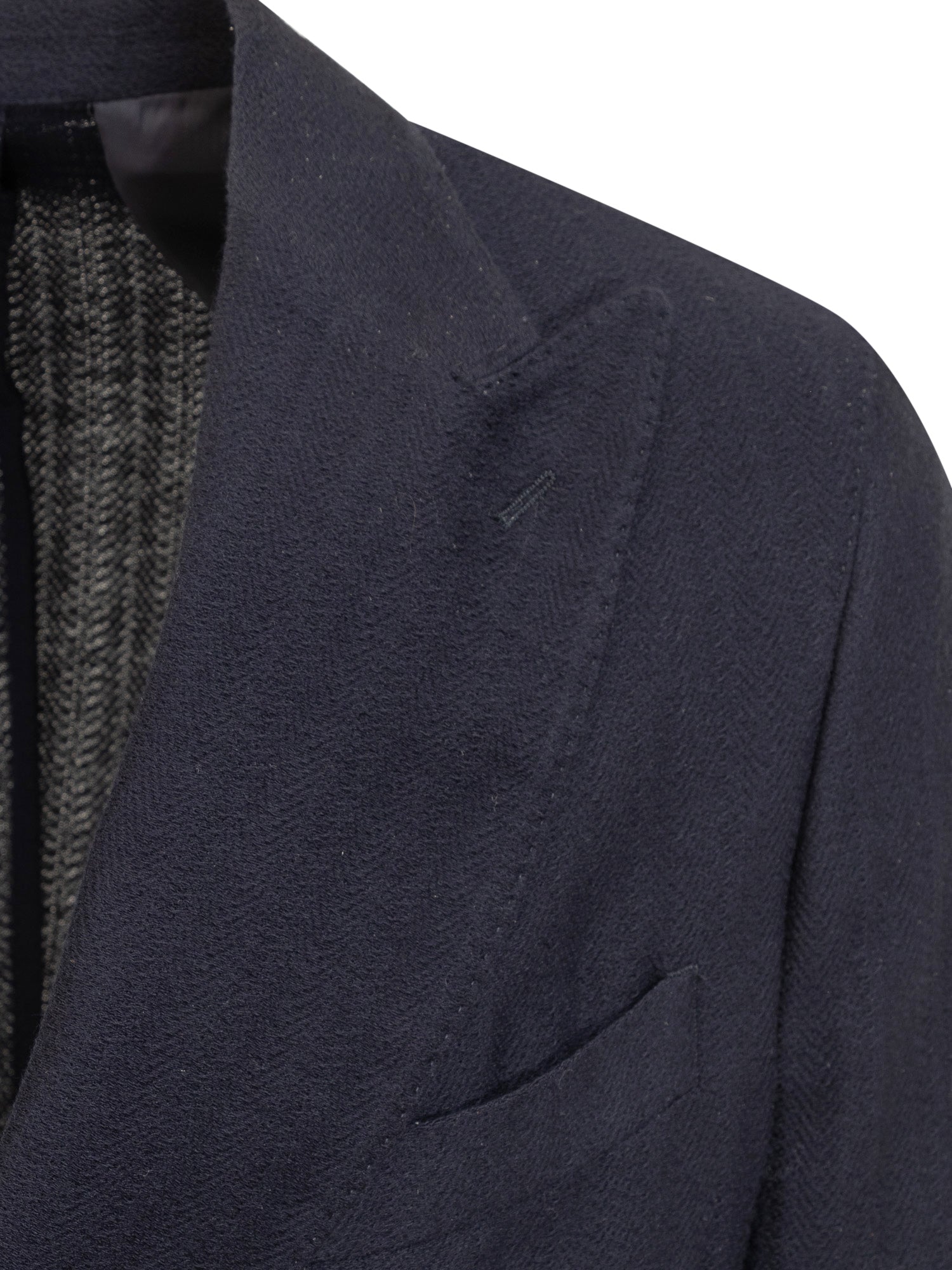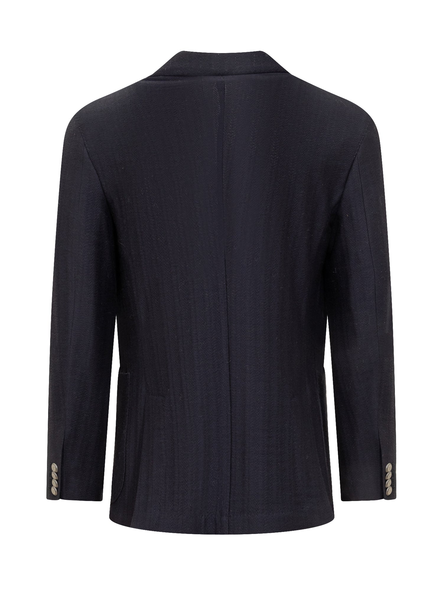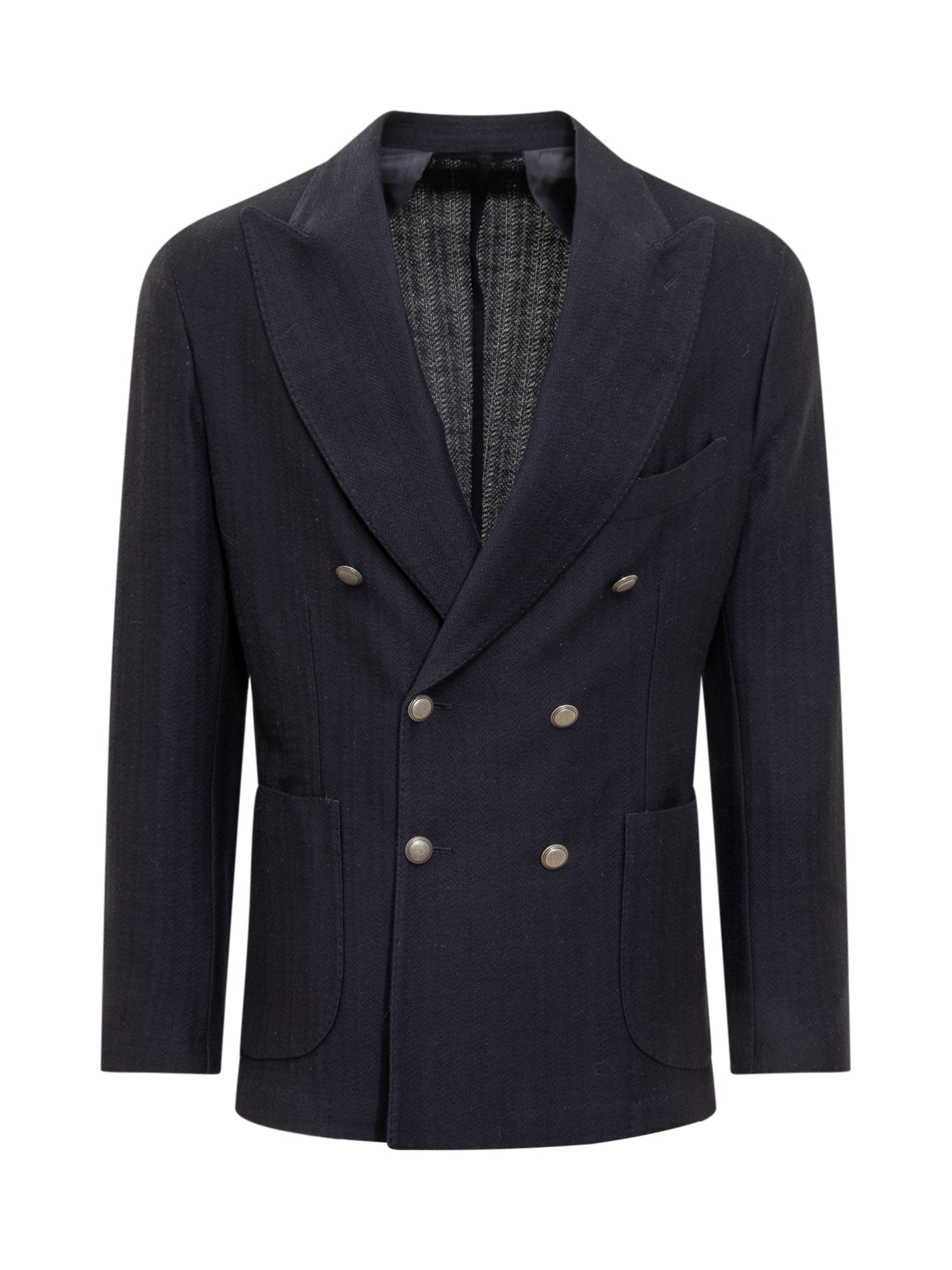 Double-breasted blazer. Button closure. Long sleeves. Lapel collar. Patch pockets. Breast pocket. Buttons on cuffs. Inside pockets. Slits on the sides. Blue color.