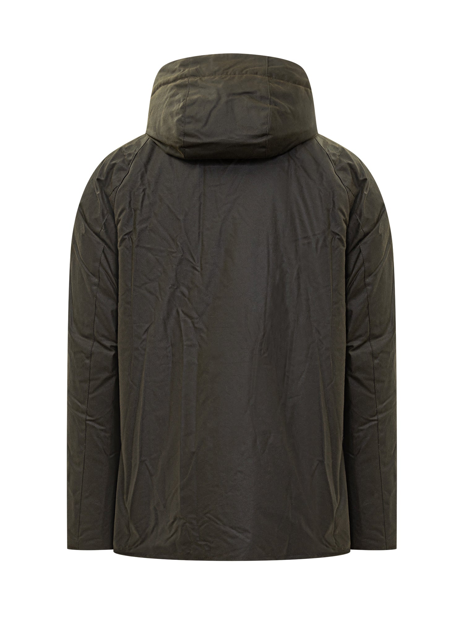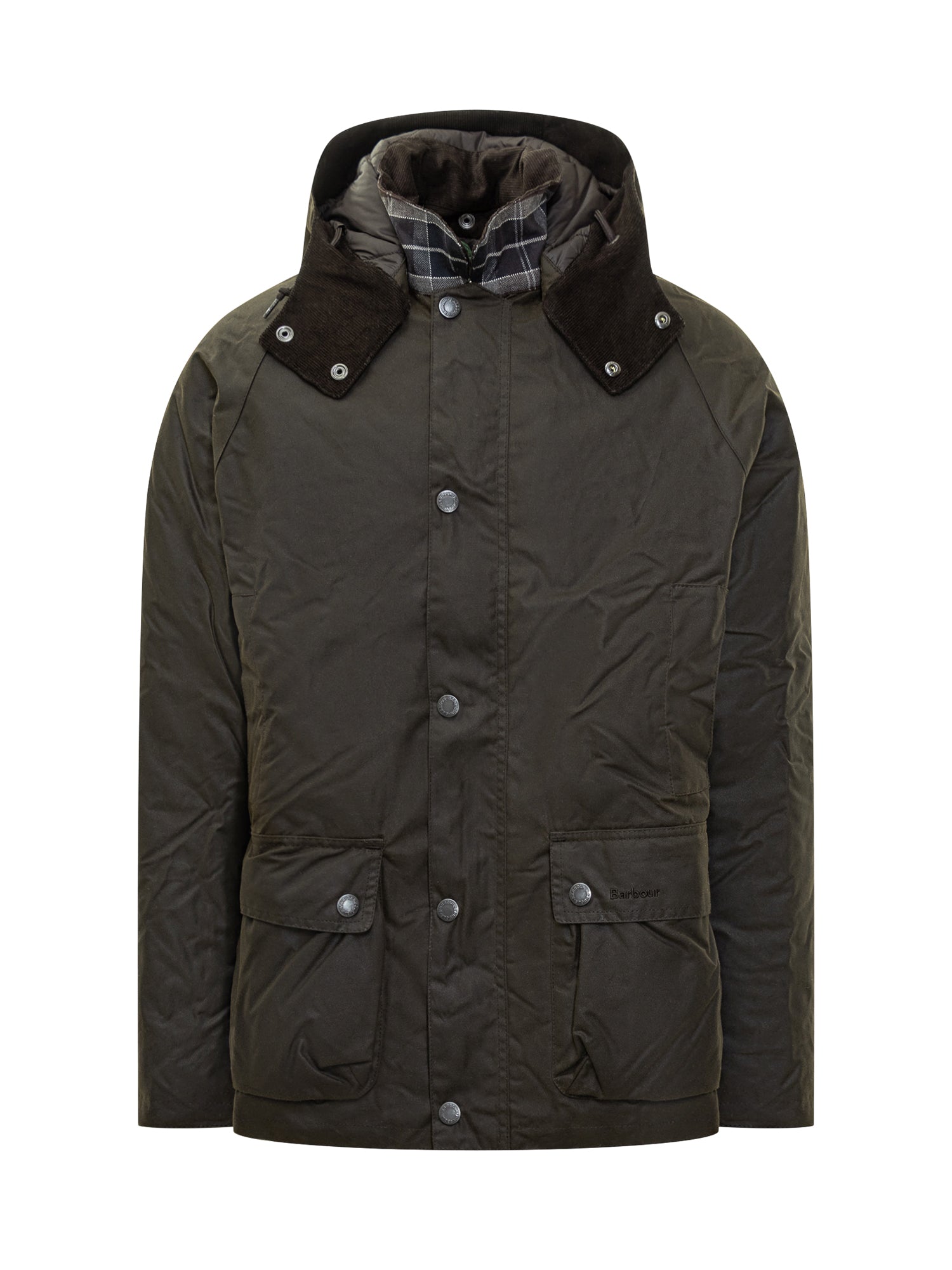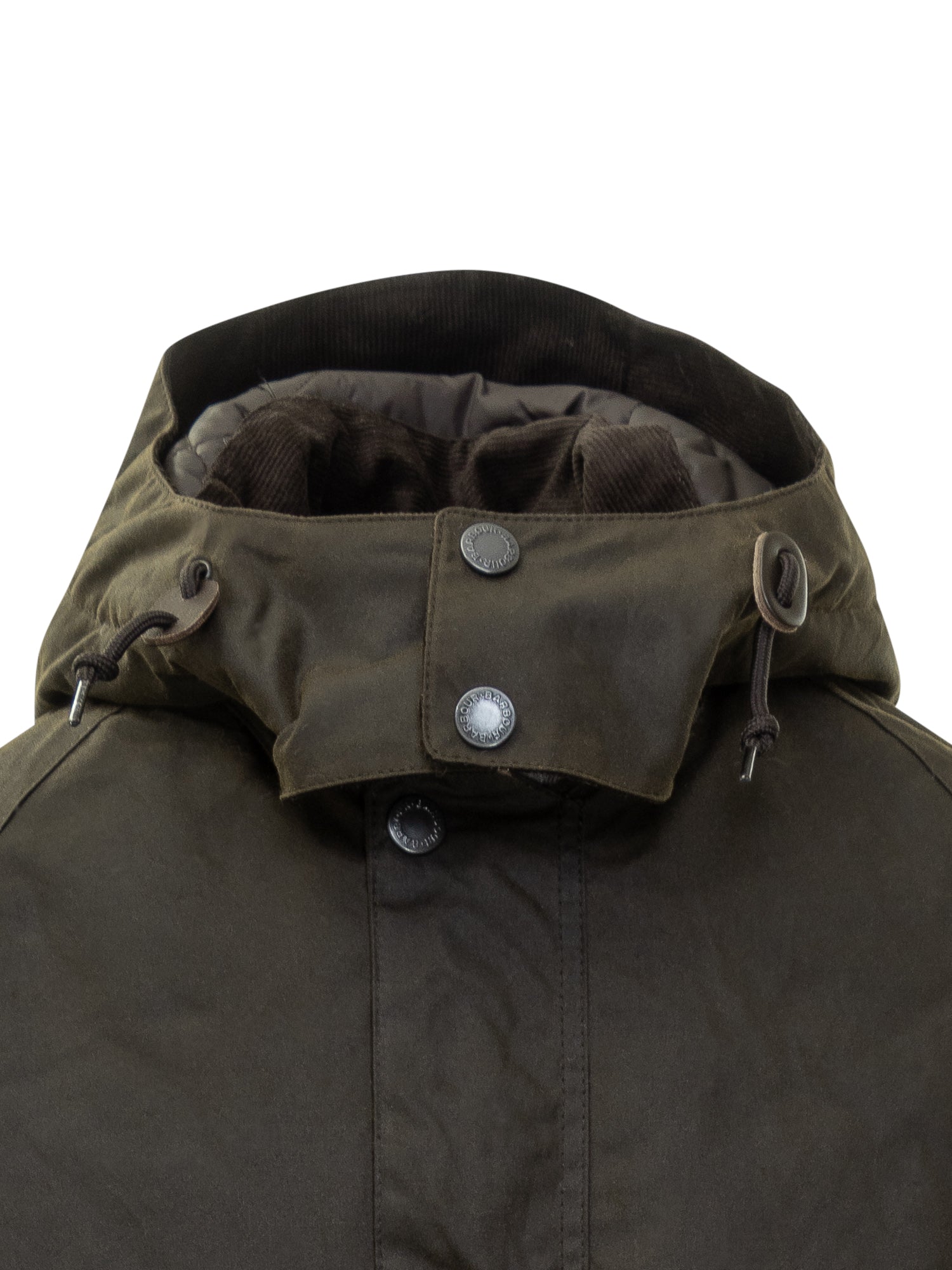 Green waxed jacket with brown velvet collar, button fastening, and front pockets, ideal for protection and style on cold, rainy days.