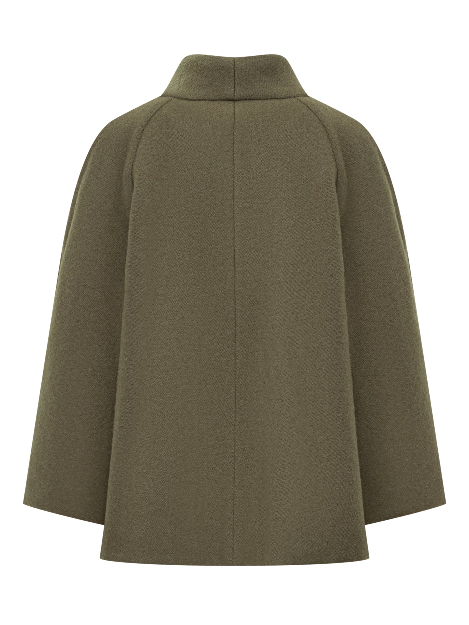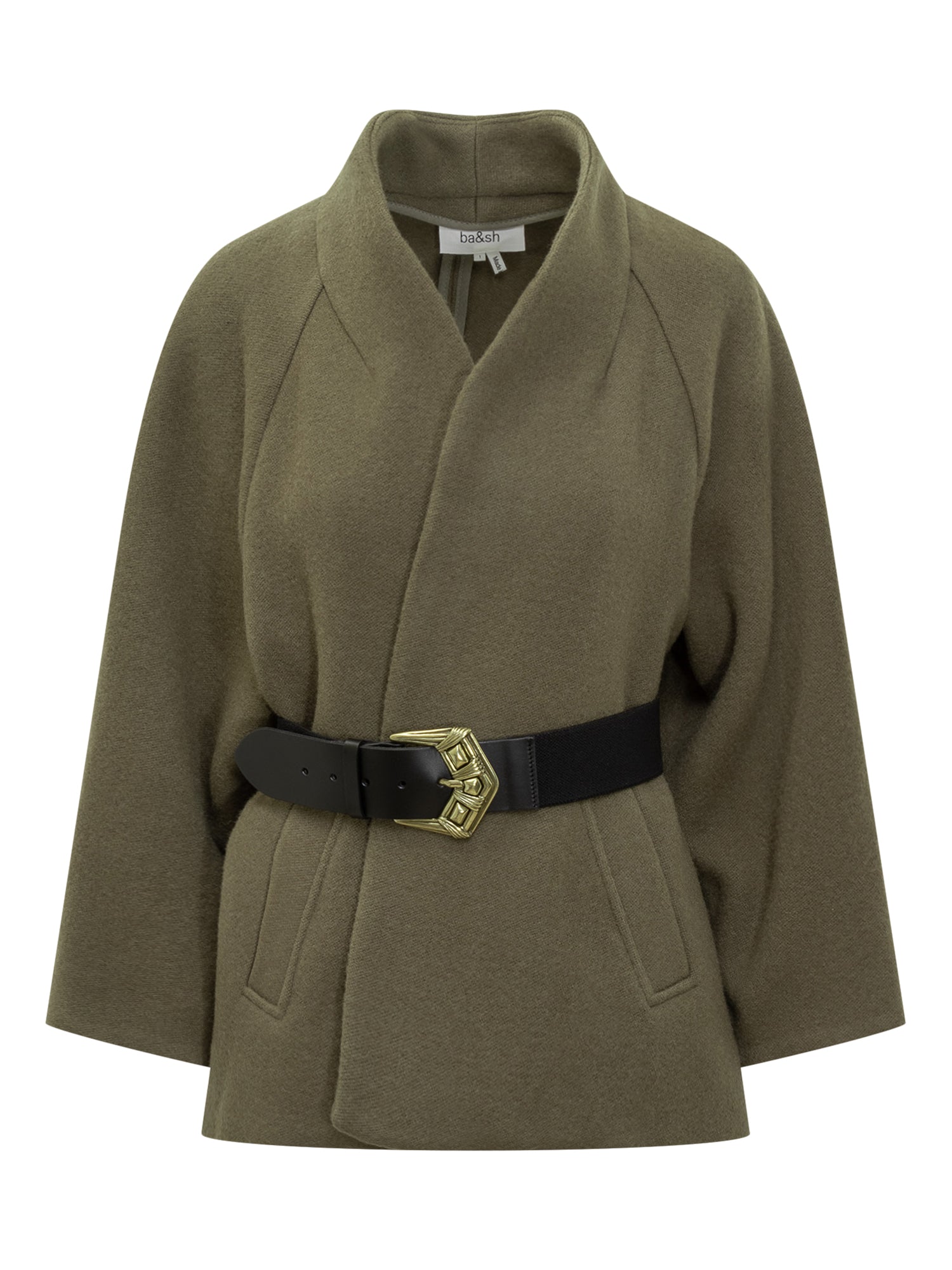 Ba&sh green wrap-style coat with black belt and gold buckle, featuring side pockets.