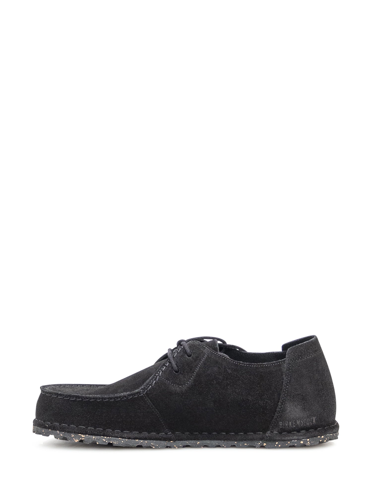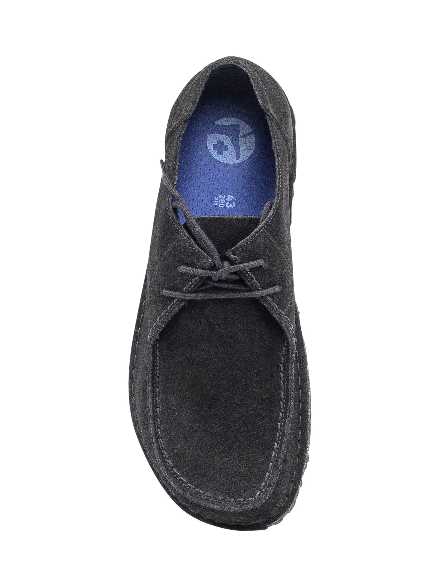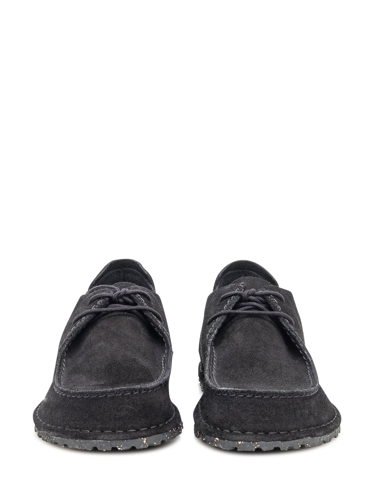 Birkenstock lace-up shoe in black suede with visible stitching and lightweight recycled rubber sole.