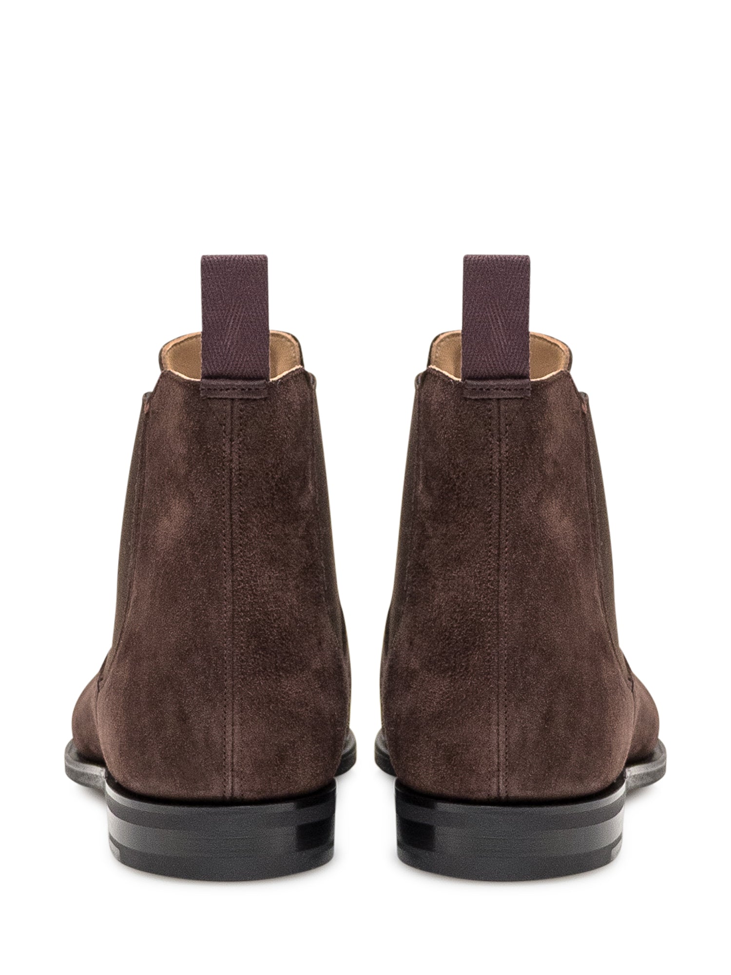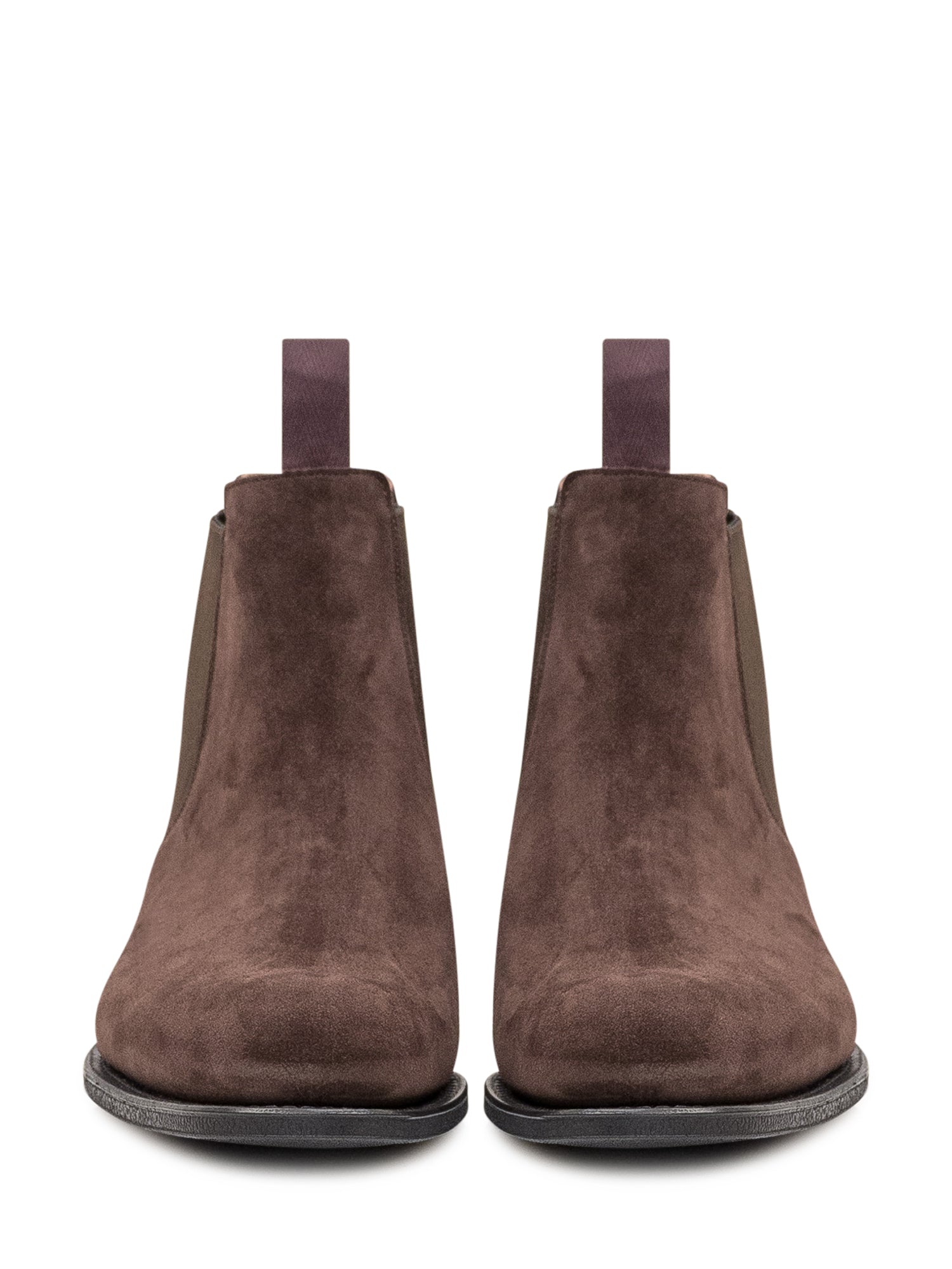 Church s Amberly Chelsea boot in dark brown suede. Clean and refined lines, tone-on-tone elastic side panels and rear pull tab.