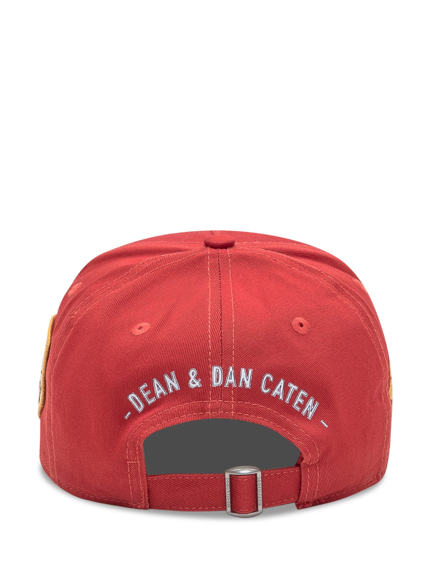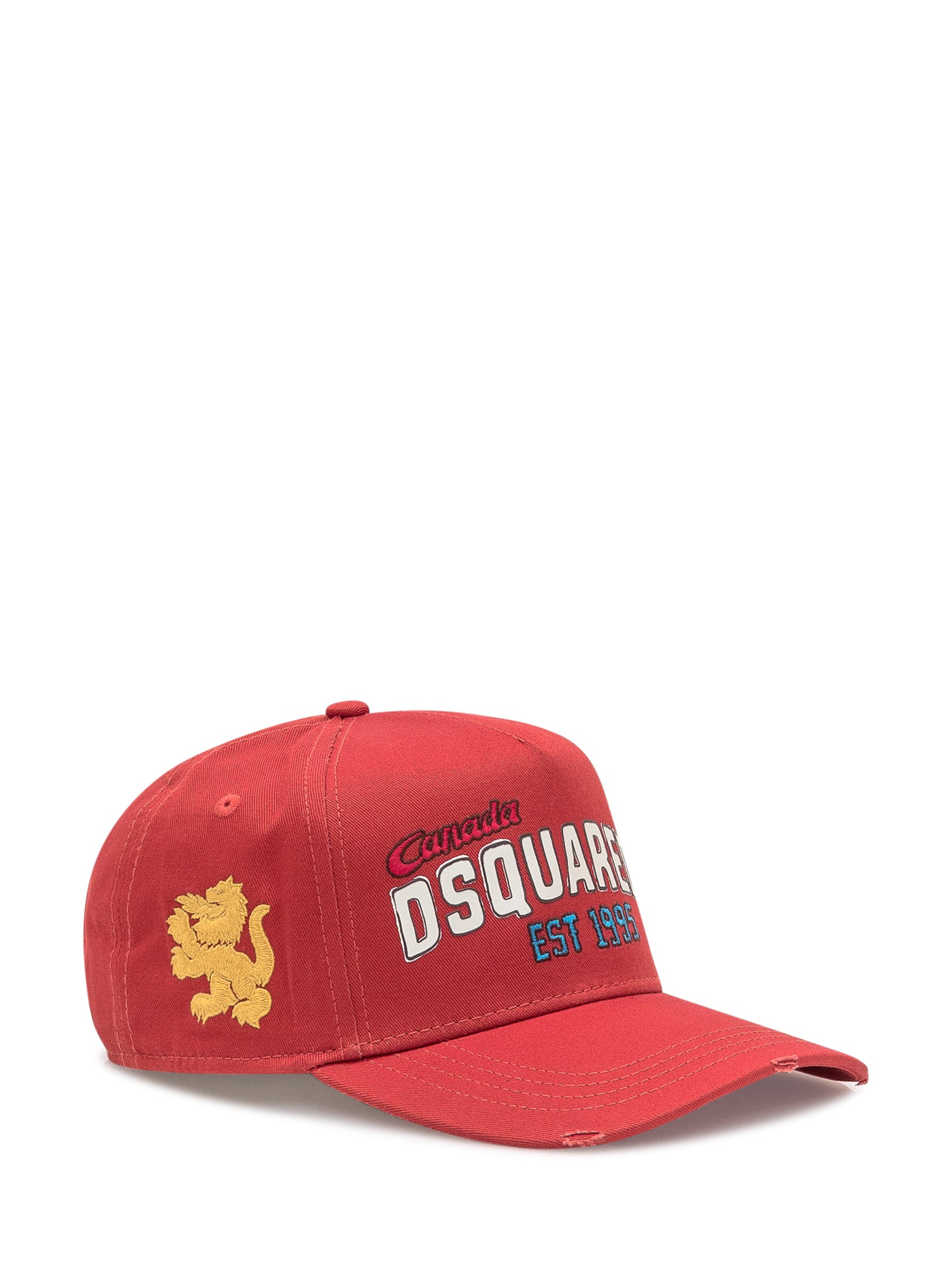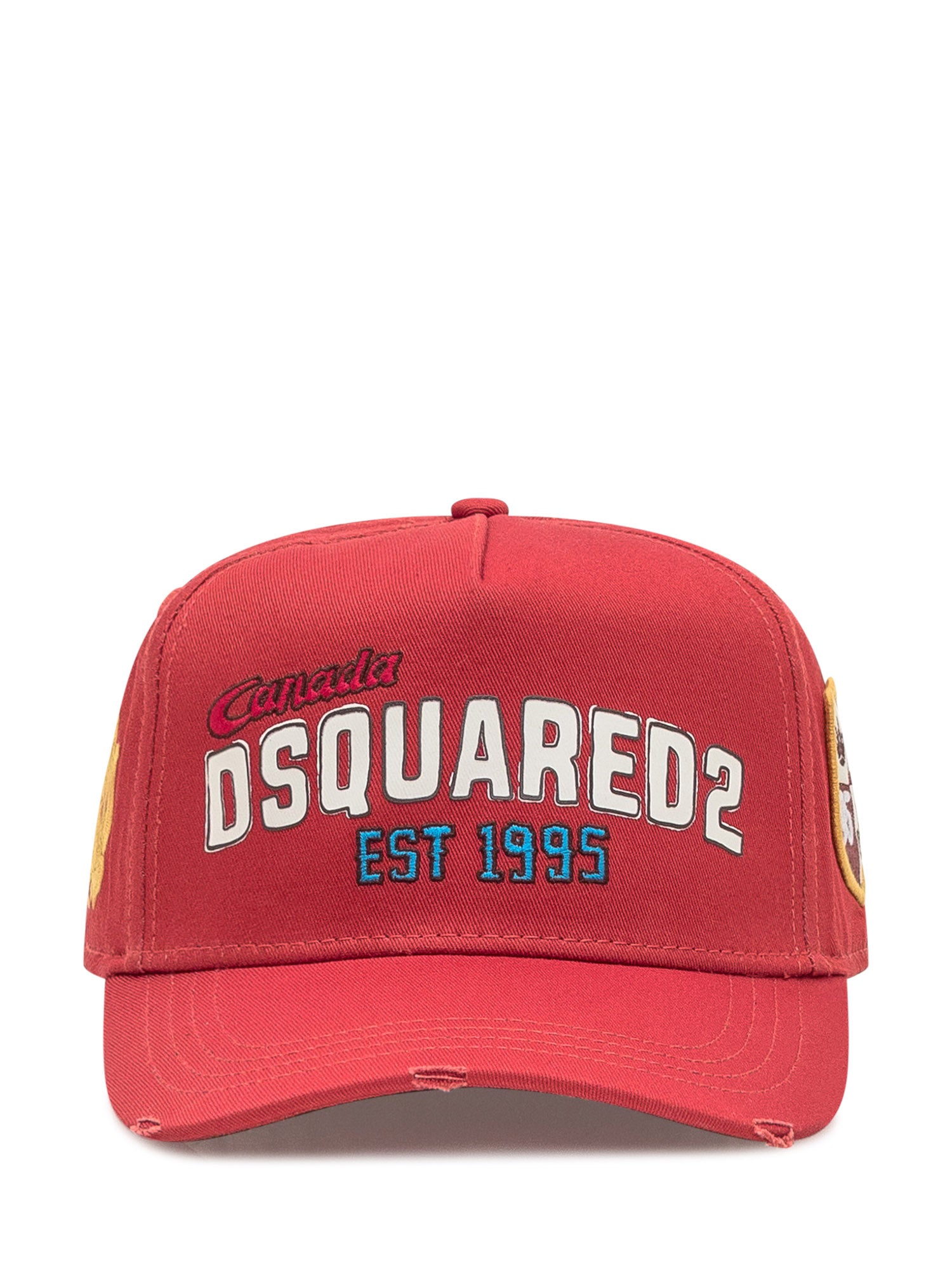 Red Dsquared2 cap in cotton with embroidered logo and side patches. Curved brim with distressed details. Adjustable back strap.