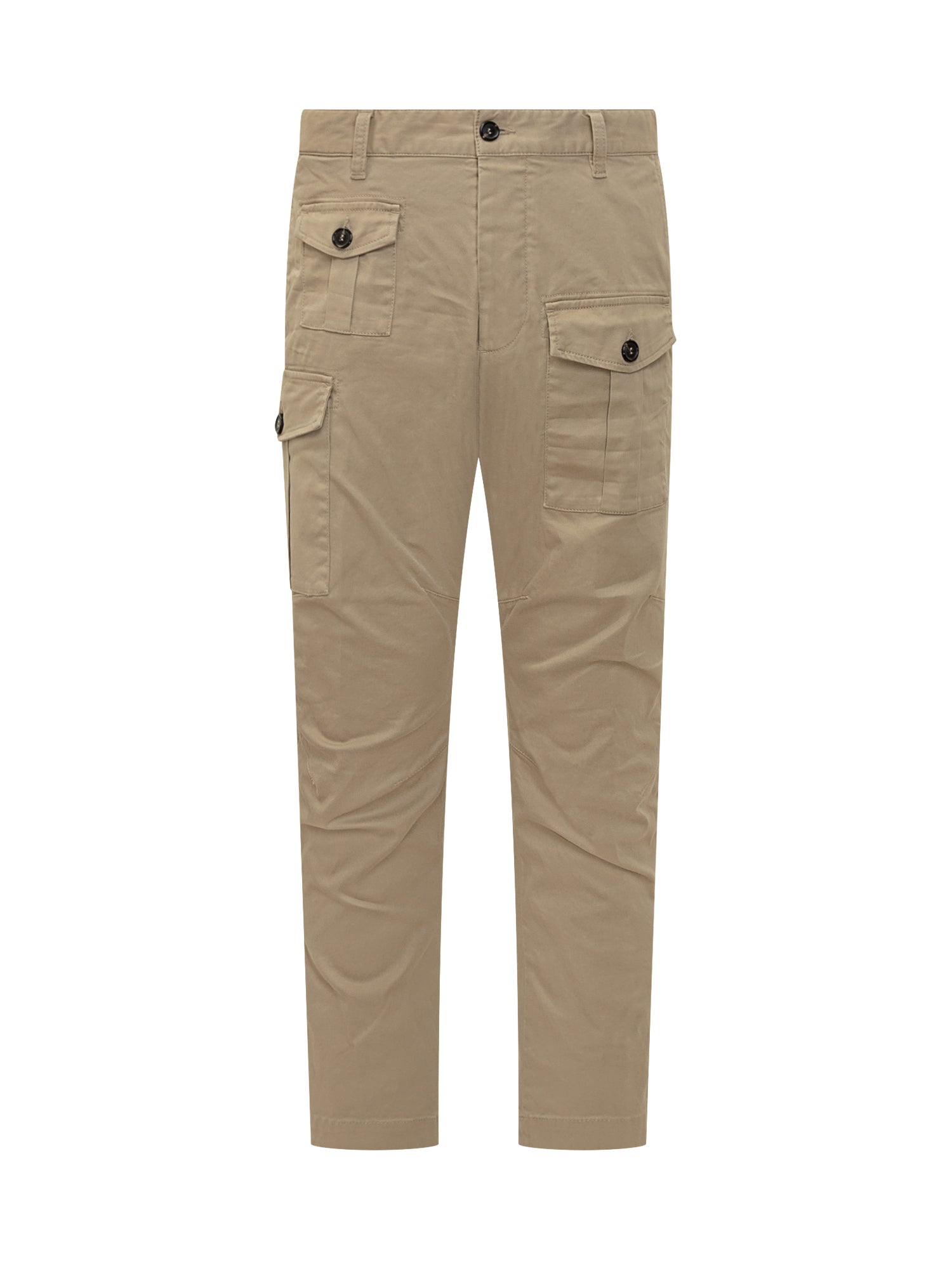 Dsquared2 men's cargo trousers in beige stretch cotton. Slim fit, side flap pockets with buttons, front zip and button closure.