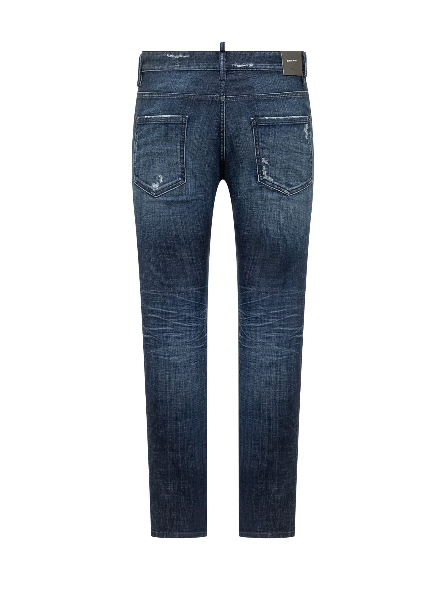Dsquared2 jeans in dark-wash denim with distressed details and used effect. Slim fit with iconic logo patch on the leg.