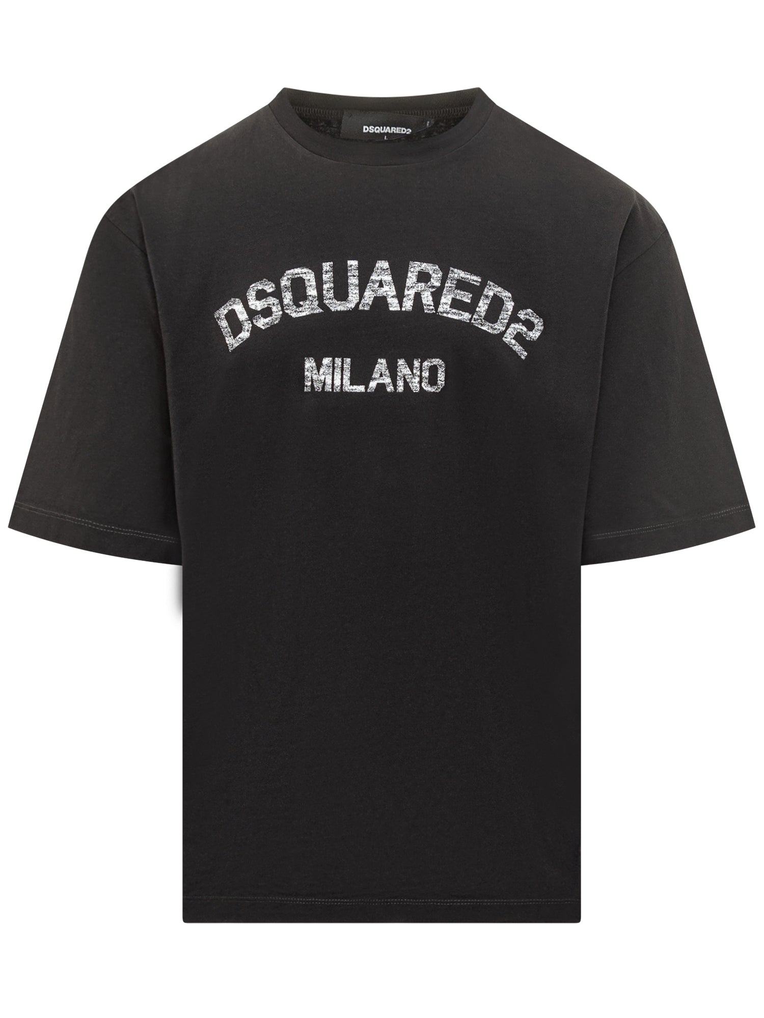 Dsquared2 T-shirt in pure black cotton with distressed Dsquared2 Milano print.
