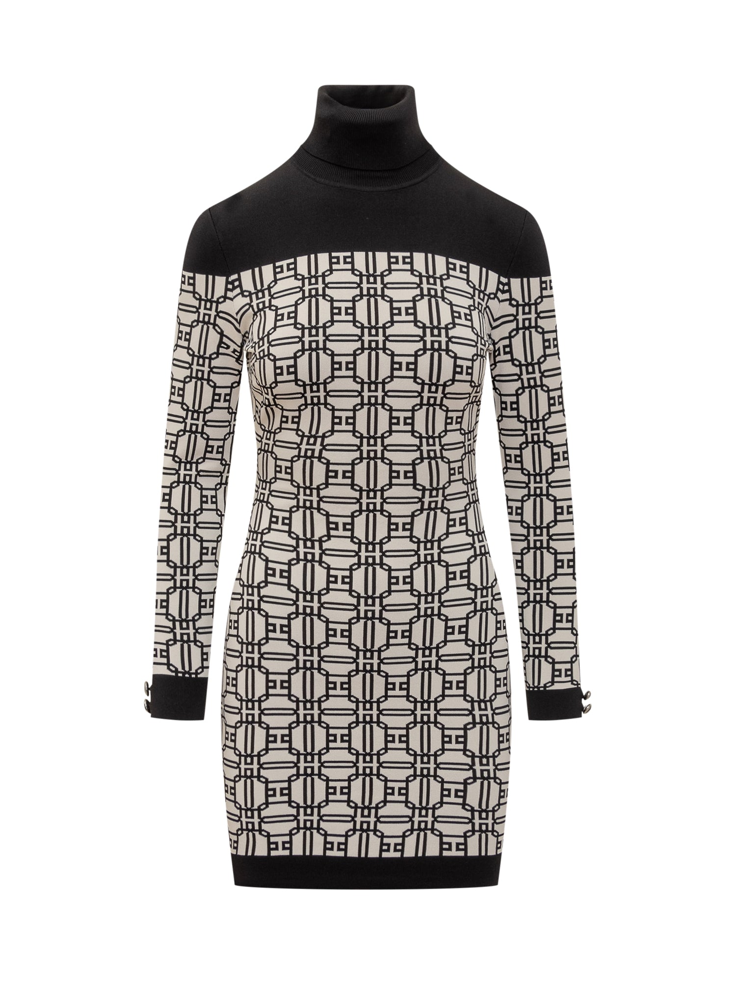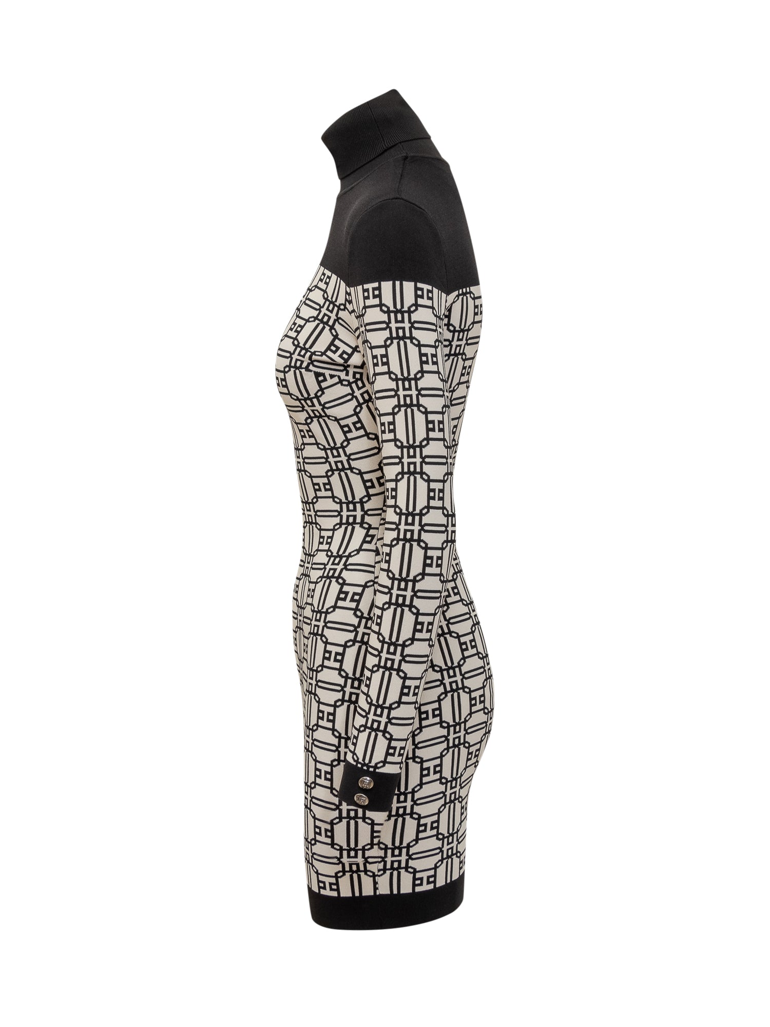 Long-sleeved knitted mini dress. High neck. Ribbed hem. Cuffs with buttons. Jacquard logo all over.