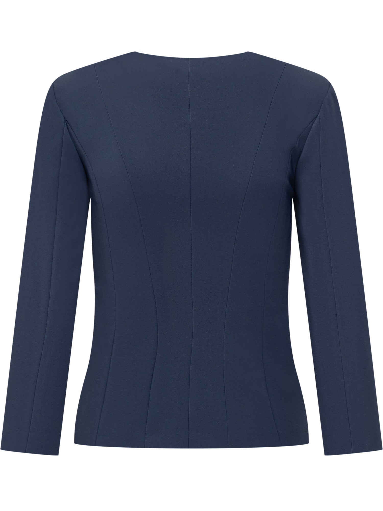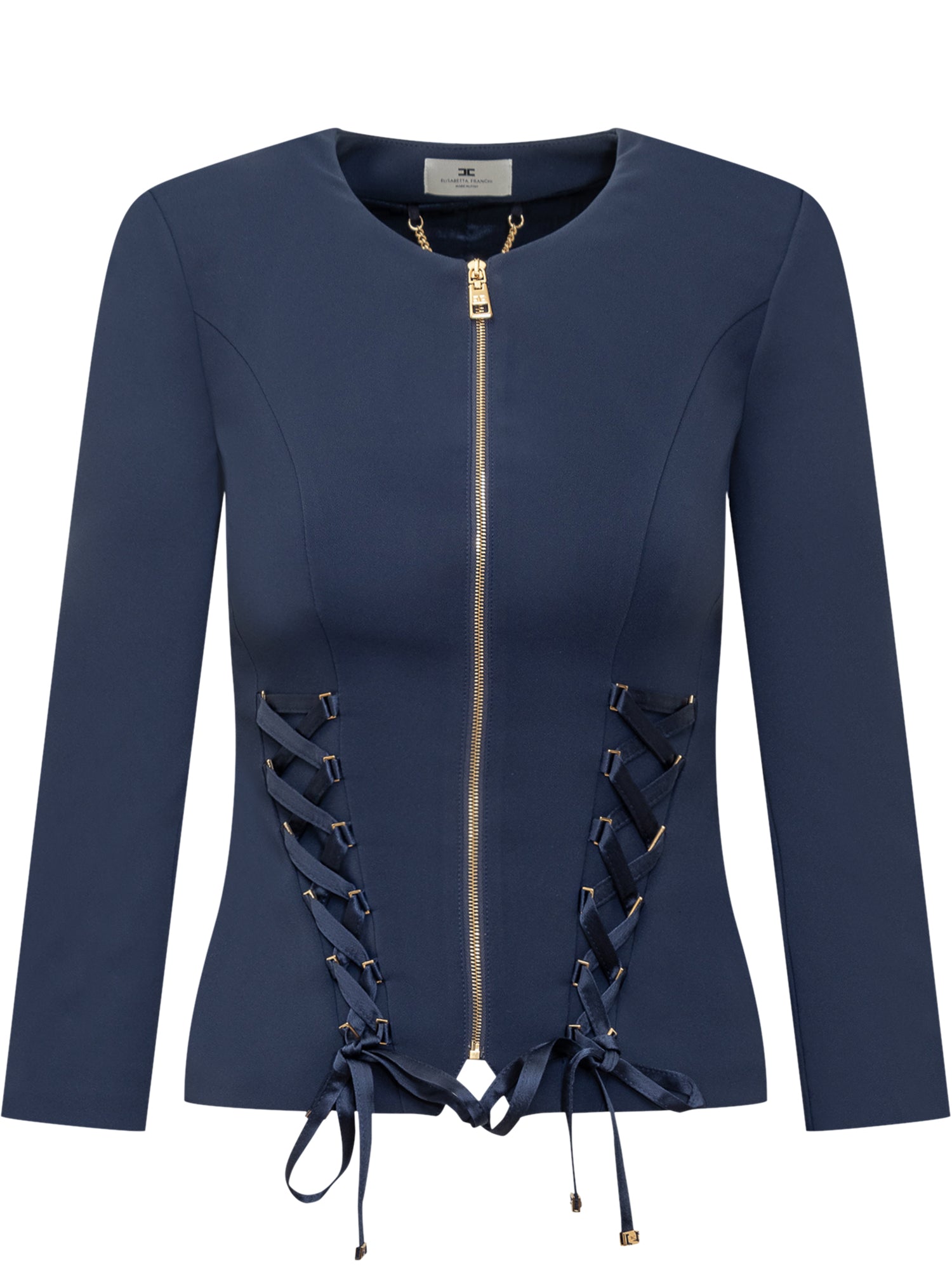 Blue blazer. Crew neck. Zipper closure. Ribbons at front.