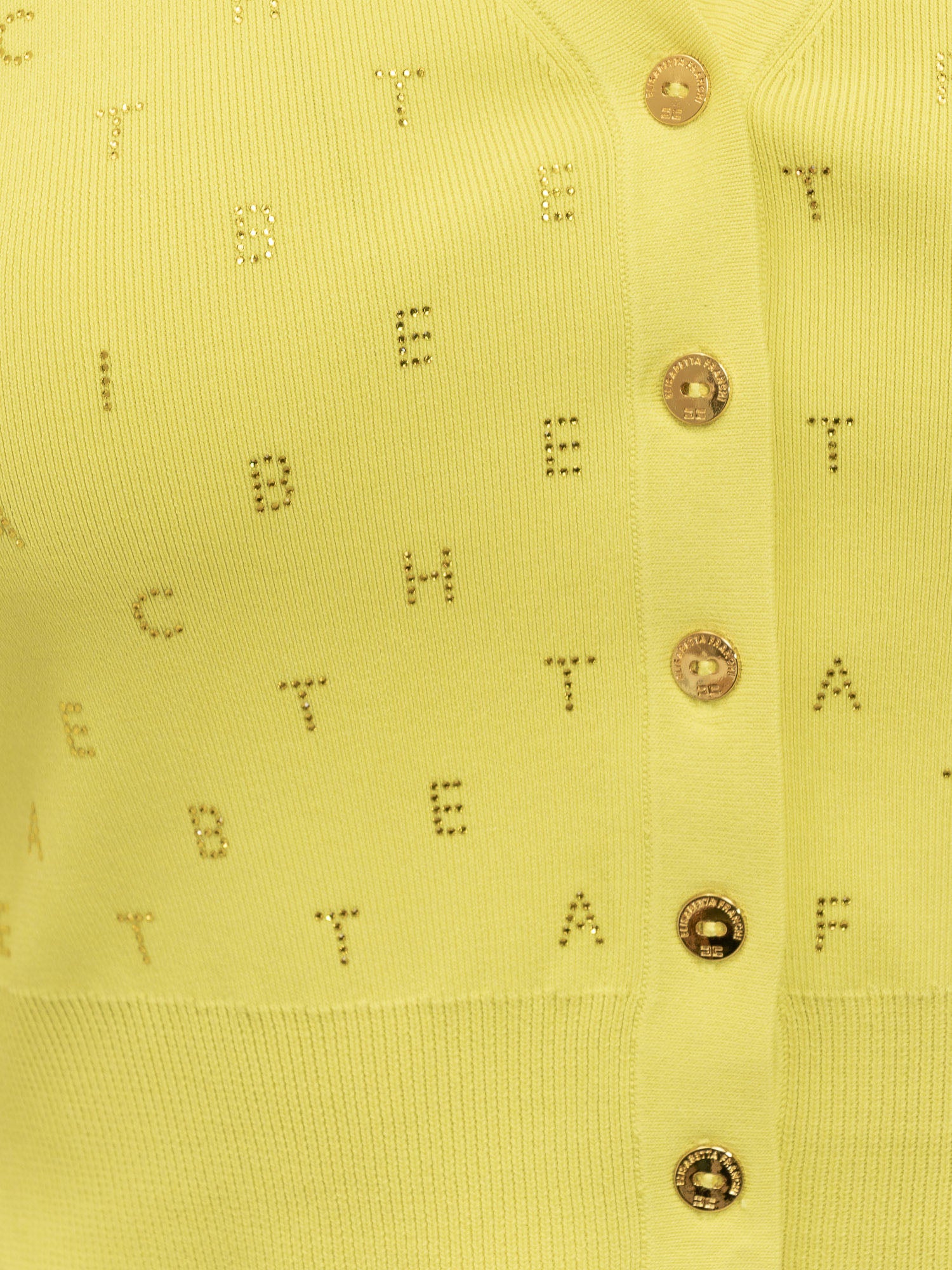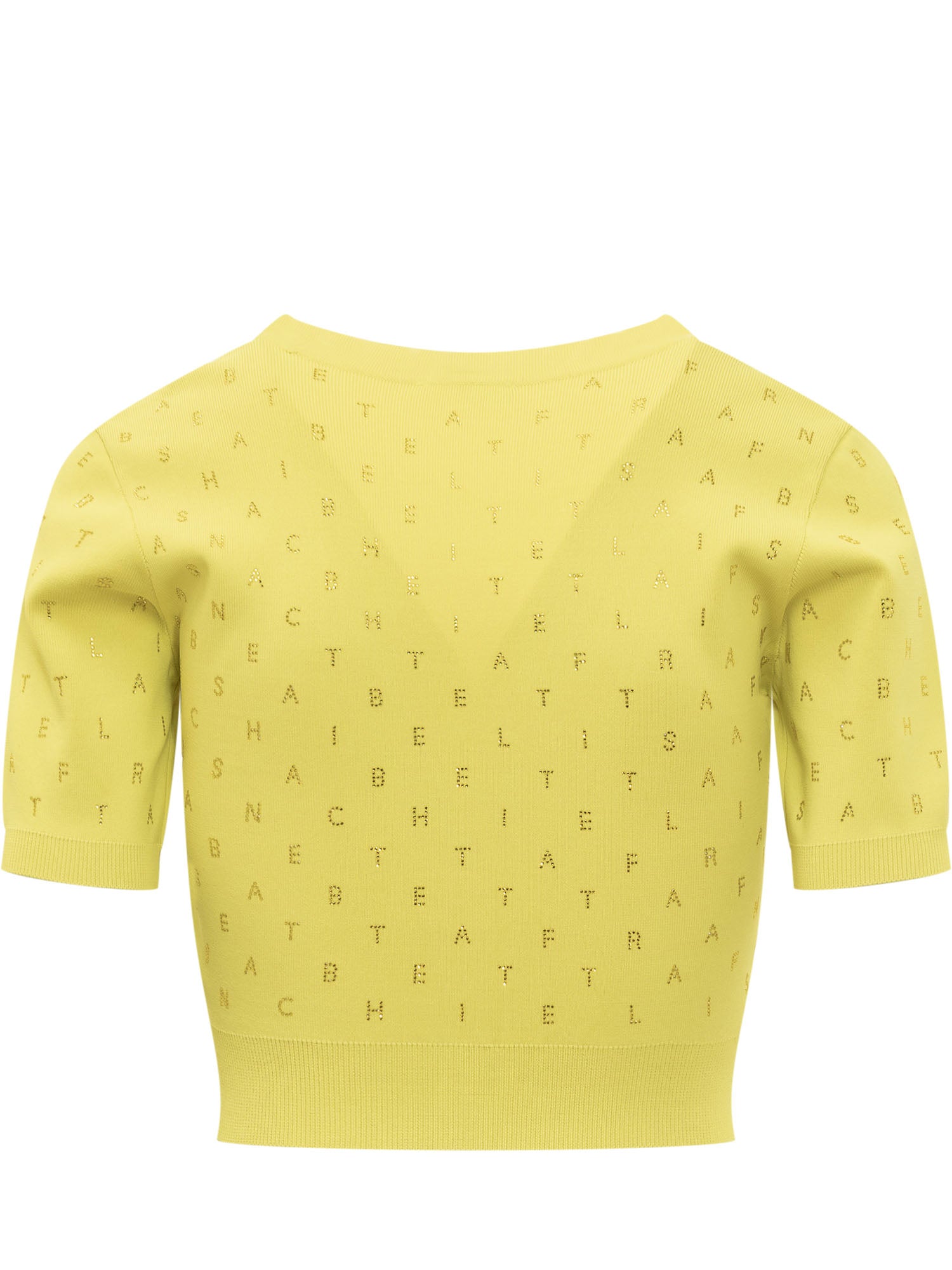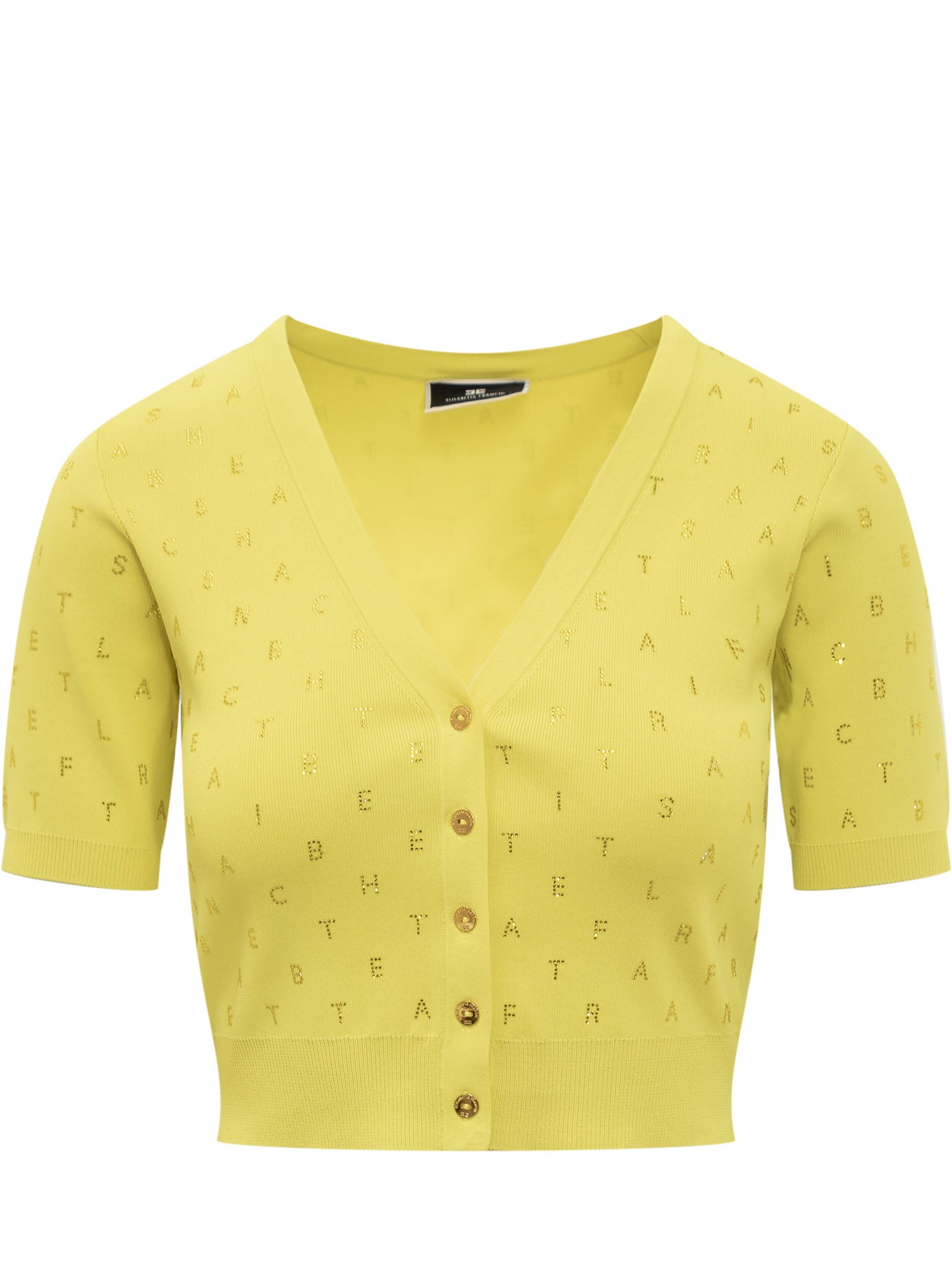 Cropped cardigan in stretch viscose. V-neck. Ribbed hems. Button closure. All-over rhinestone lettering pattern.