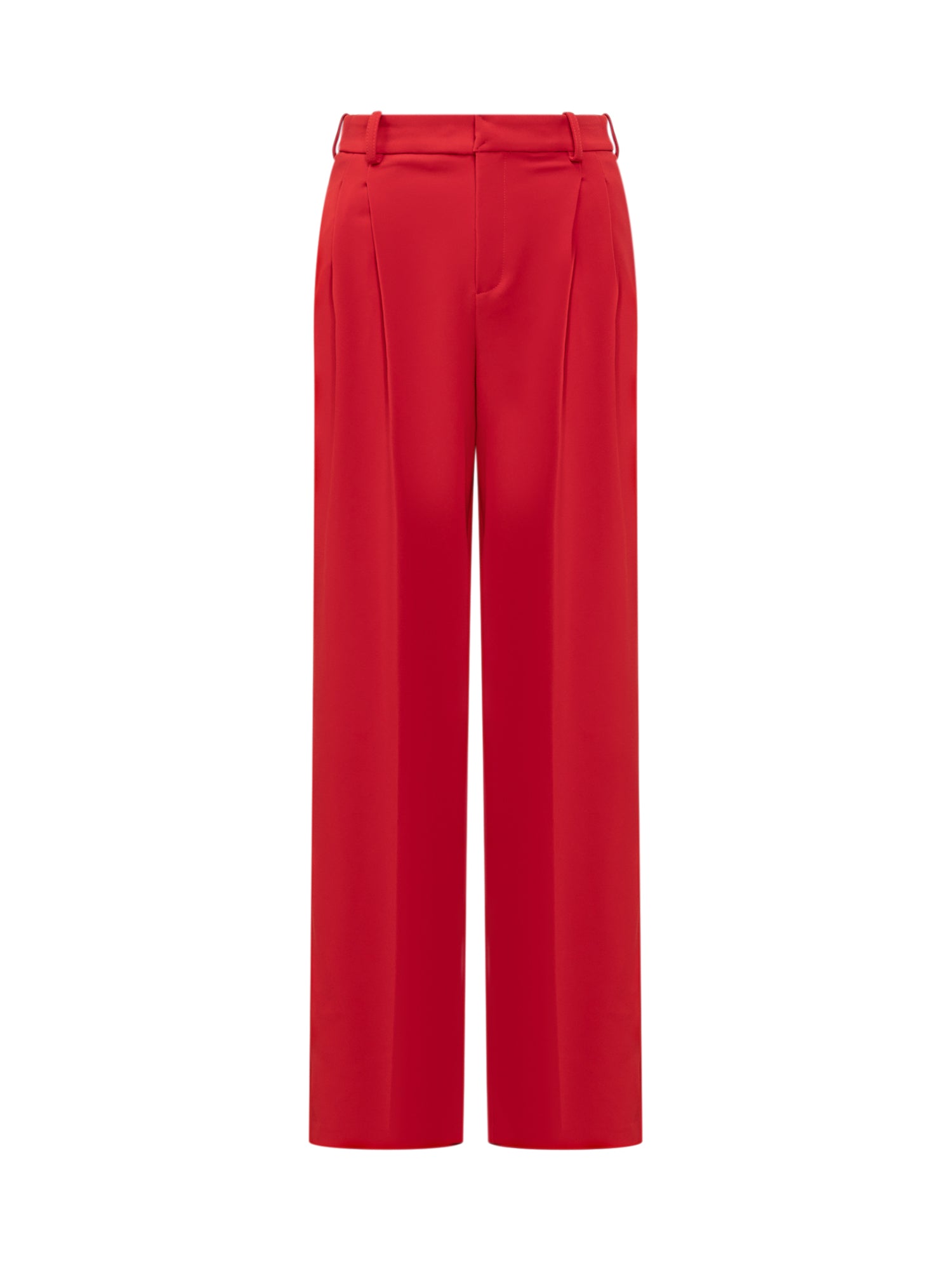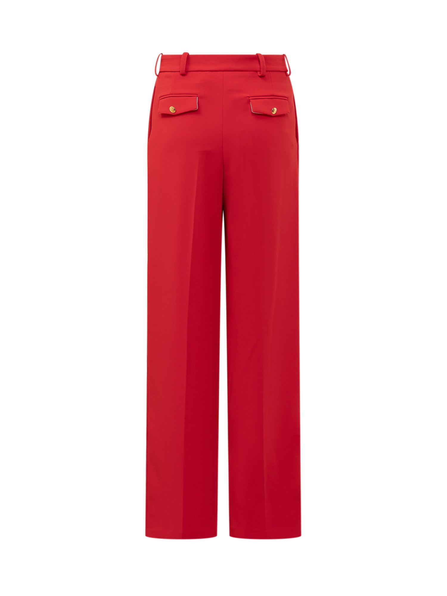 Straight trousers in stretch crêpe. Zip fastening on the side. Belt loops. Double pleats on the front. Flap pockets on the back with gold metal buttons.