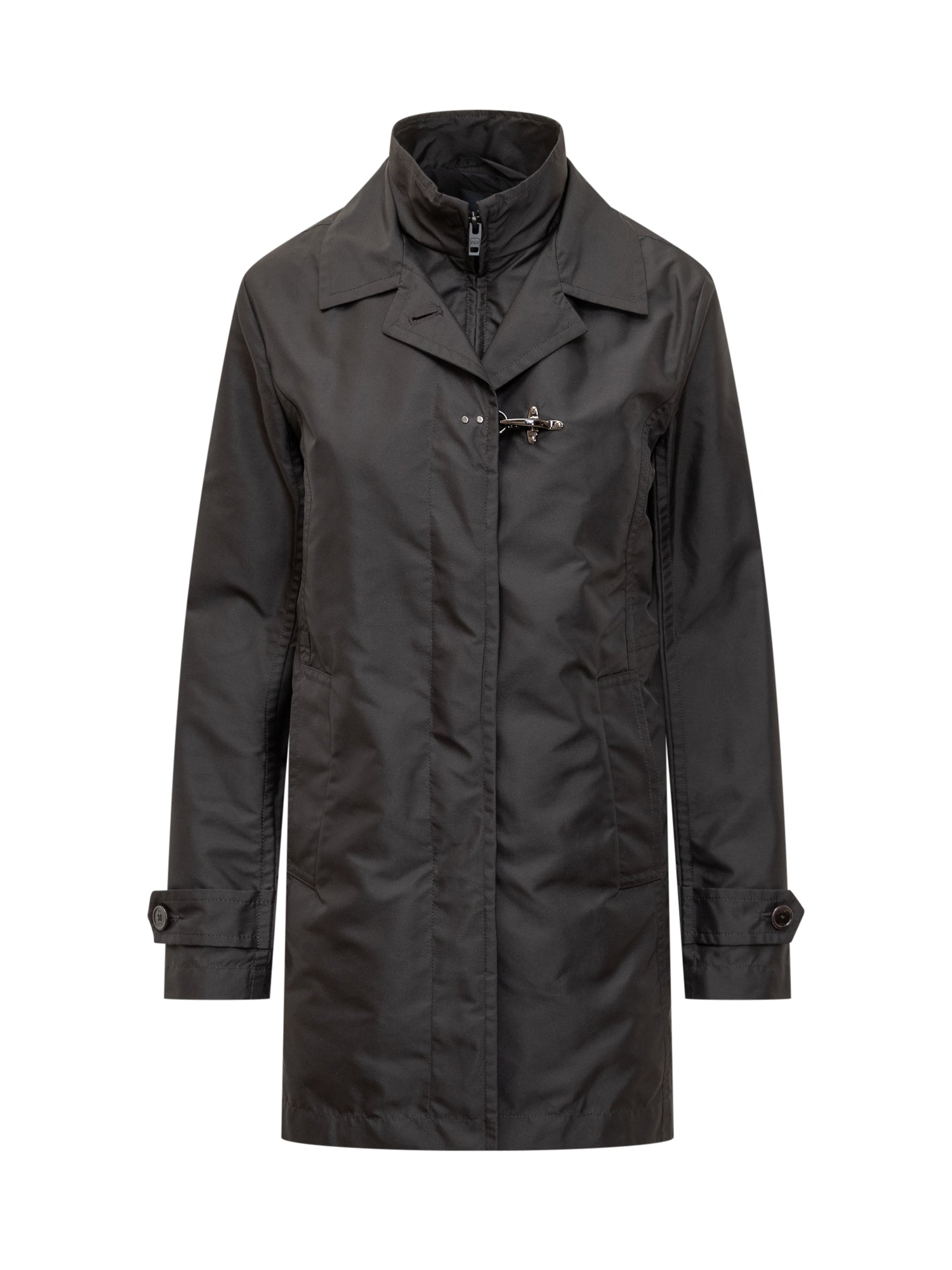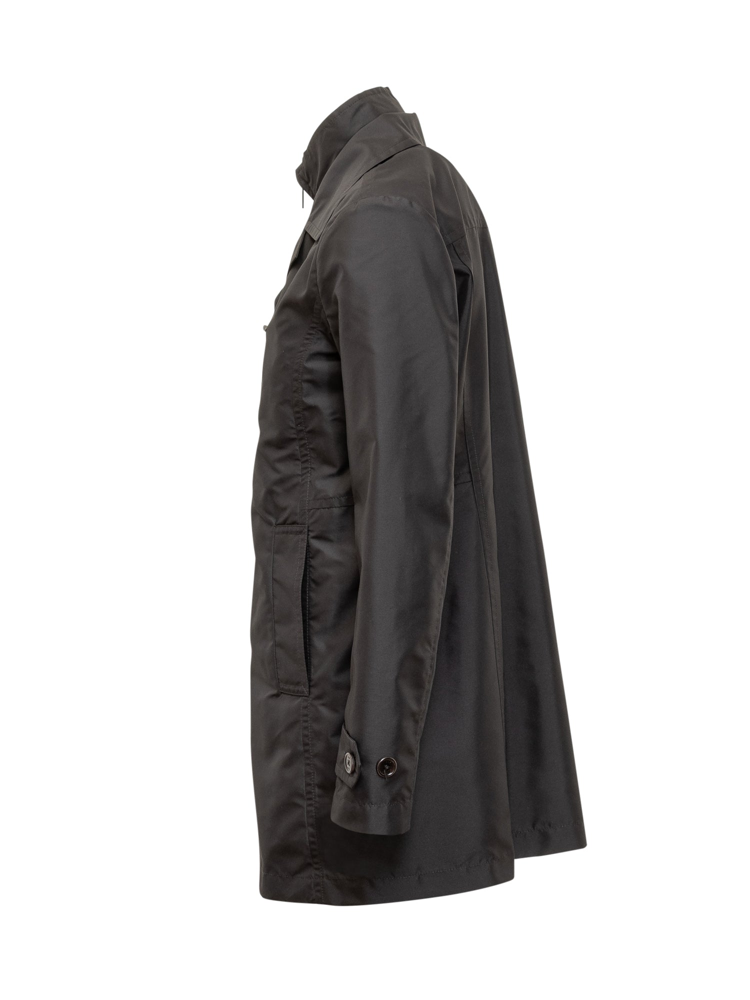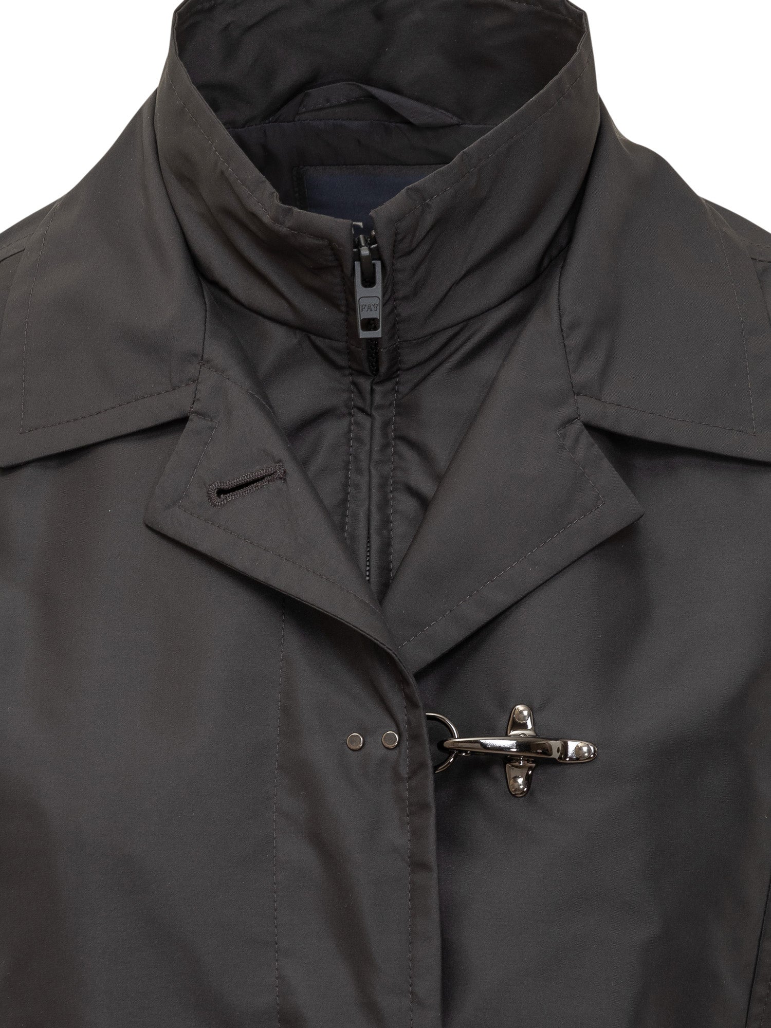 Closure with buttons, zip and hook. Pockets with sewn flap. High neck.