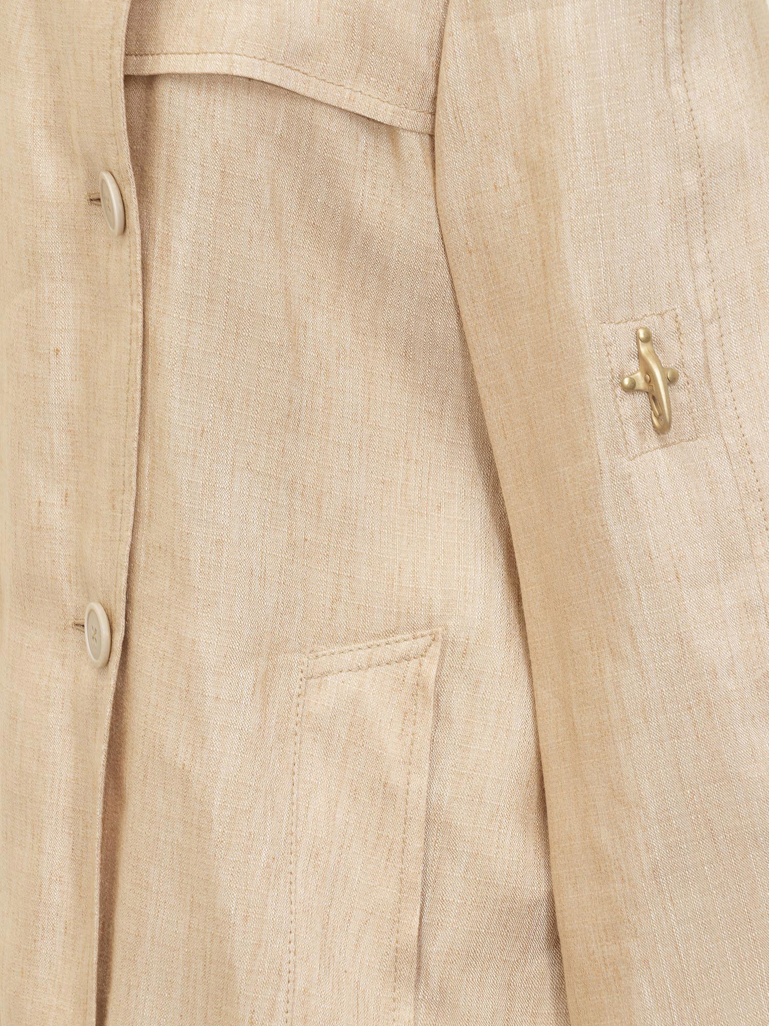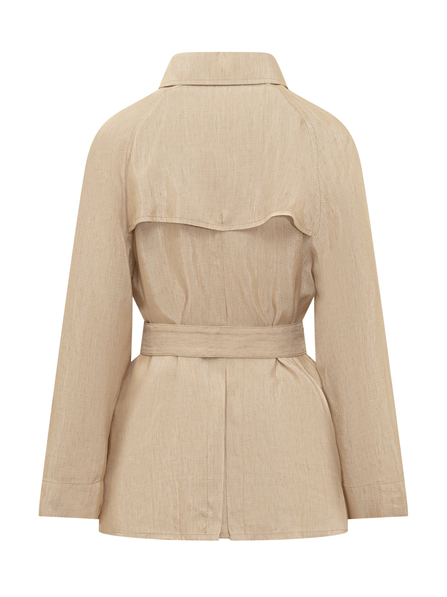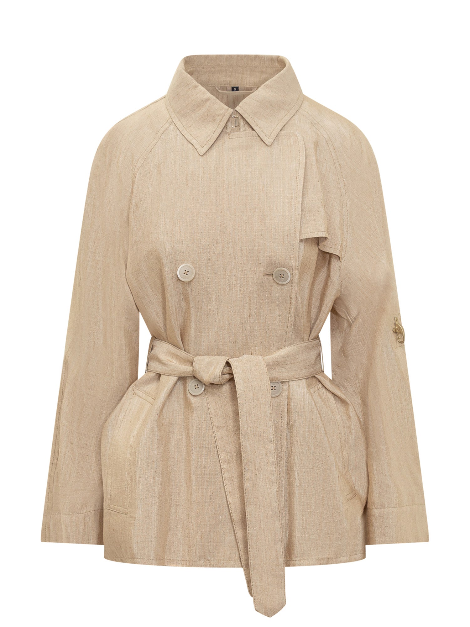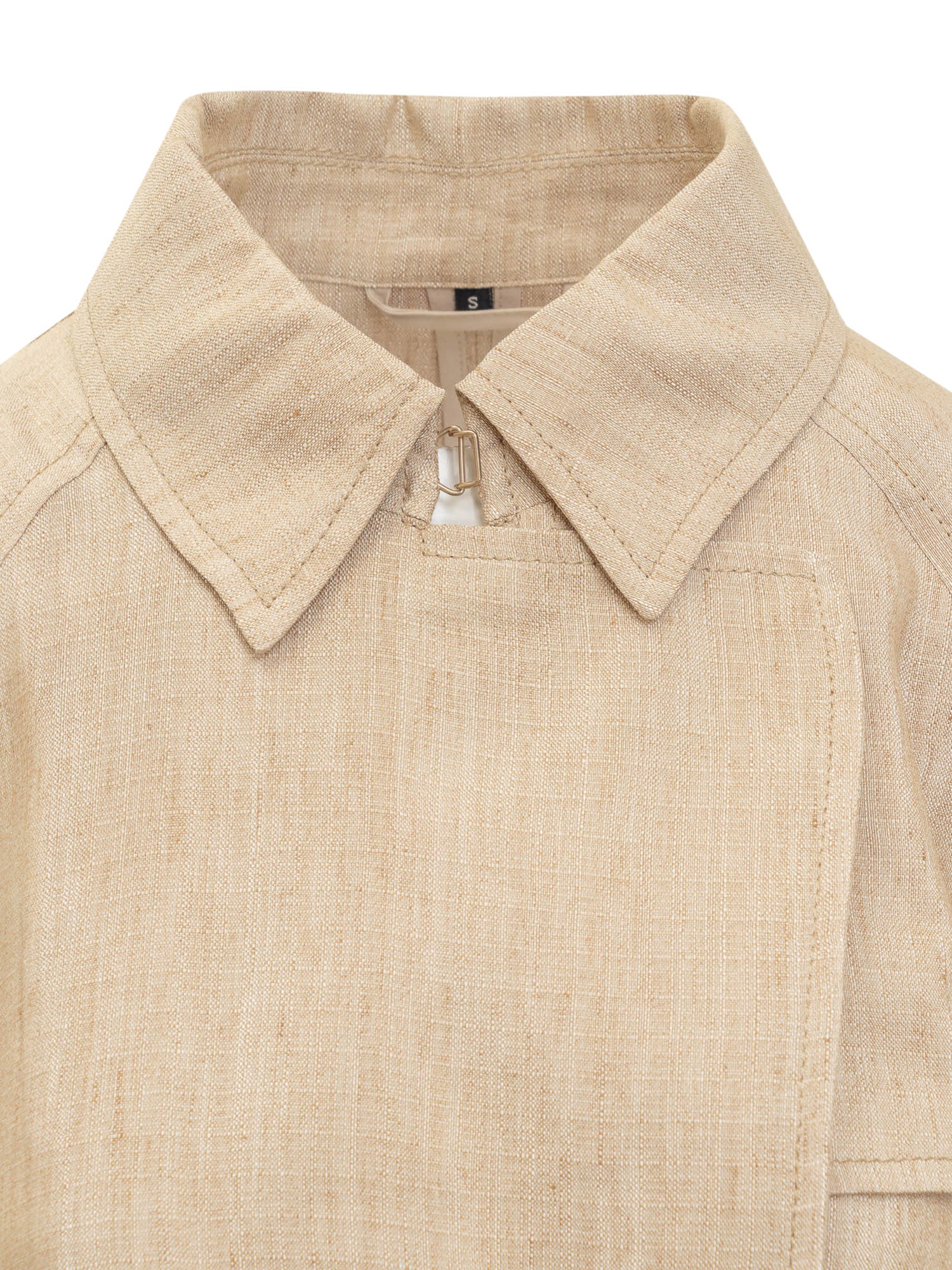 Short double-breasted trench coat with long sleeves. Crew neck. Classic collar. Button fastening. Waist belt. Two side pockets. Hook detail on sleeve.