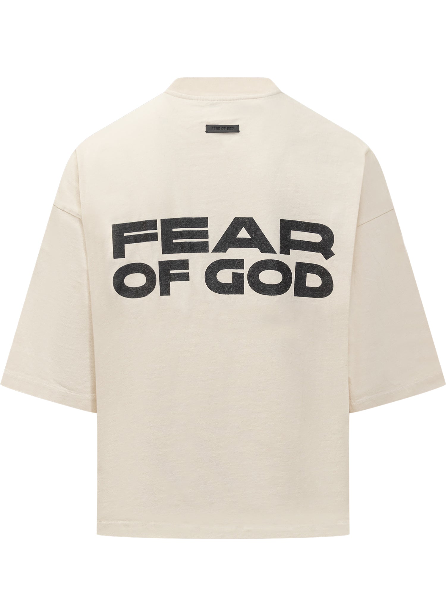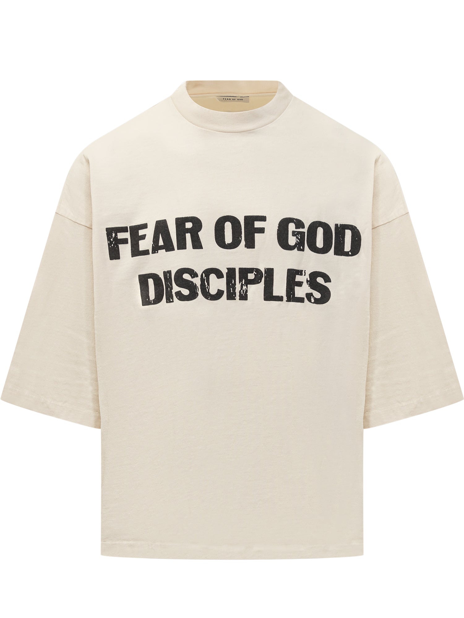 Fear of God Disciples T-shirt in ivory cotton featuring distressed graphic prints on front and back. Oversized fit and premium finish.