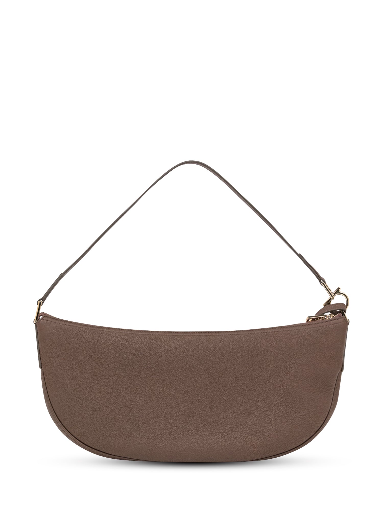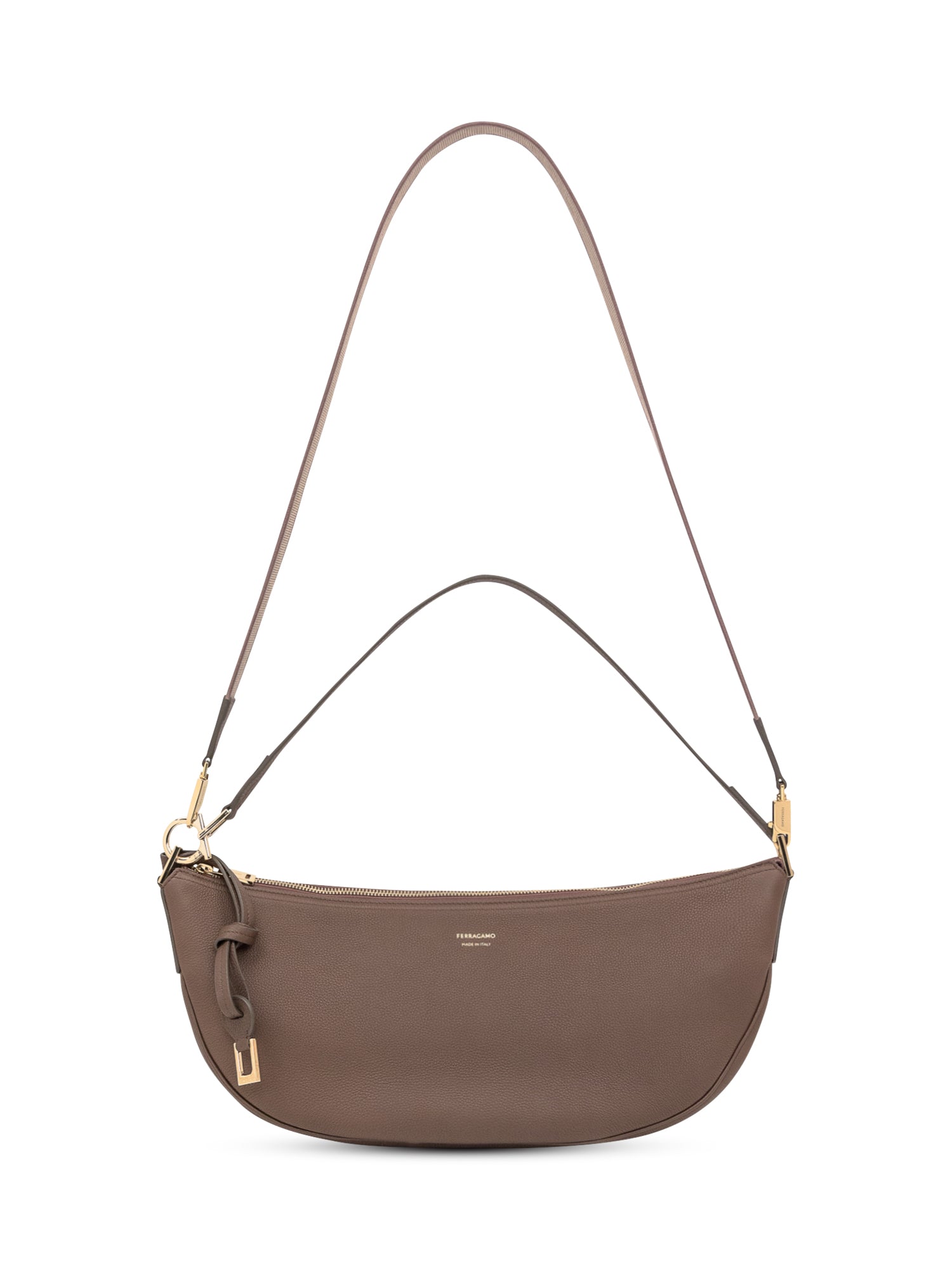 Brown half-moon bag in bottalato and hammered calfskin. Opening with metallic zip. Leather shoulder strap with carabiner