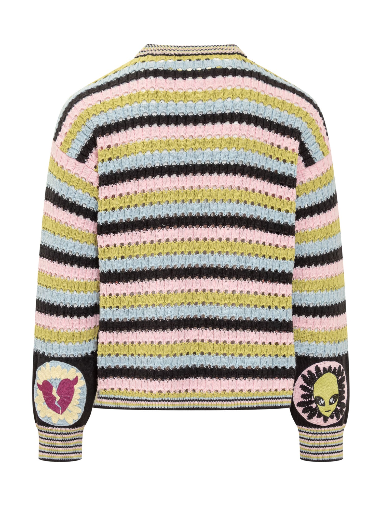 Multicolored sweater. Crew neck. Ribbed collar, hem and cuffs. All-over crochet. Embroidered logo on the front. Embroidered patch on the sleeves.