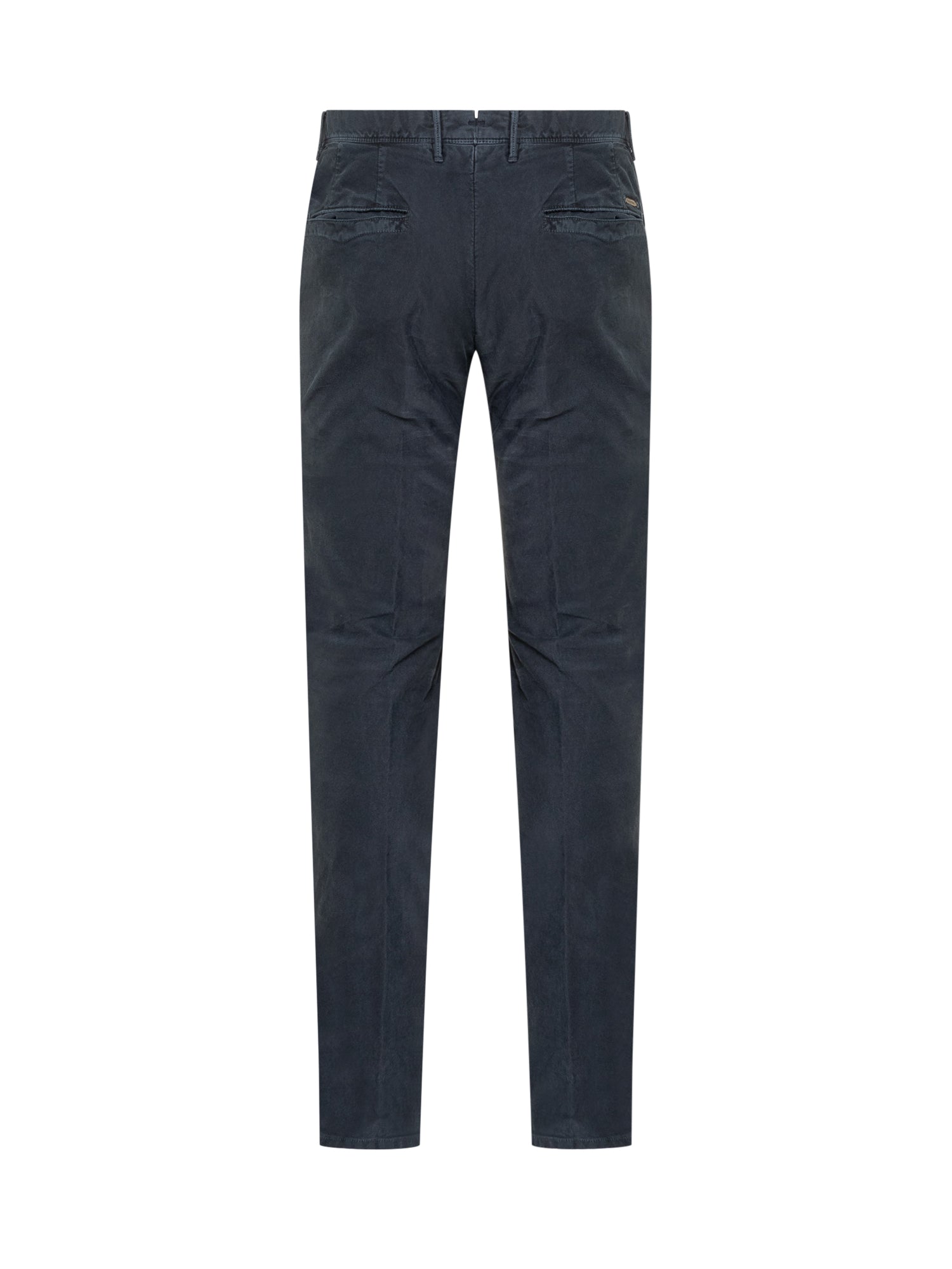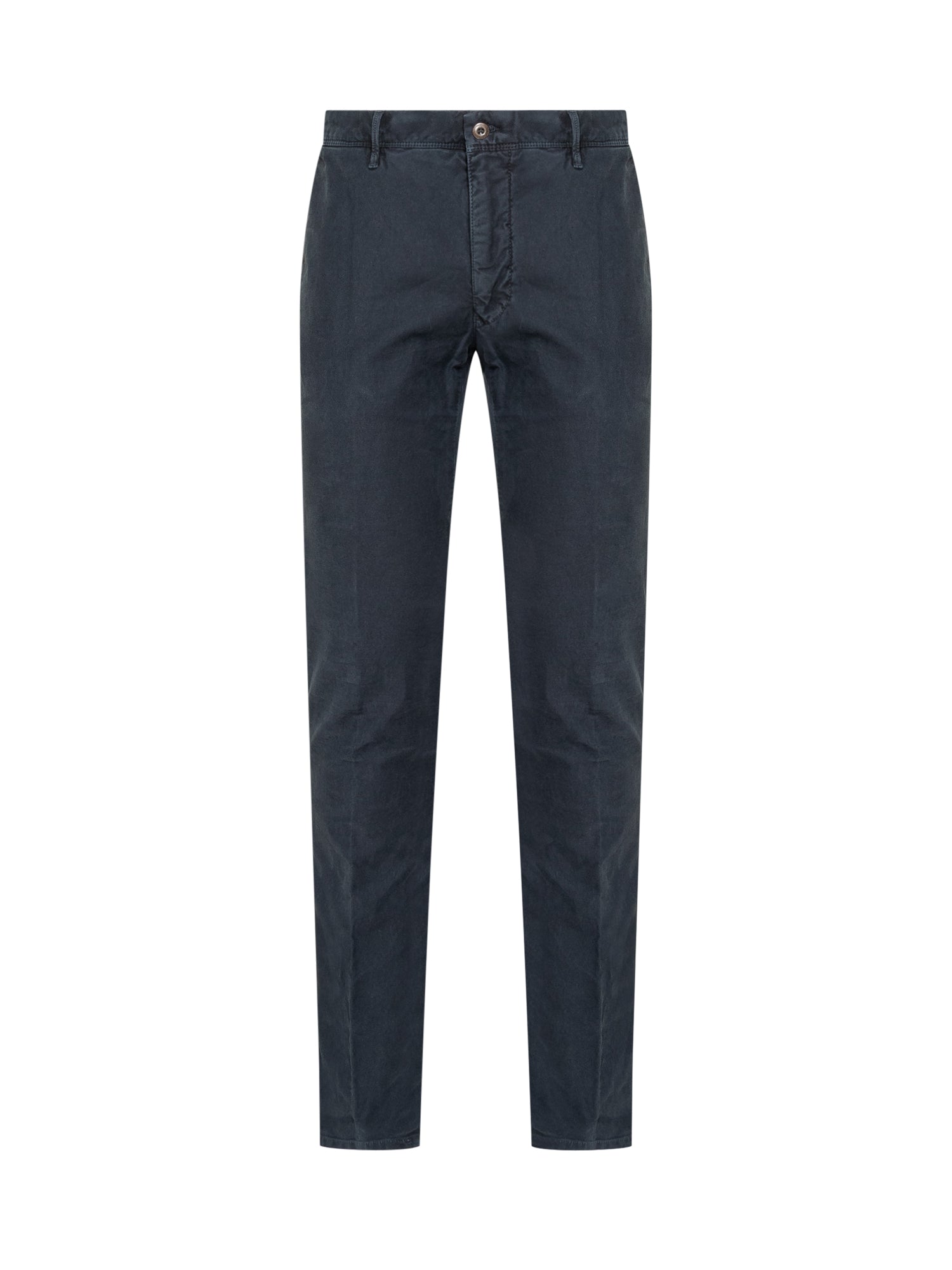 Long trousers. Zip and button closure. Belt loops. Four pockets.