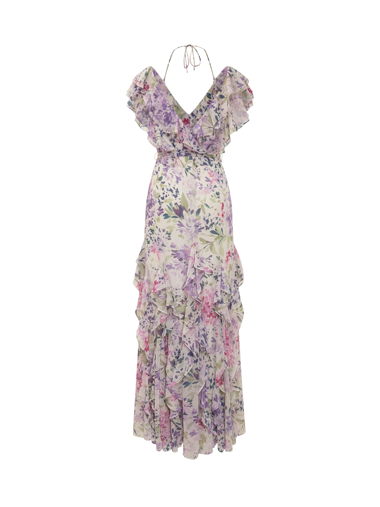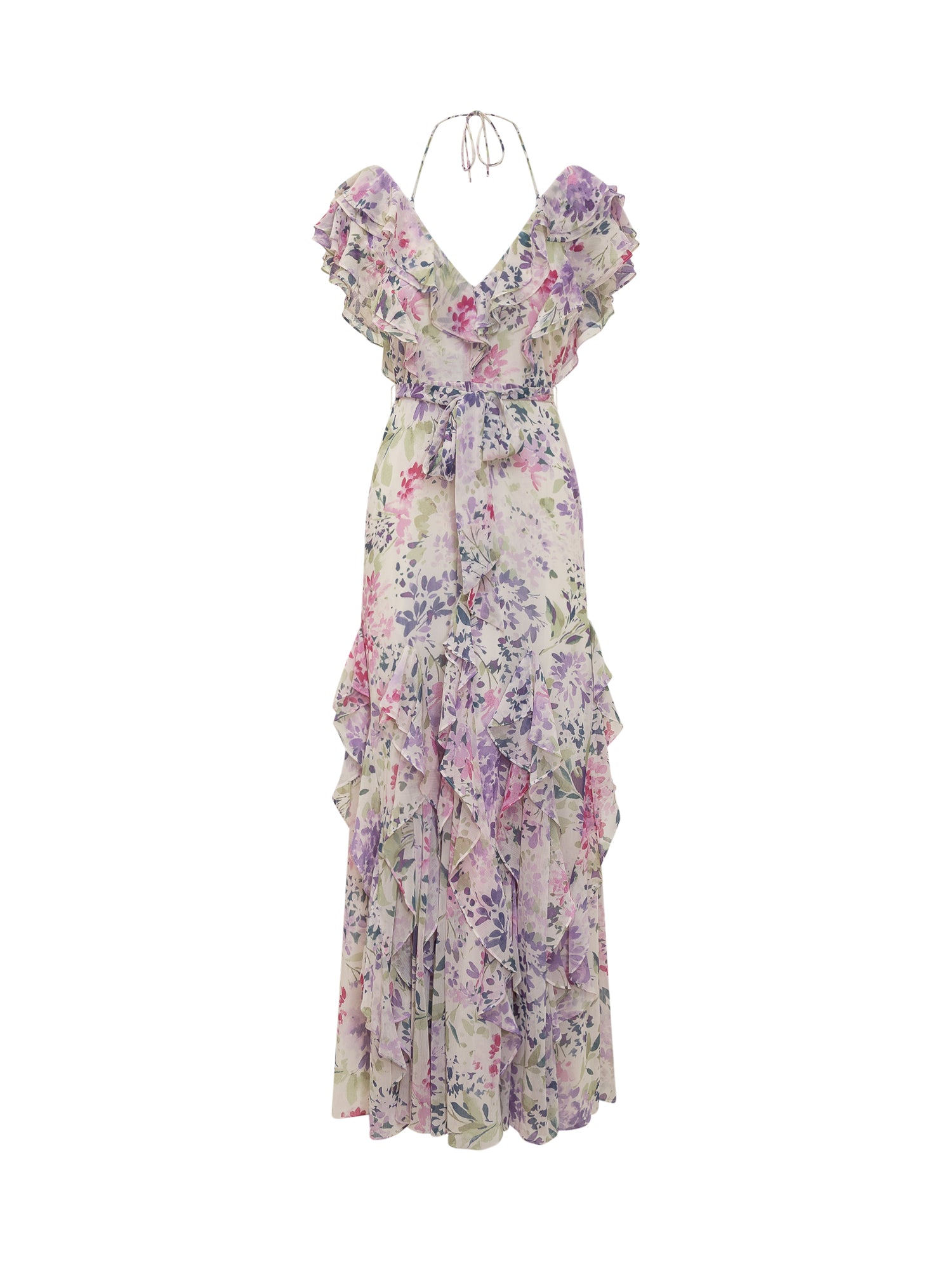 Long georgette dress. Sleeveless. Ruffled fabric. V-neckline on front and back. Adjustable shoulder strap. Flower print.