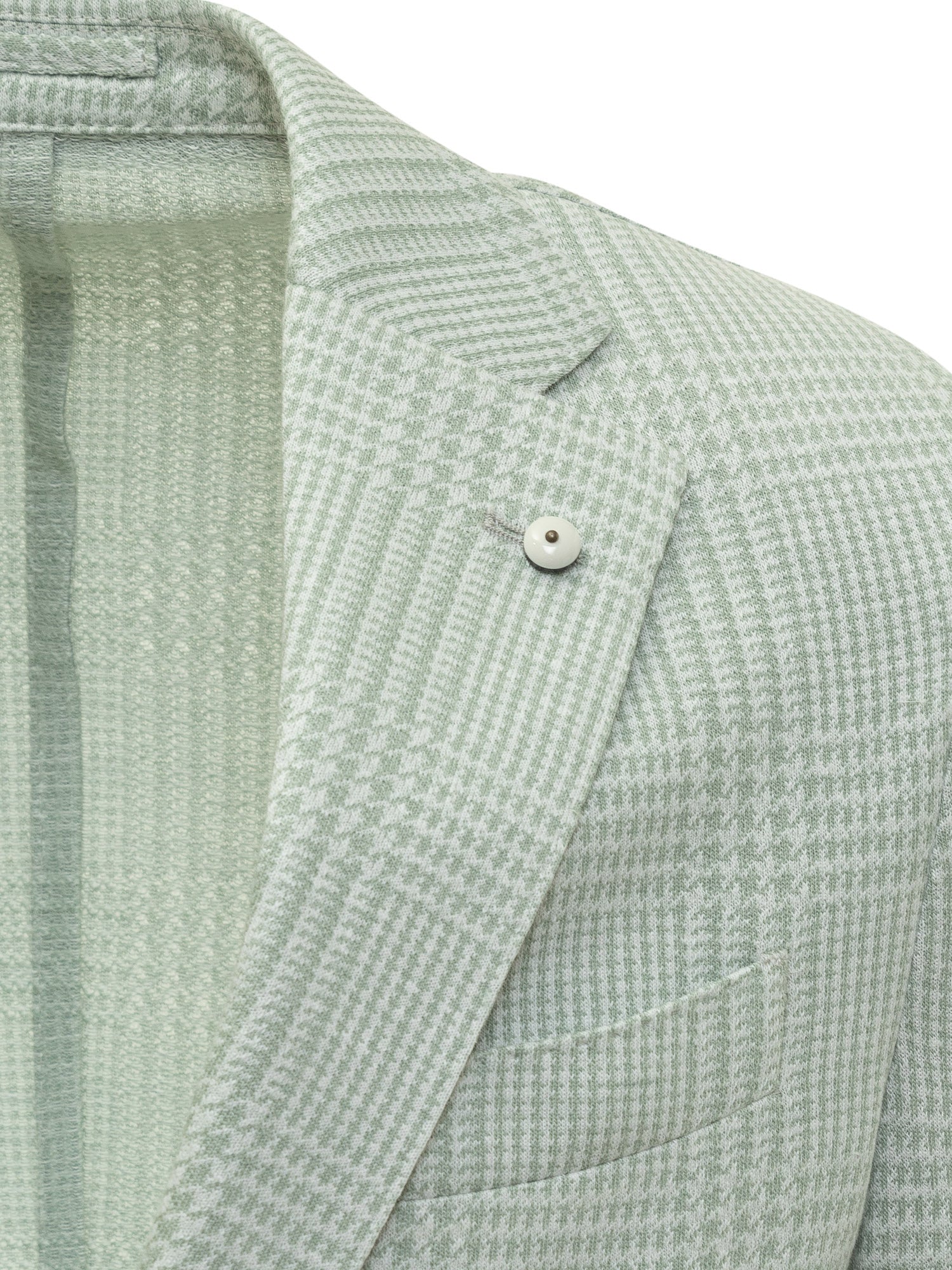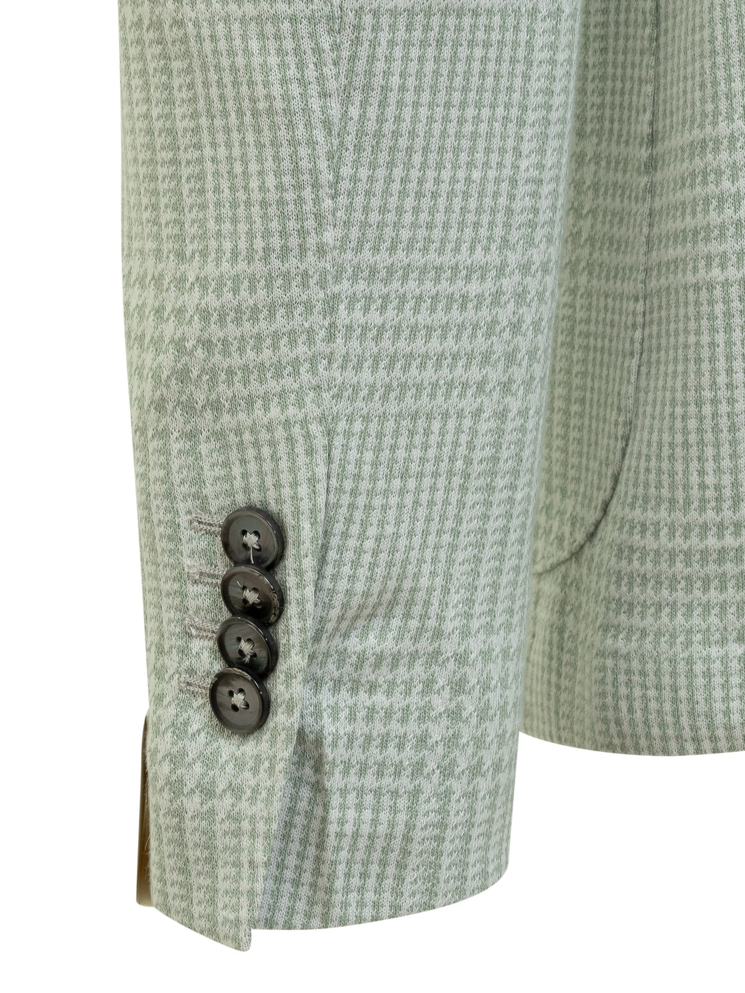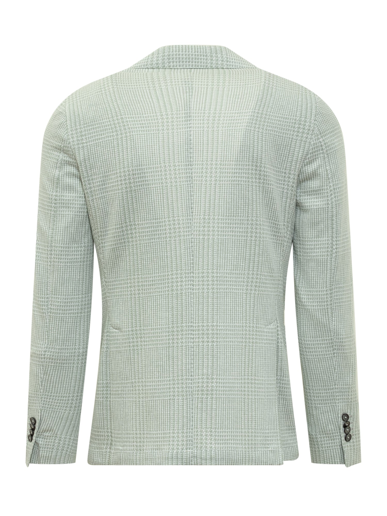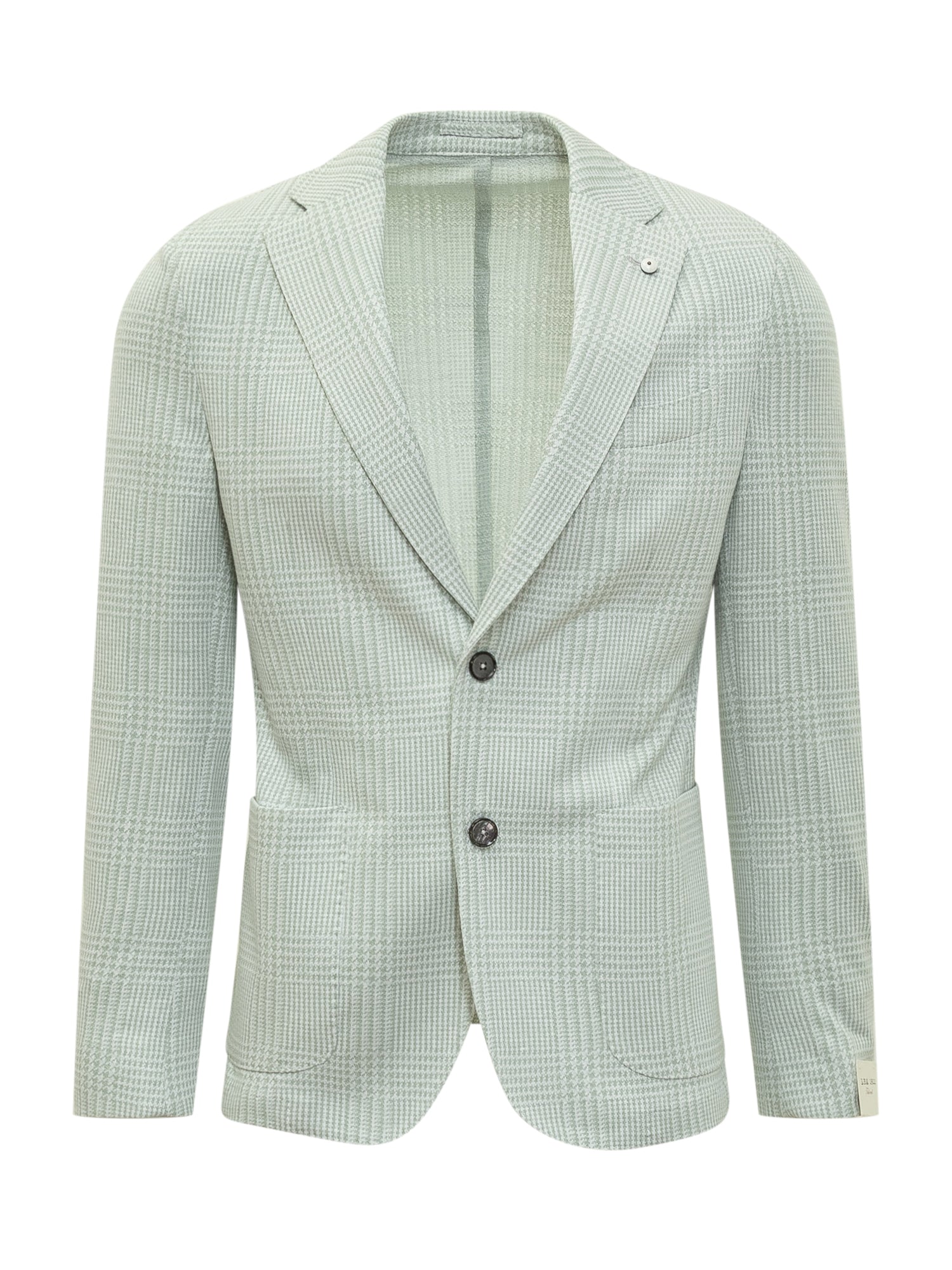Cotton-linen blend long-sleeved jacket. Lapel collar with button detail. Single-breasted button closure. Button cuffs. Two pockets on front. Breast pocket. Slits on back. Logo plaque on bottom sleeve. All over houndstooth pattern.