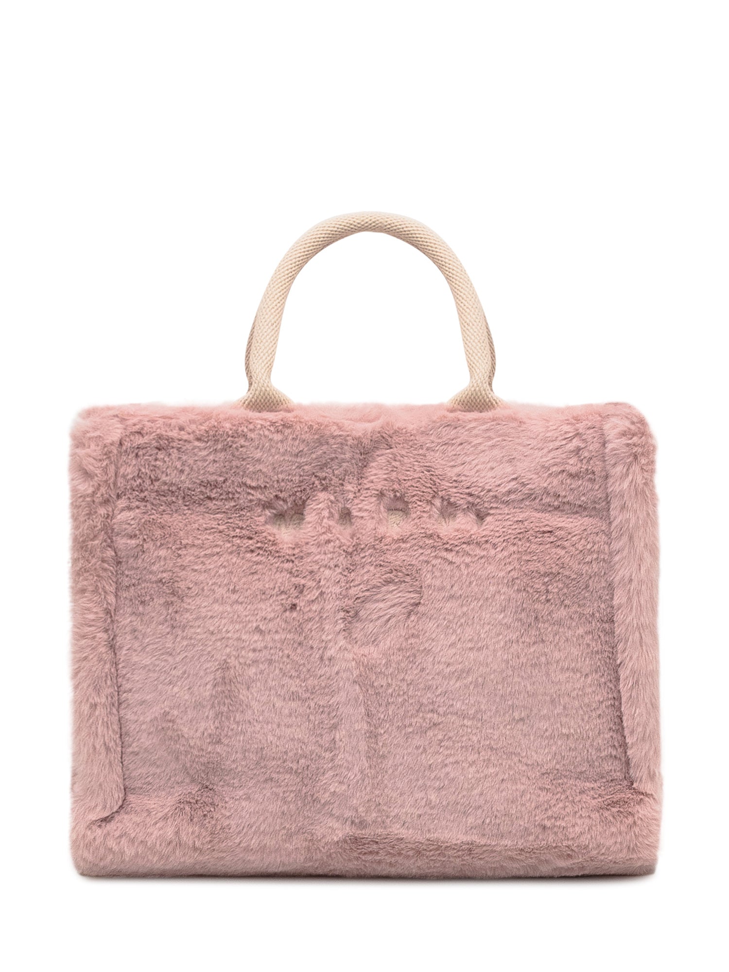 Soft pink faux fur tote by Marni with contrast fabric handles and boxy design.