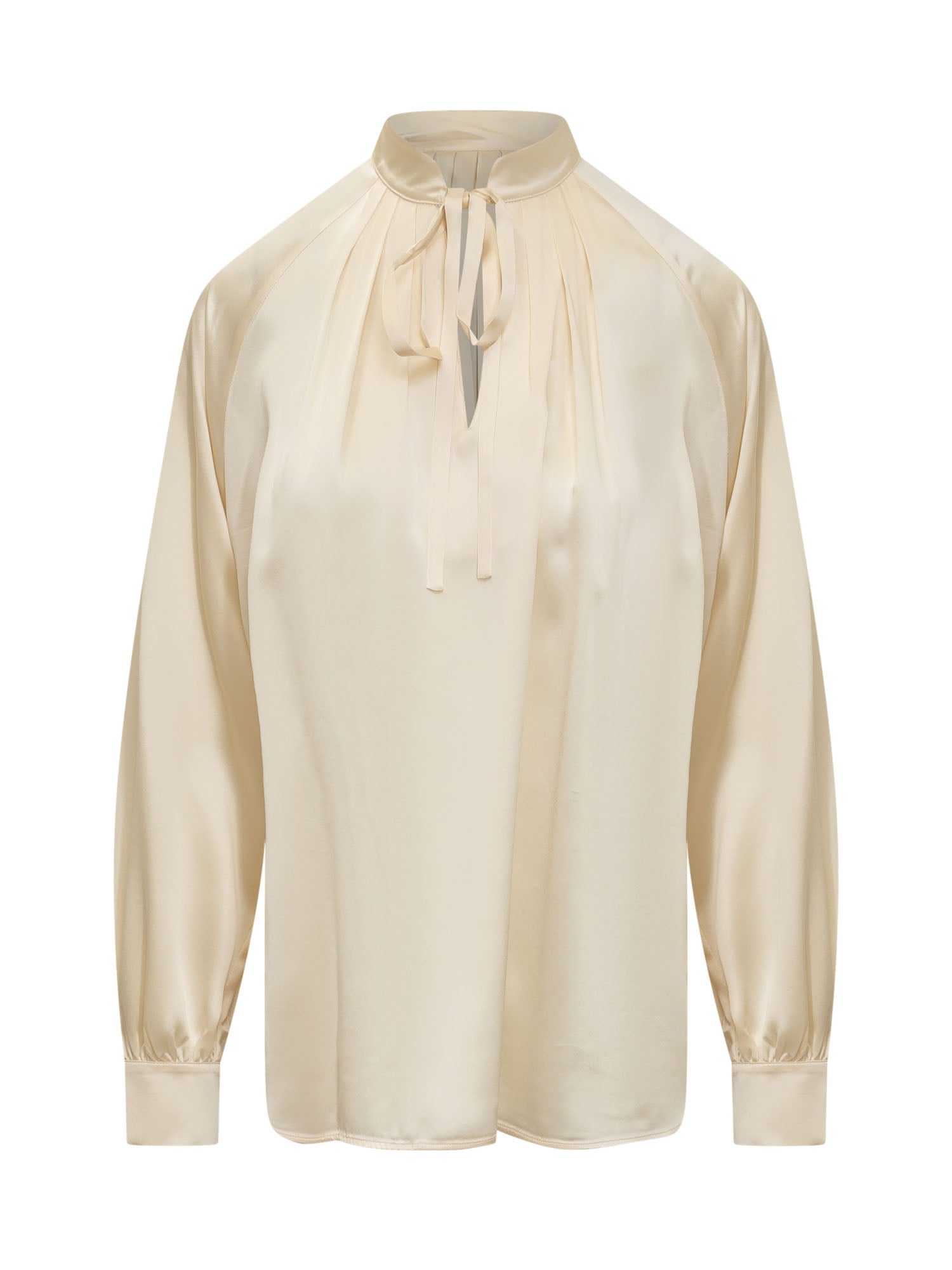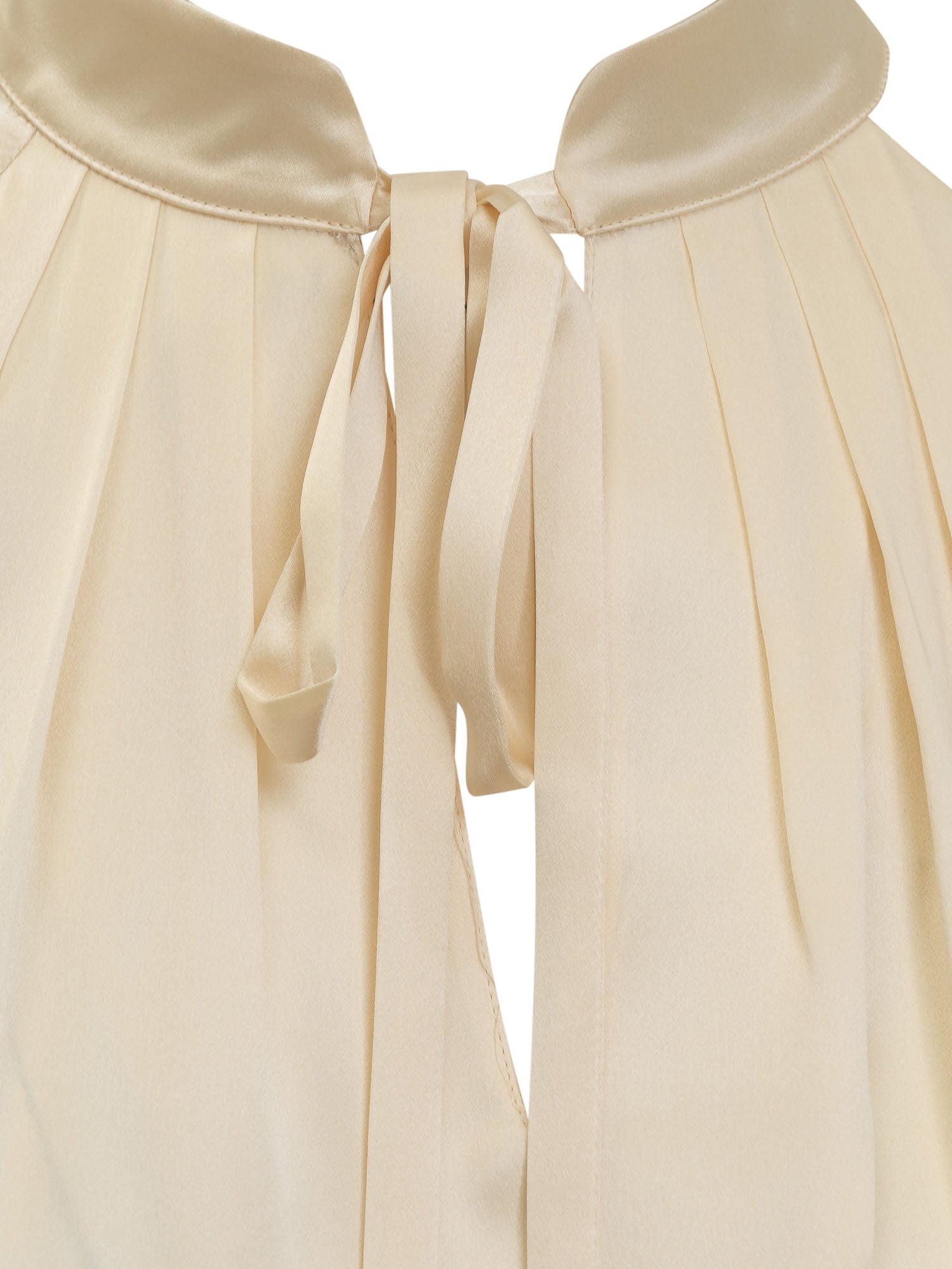 Long sleeved blouse. High neck. Front closure with bow. Buttons at the cuffs. Pleated top.