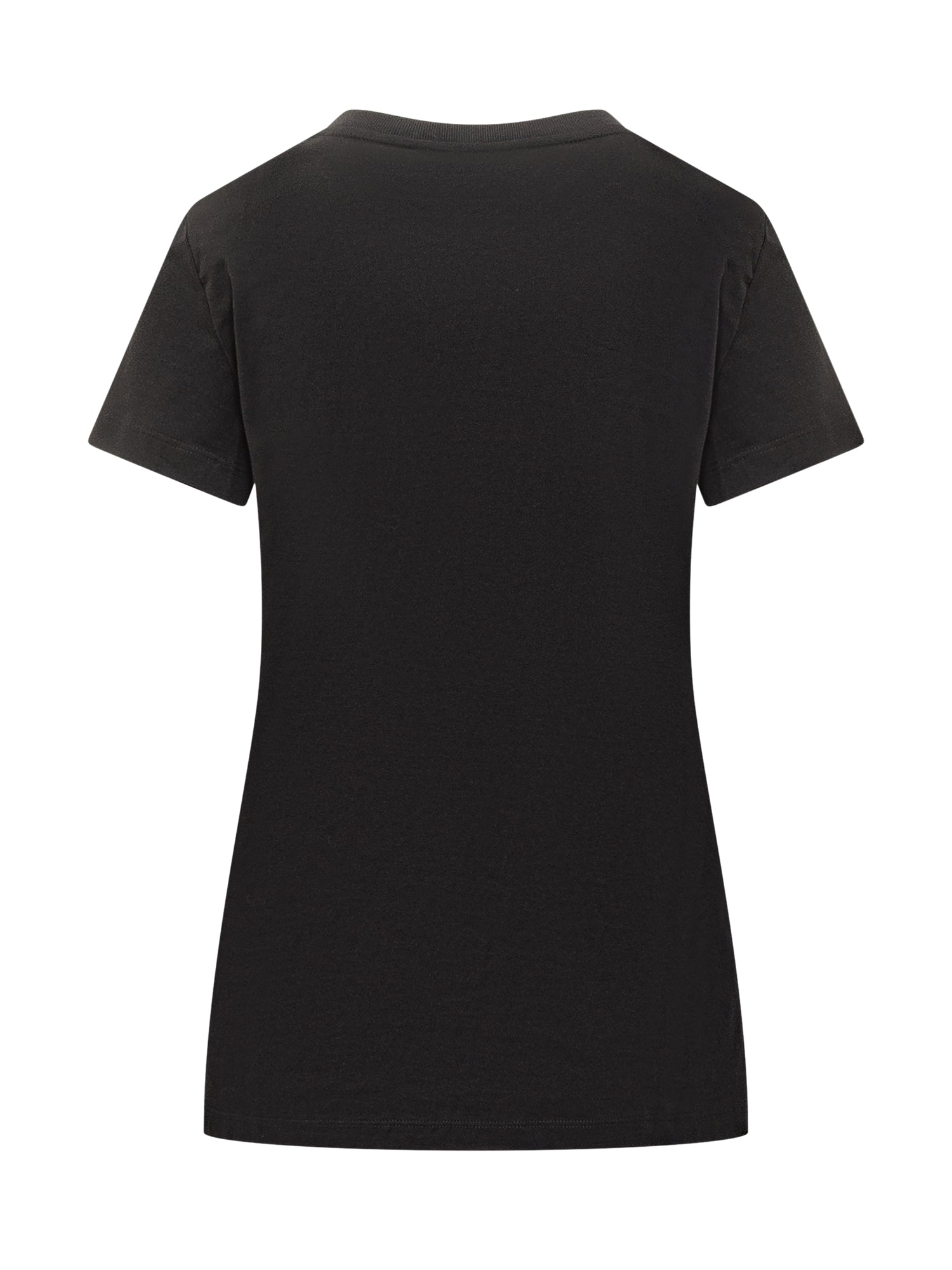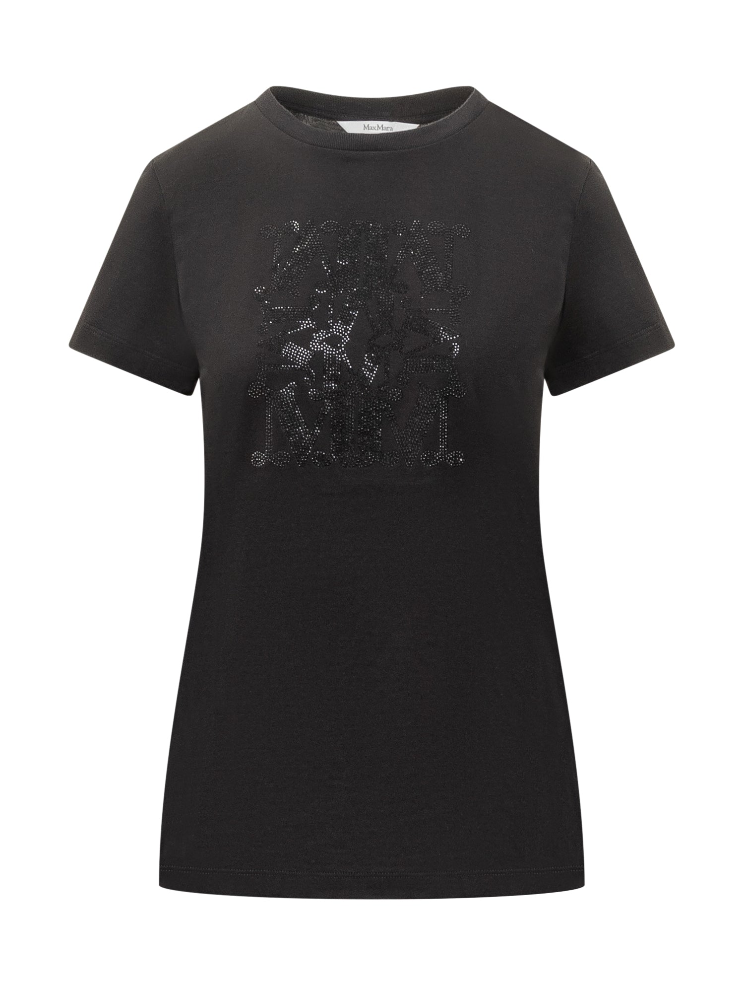 Black cotton T-shirt. Round neck. Logo with applied rhinestones.