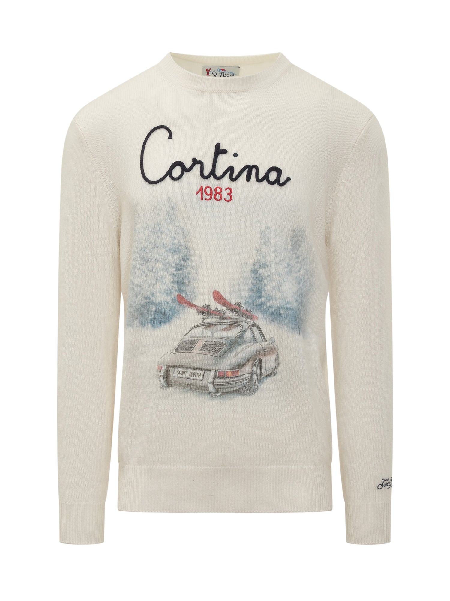 St. Barth white cotton sweater featuring Cortina 1983 graphic and vintage car print in the snow.