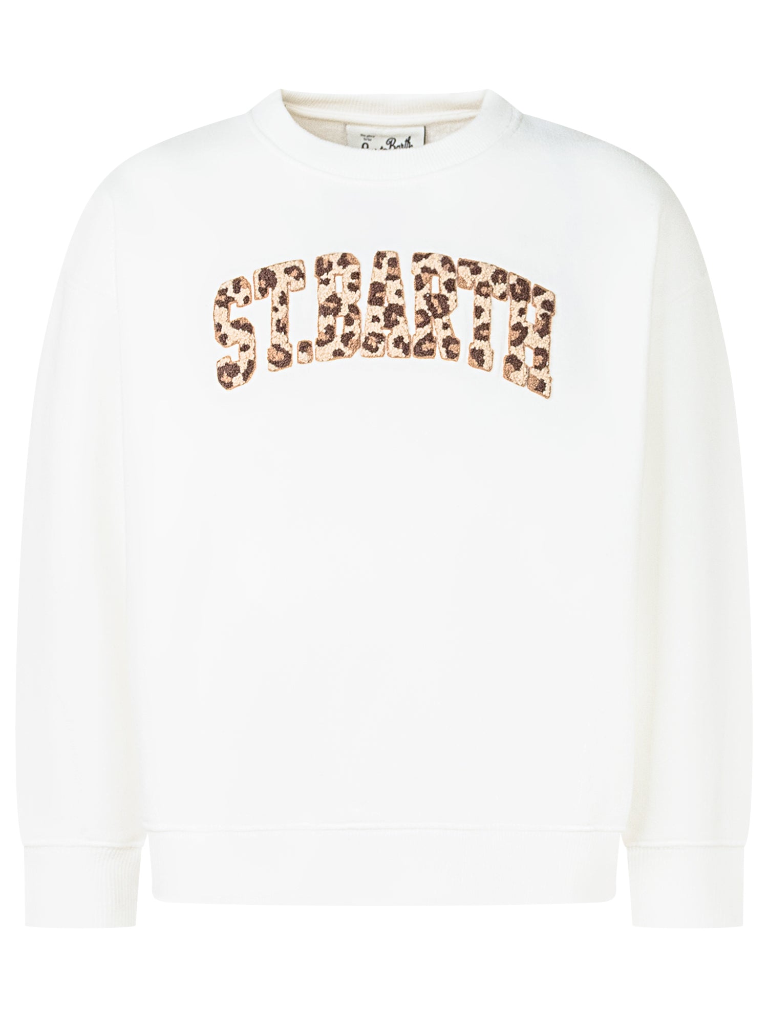 MC2 Saint Barth Kids crewneck sweatshirt in white cotton with St. Barth lettering in leopard print.