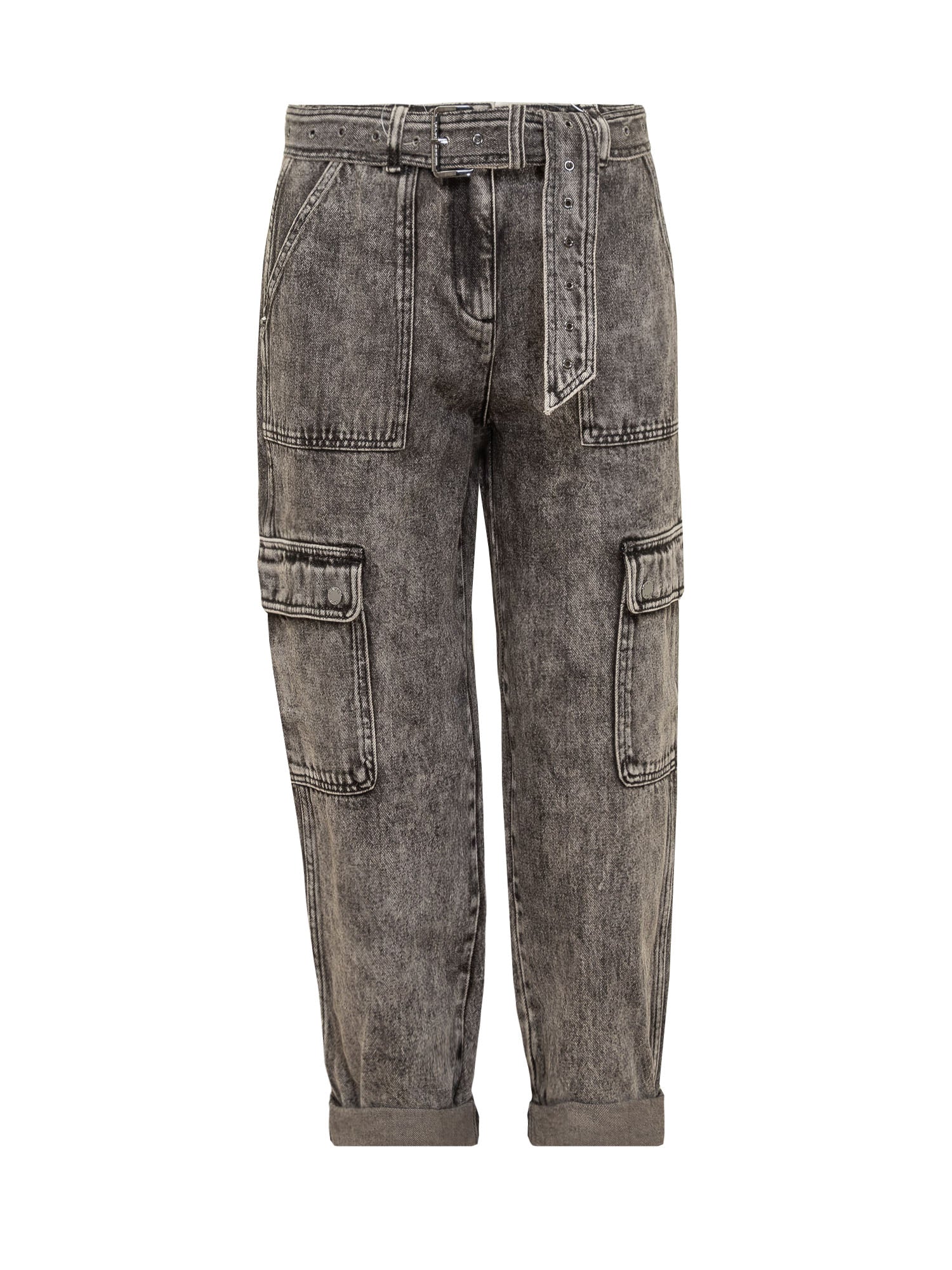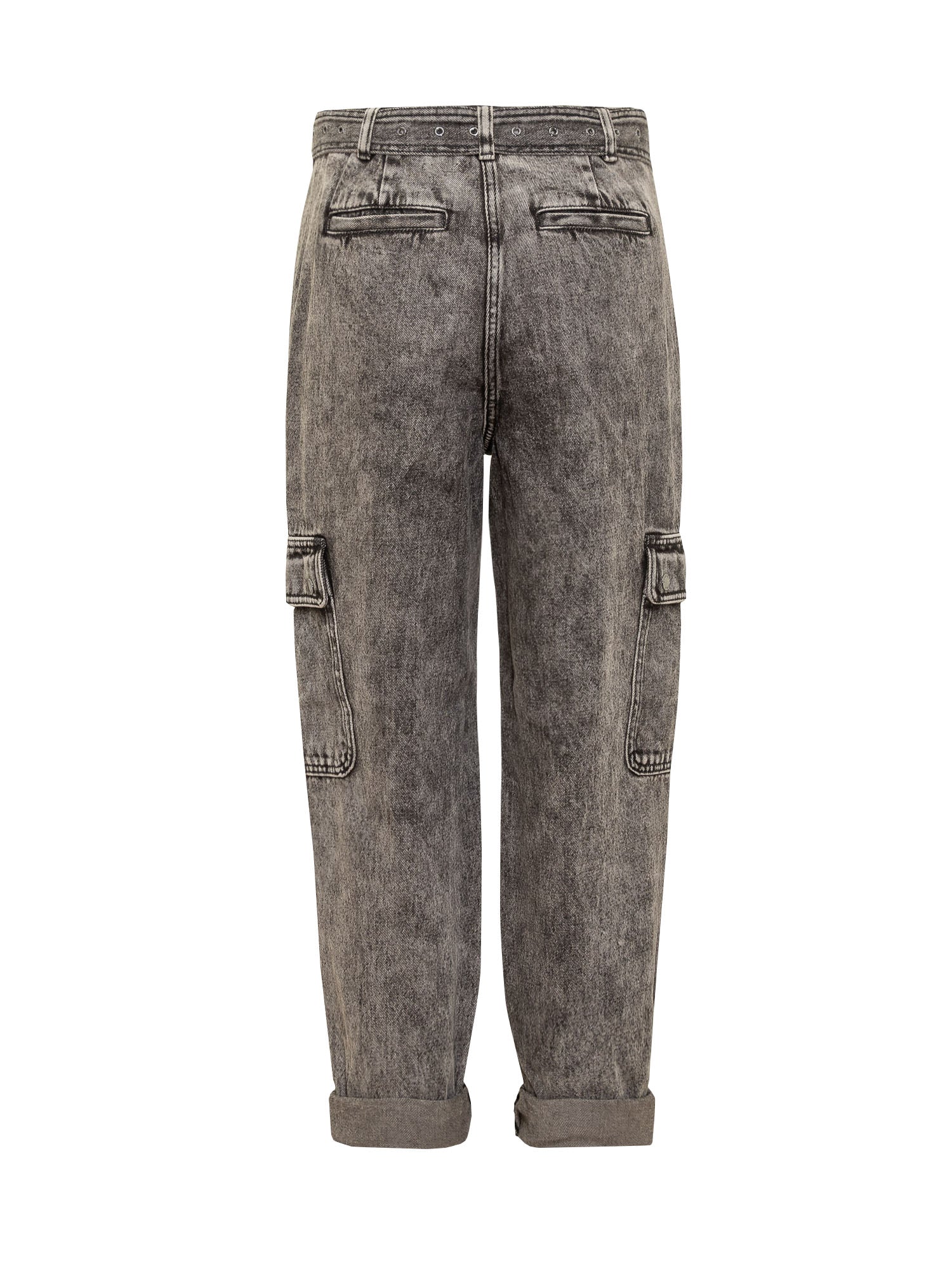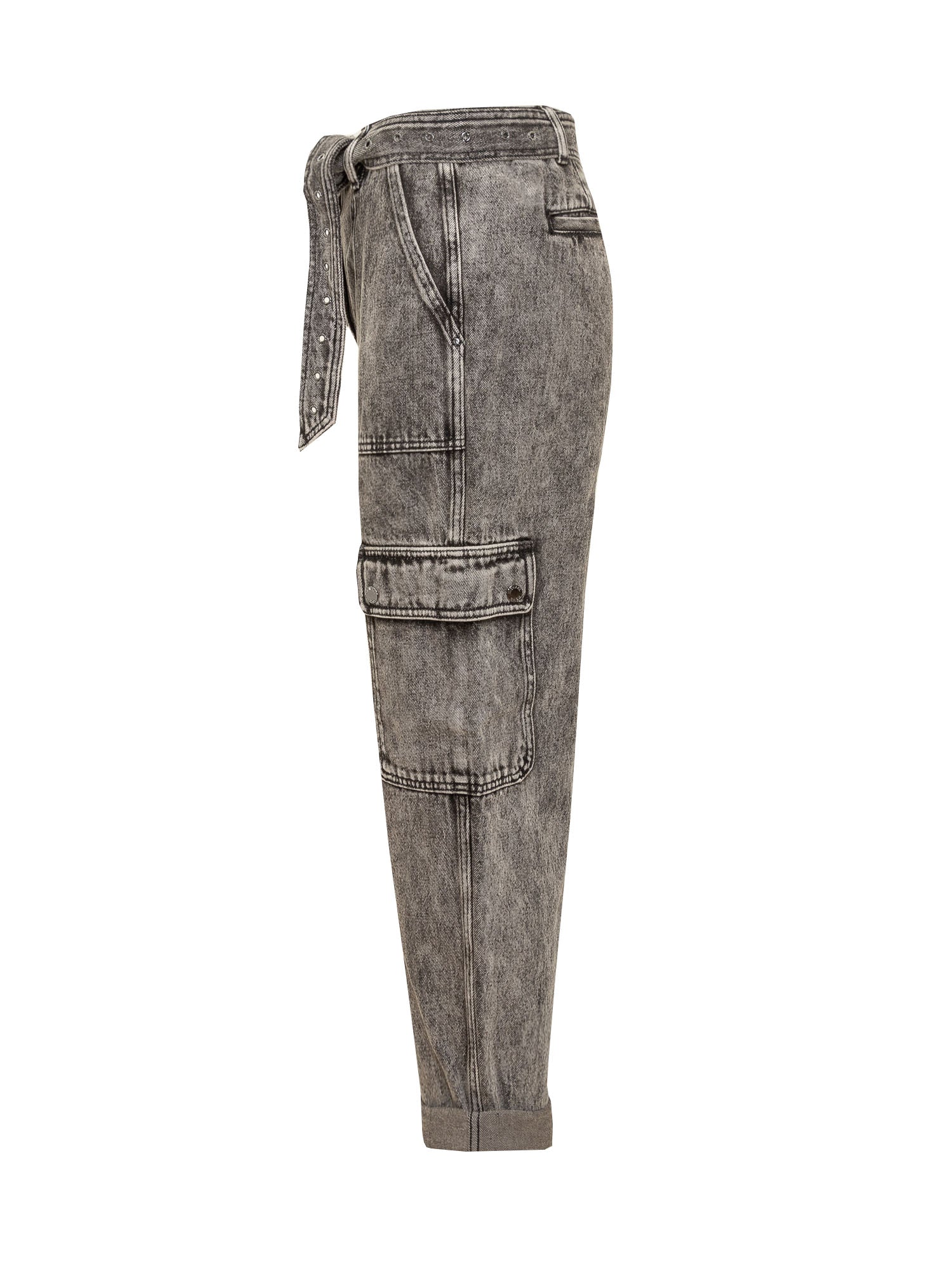 Denim fabric cargo trouser. Button, zipper and belt closure. Wide leg. Patch pockets at hips. Patch pockets with flap and buttons. Welt pockets at back.