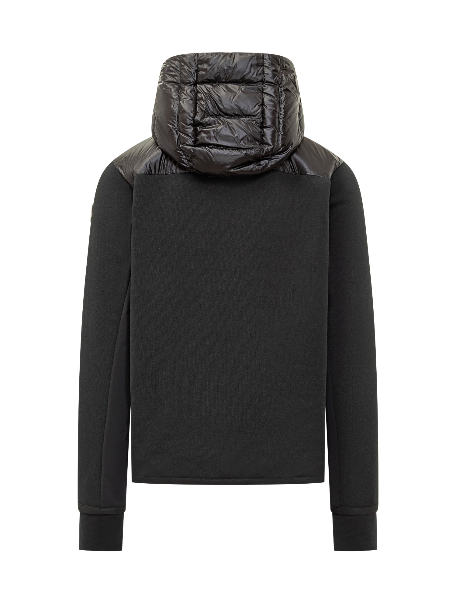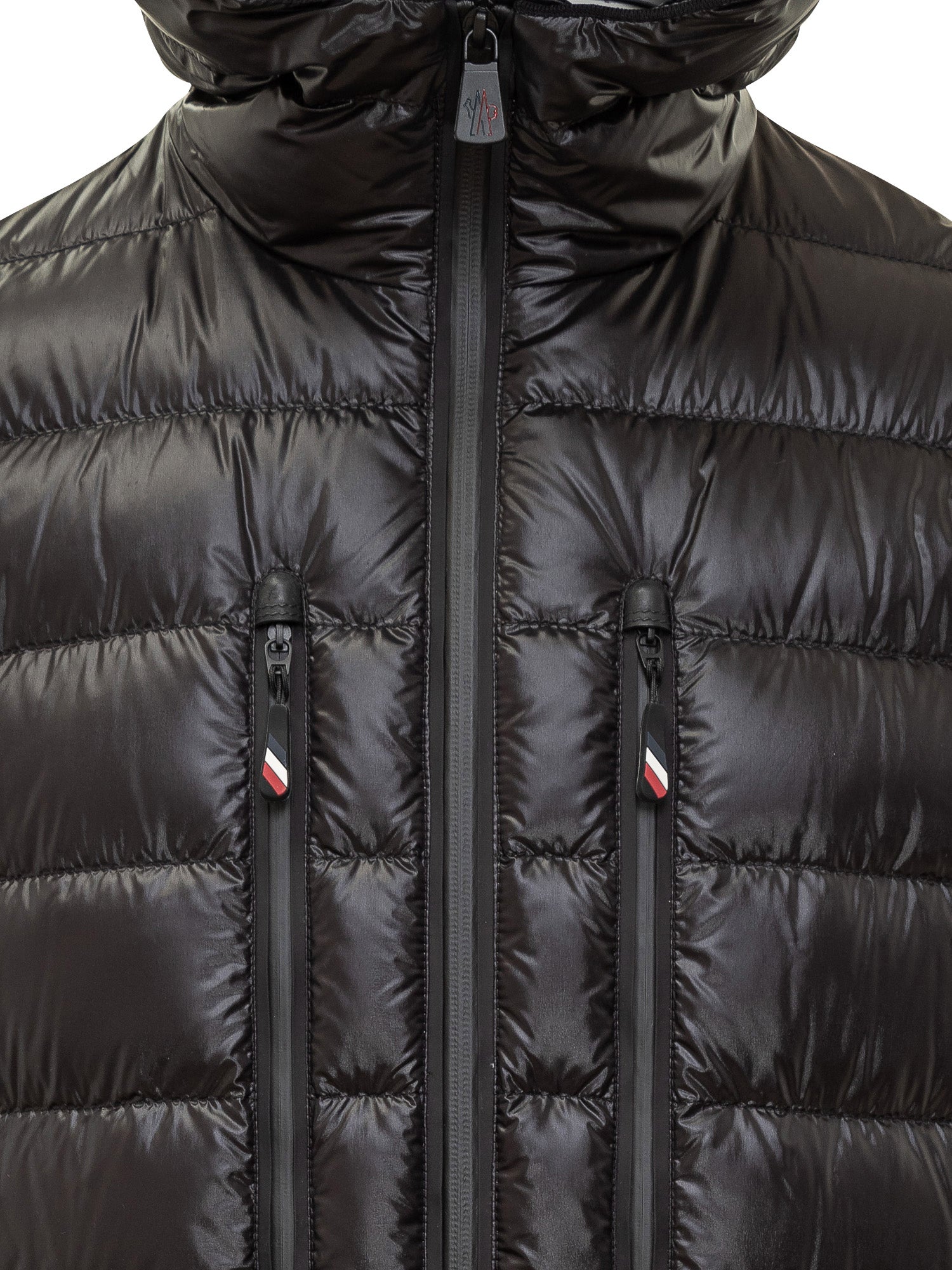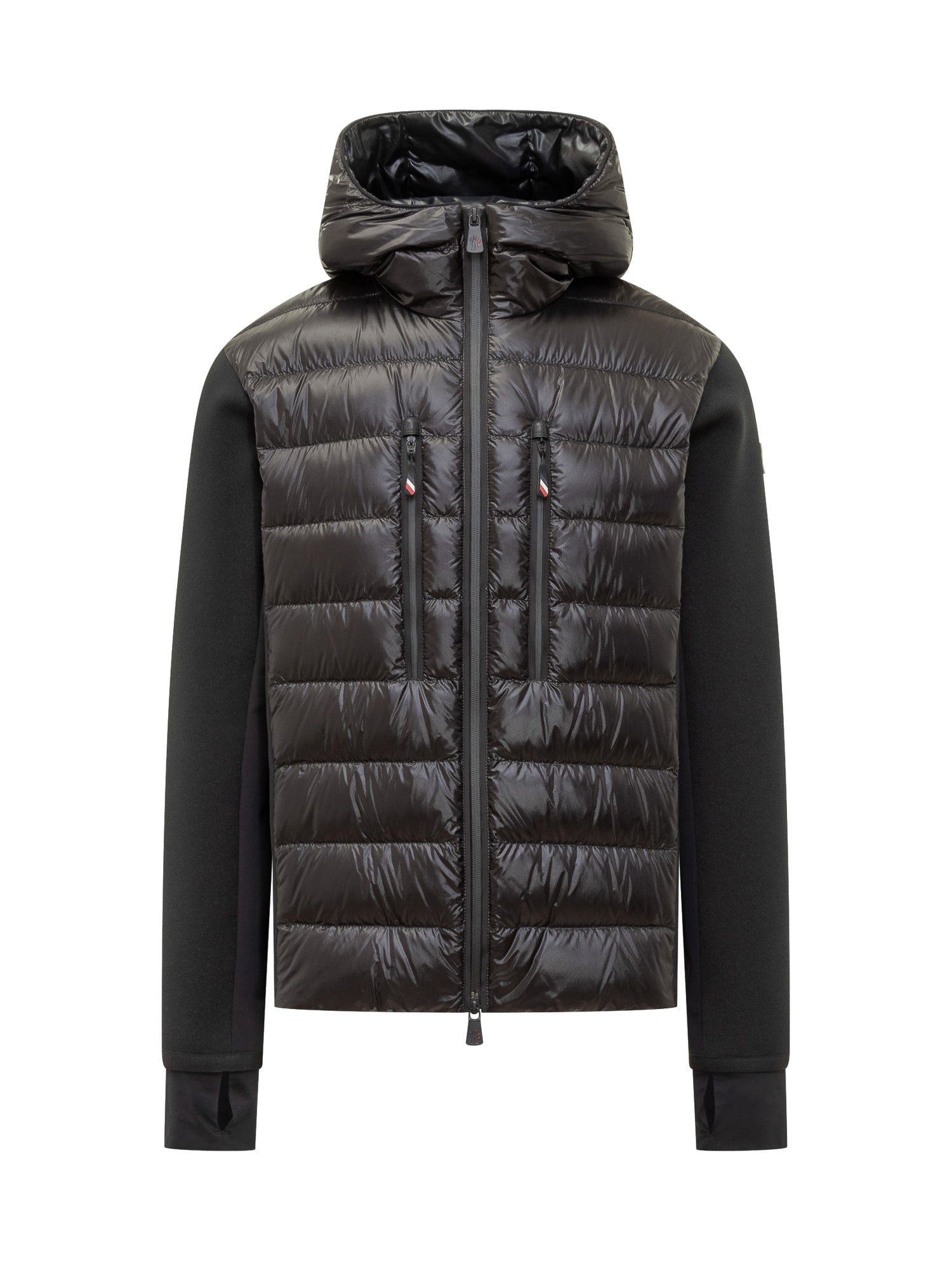 Moncler Grenoble jacket in black technical fabric and shiny nylon with down padding and hood. Featuring front zip and vertical pockets.
