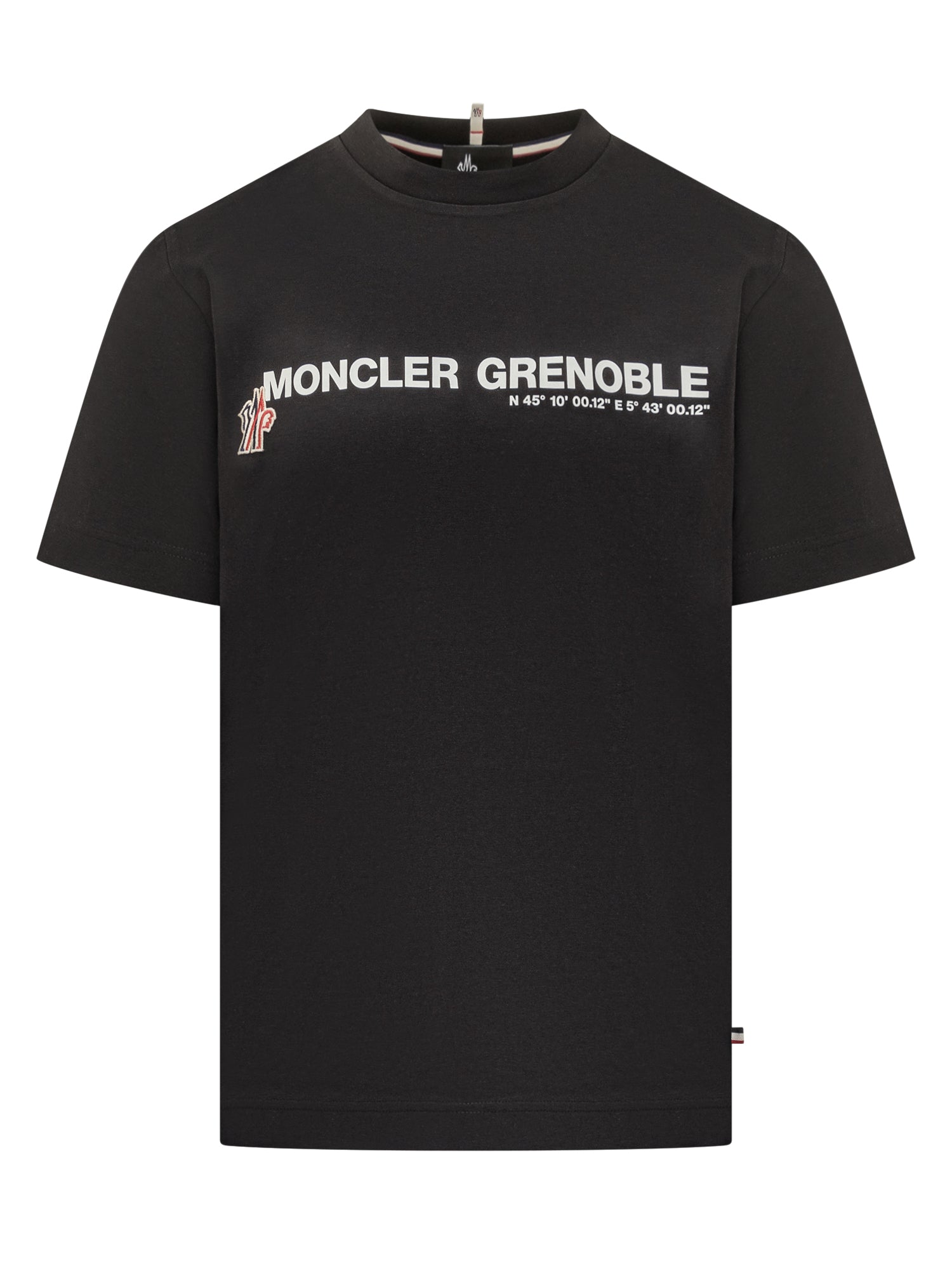 Moncler Grenoble men s T-shirt in black cotton with contrasting front logo and printed coordinates. Regular fit.