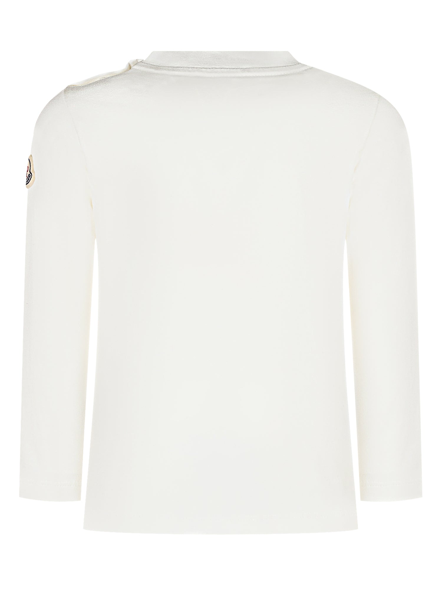White long-sleeve T-shirt with pocket and embroidered bear, chest logo, and shoulder button closure.