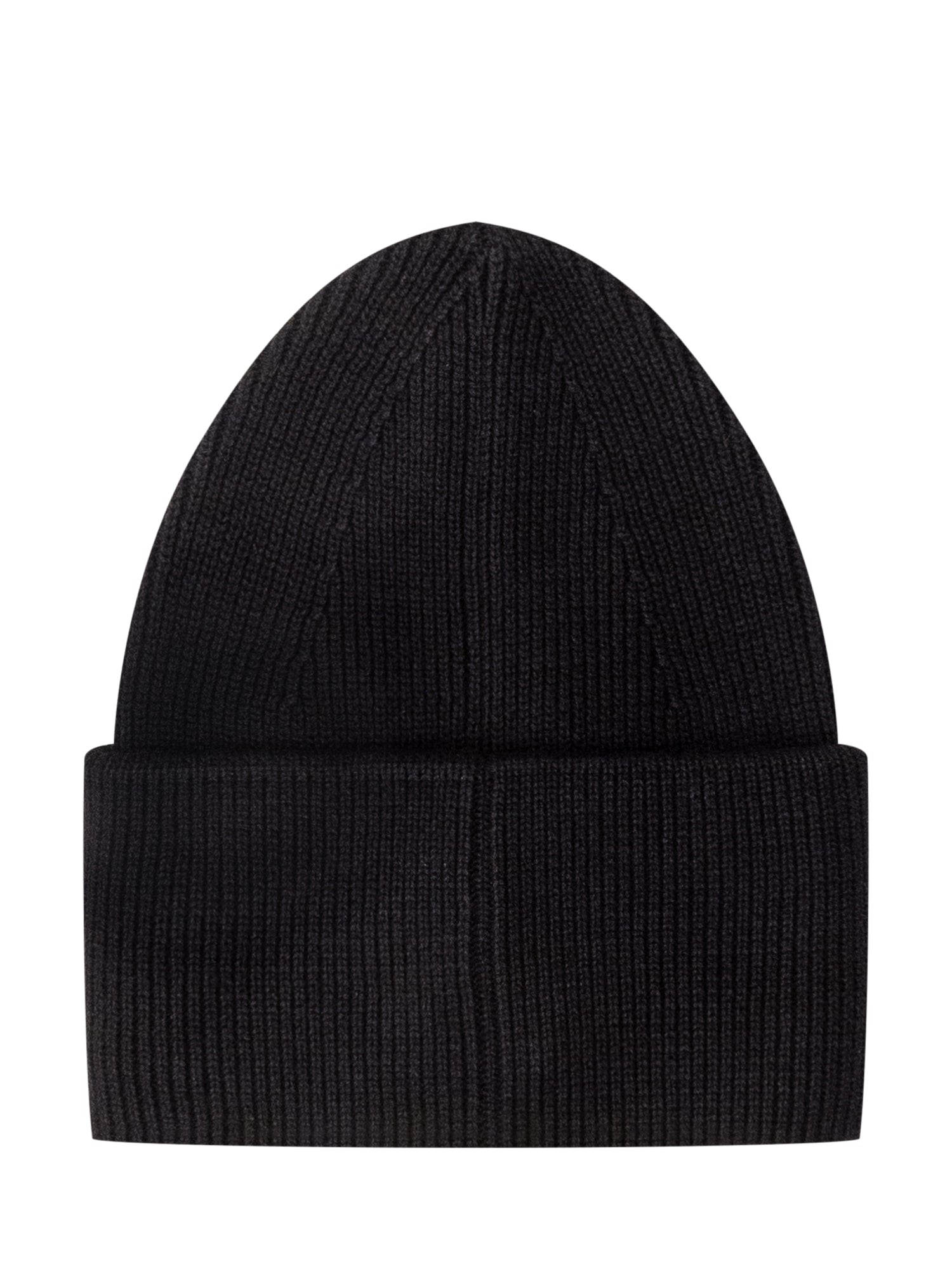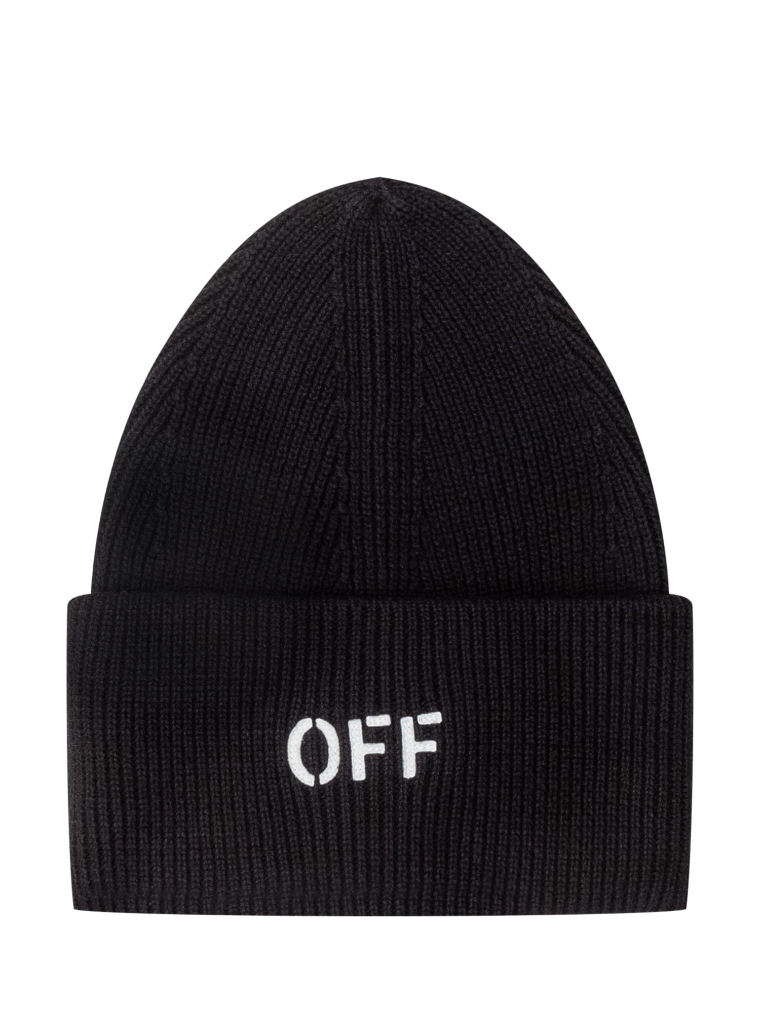 Off-White black wool knit beanie with turn-up cuff and contrasting white logo.