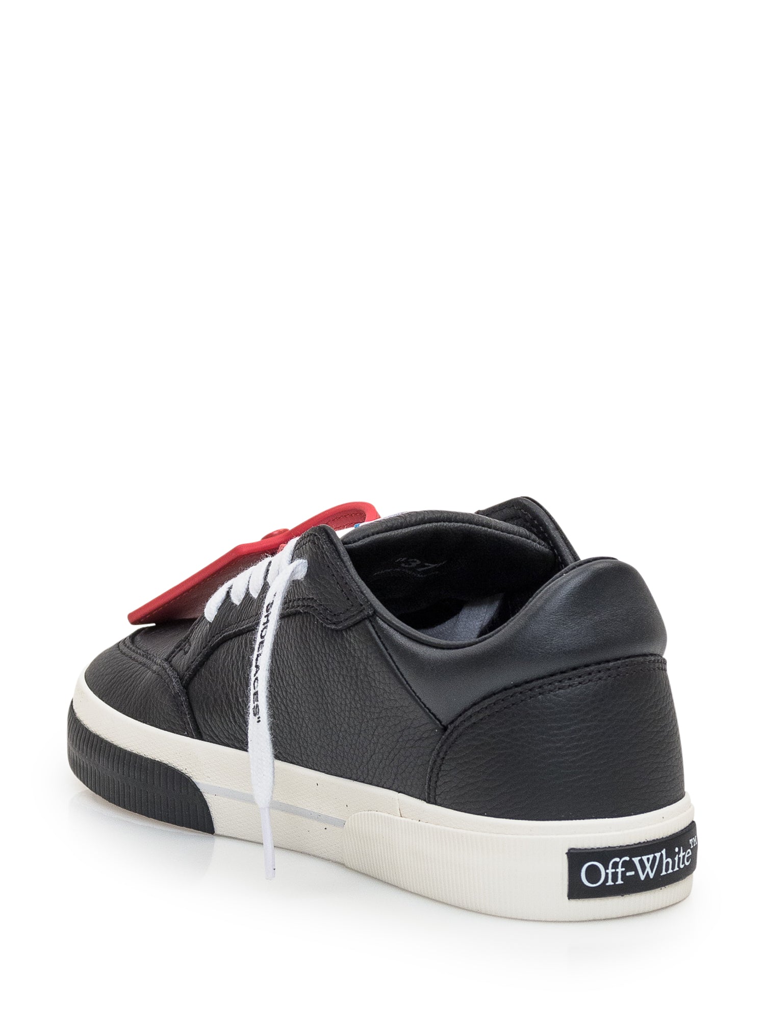 Black low top sneakers. Lace-up front. Leather detail at heel. Embroidered arrow-shaped logo. Leather tag on tongue. Logo on heel. Vulcanized rubber outsole.
